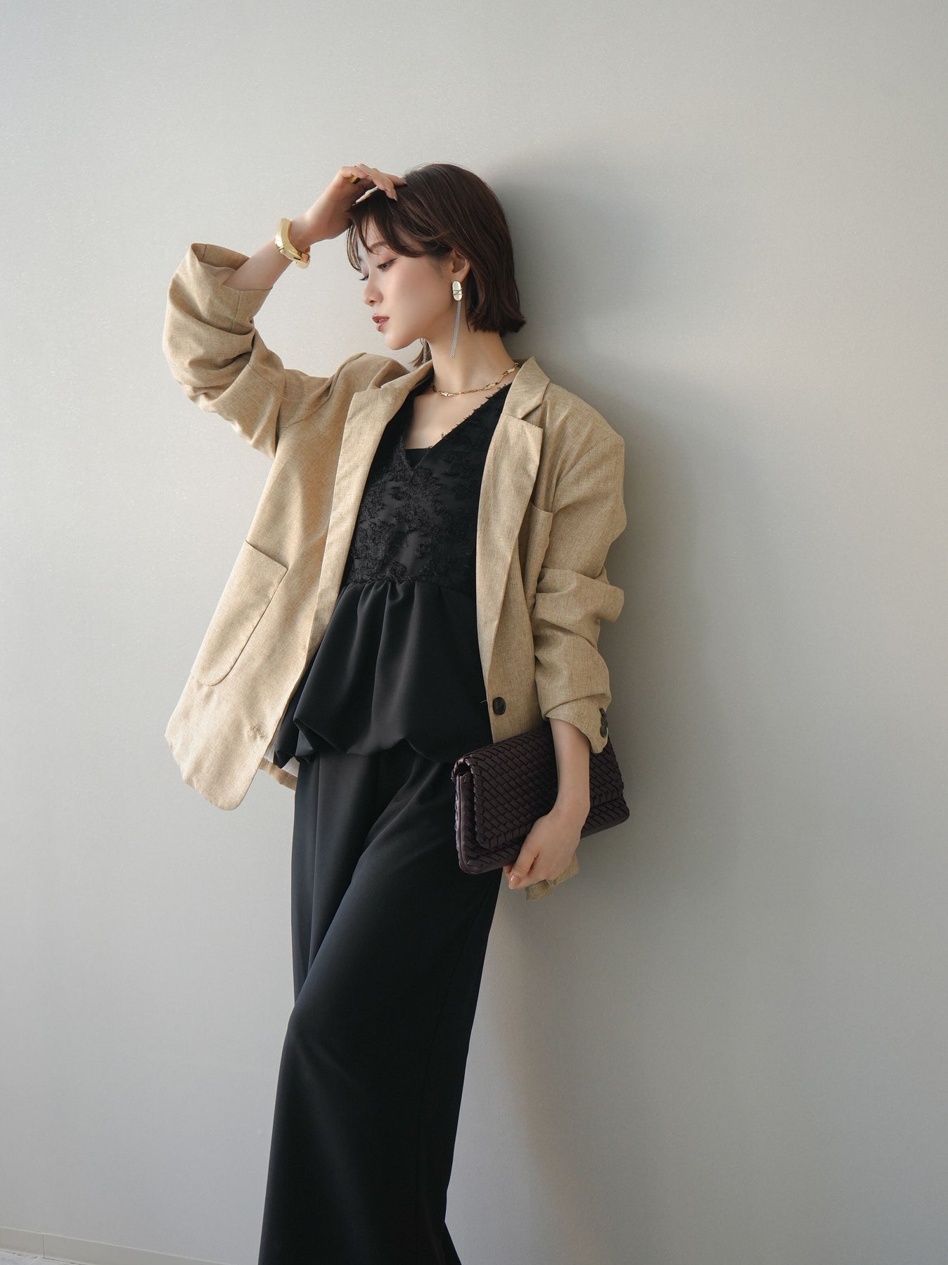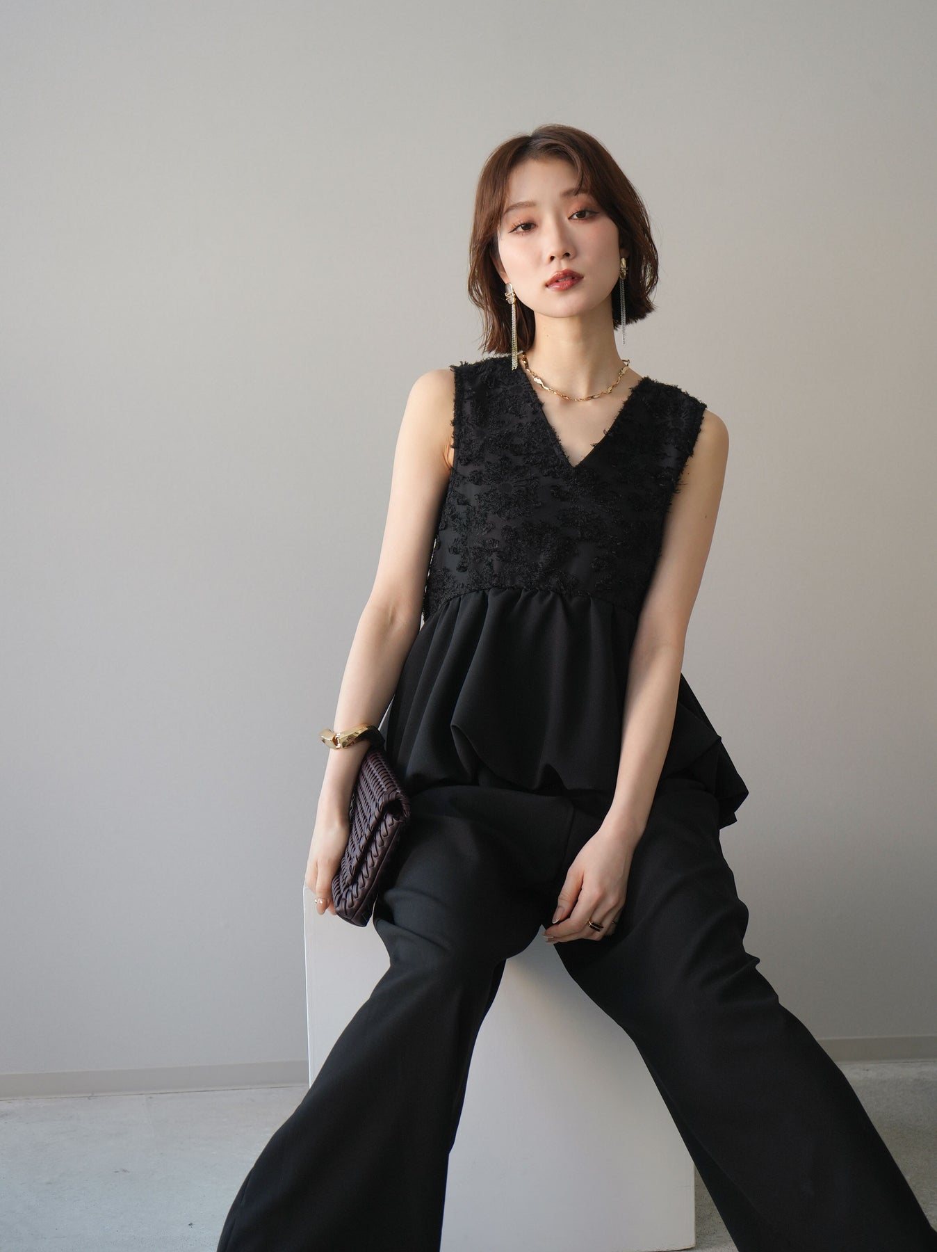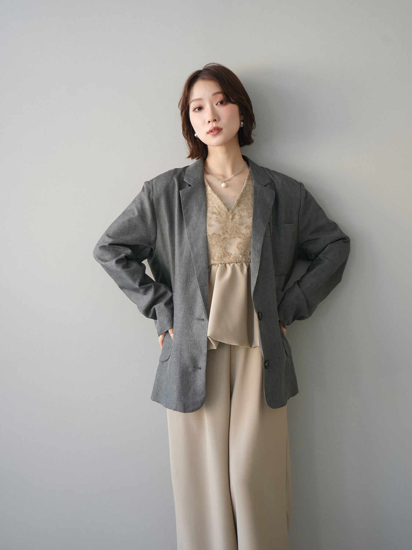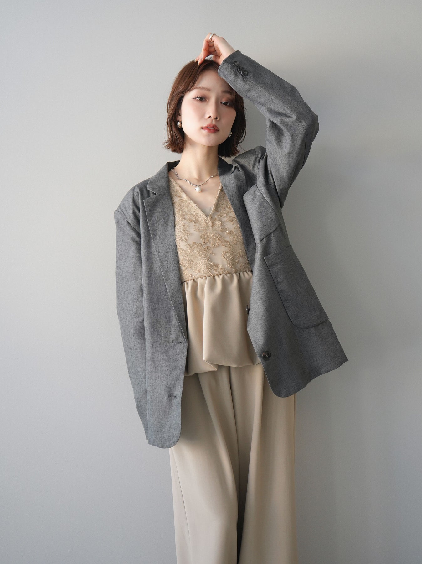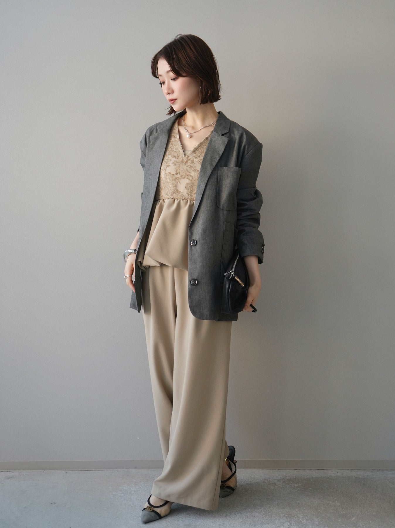 立体感のあるジャガードレースと、なめらかな素材をドッキングしたサロペット。上身頃は繊細なレースが華やかさを演出し、ウエスト切替のぺプラムデザインが自然なメリハリをプラスします。落ち感のあるワイドシルエットで縦ラインを強調し、きれいめながらもリラックス感のある着こなしに。一枚でコーデが完成し、オケージョンからデイリーまで幅広く活躍するアイテムです。 ※ボトムス、キャミソール(インナー)以外の商品は一律でインナーは付属していません