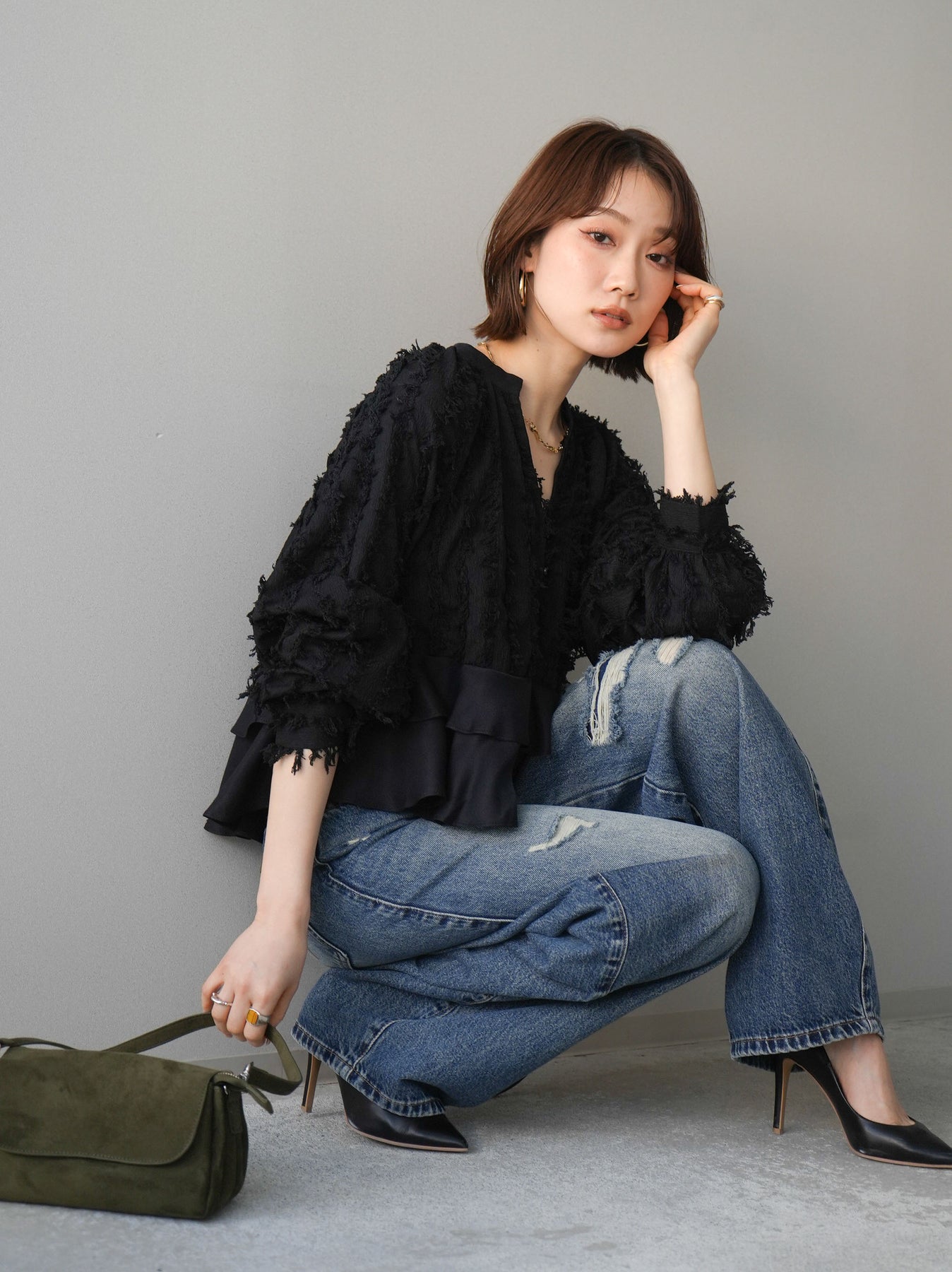 立体感のあるジャガード素材が印象的なトップス。表情豊かな生地感に、ウエスト切替の裾フリルが加わることで、メリハリのある女性らしいシルエットを演出します。Vネックデザインが顔まわりをすっきり見せ、甘さの中にも程よい抜け感をプラス。デニムと合わせてカジュアルダウンしたり、スラックスやタイトスカートと合わせてきれいめにまとめたりと、幅広いスタイリングが楽しめる一着です。