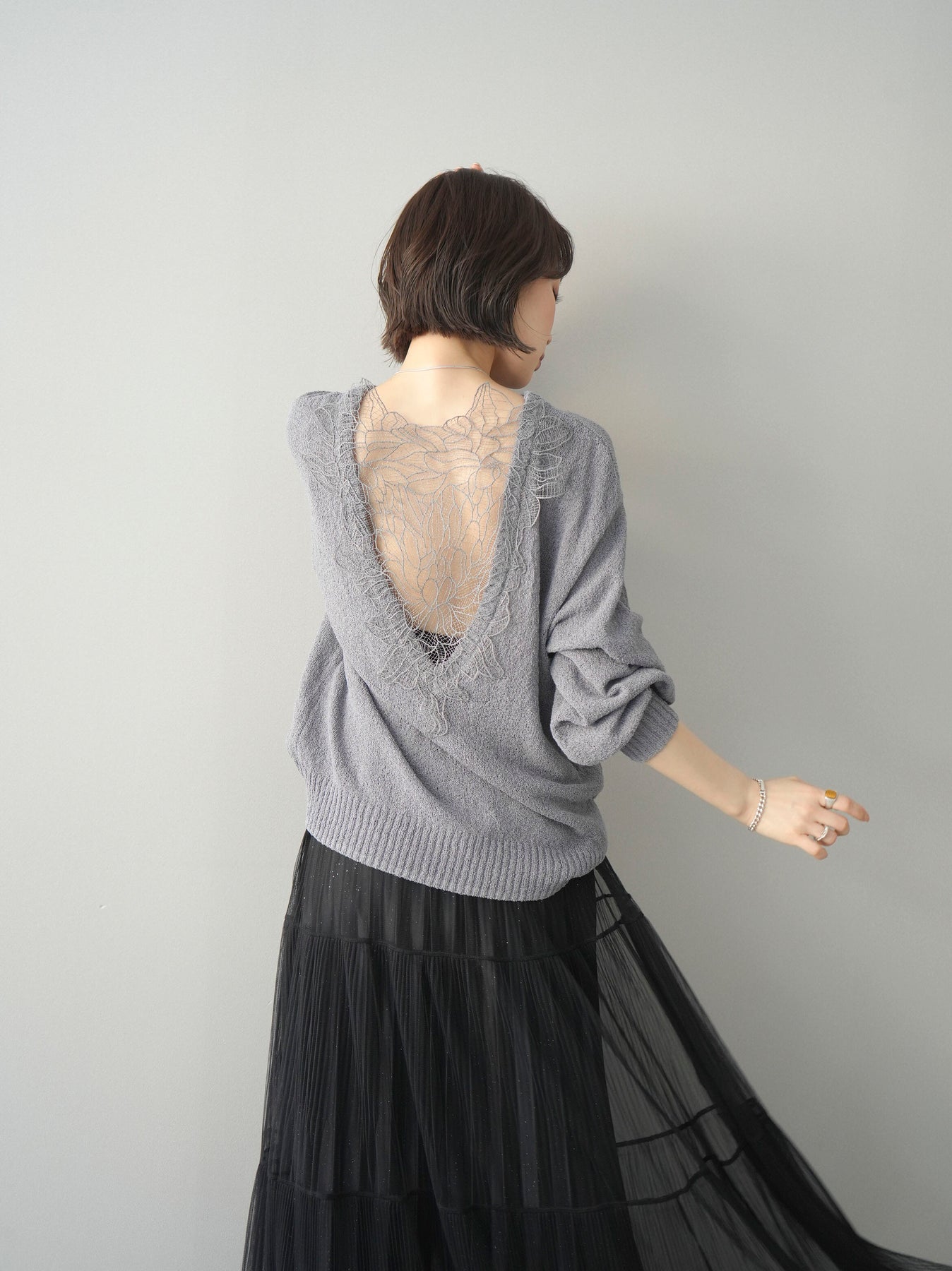 バックスタイルにシアー素材とフラワーレースをあしらった、印象的なニットプルオーバー。フロントはシンプルに仕上げつつ、後ろ姿でさりげなく華やかさを演出するデザインが魅力です。程よくゆとりのあるシルエットでリラックス感がありながらも、裾と袖口のリブが全体を引き締め、バランスの取れた着こなしに。やわらかなニット素材で着心地も良く、デイリーに取り入れやすい一枚です。デニムやワイドパンツと合わせたカジュアルスタイルはもちろん、スカートと合わせた女性らしいコーディネートもおすすめ。後ろ姿まで抜かりない、大人のためのデザインニットです。 ※ボトムス、キャミソール(インナー)以外の商品は一律でインナーは付属していません。