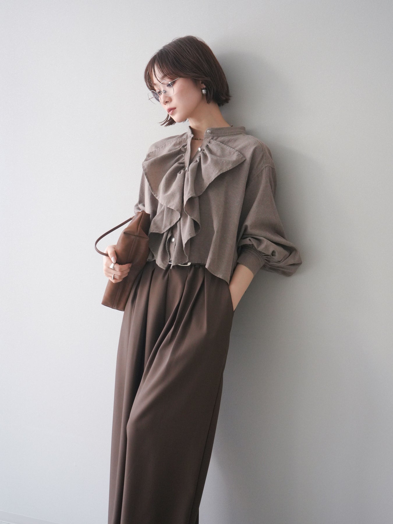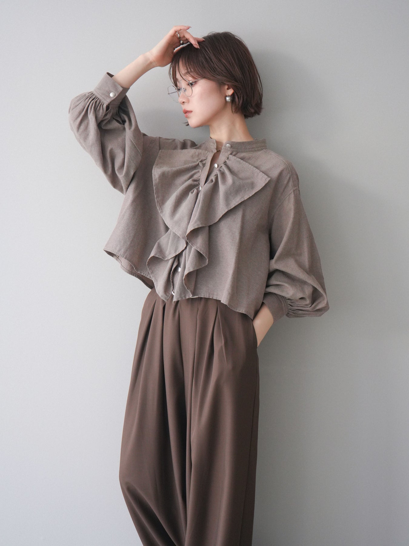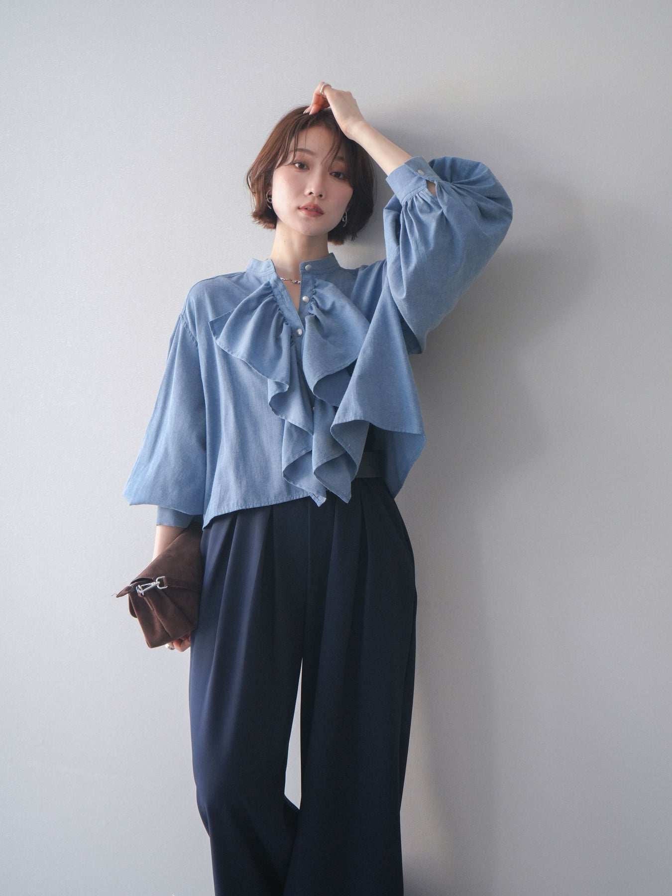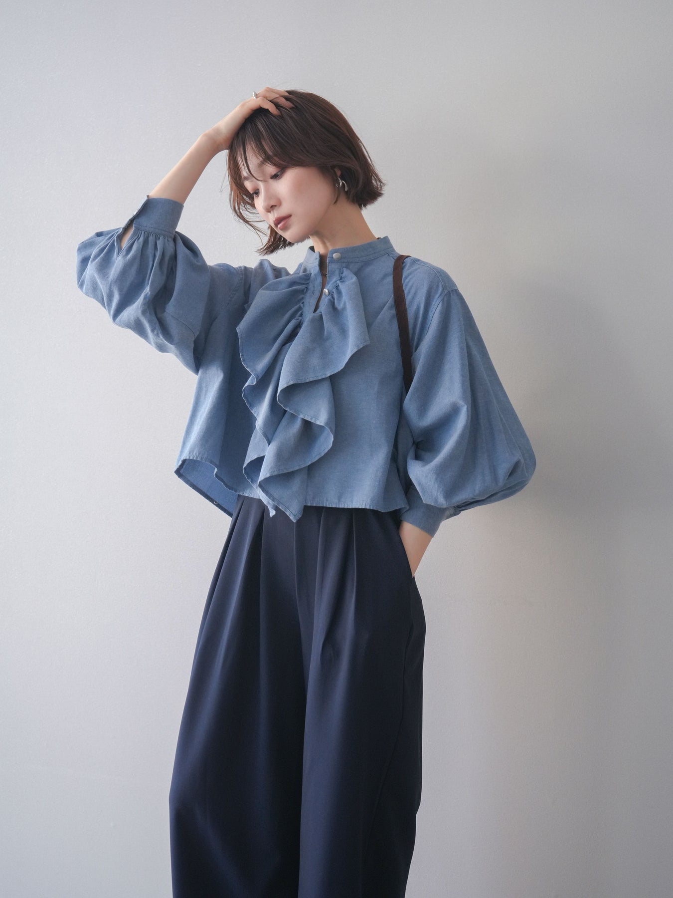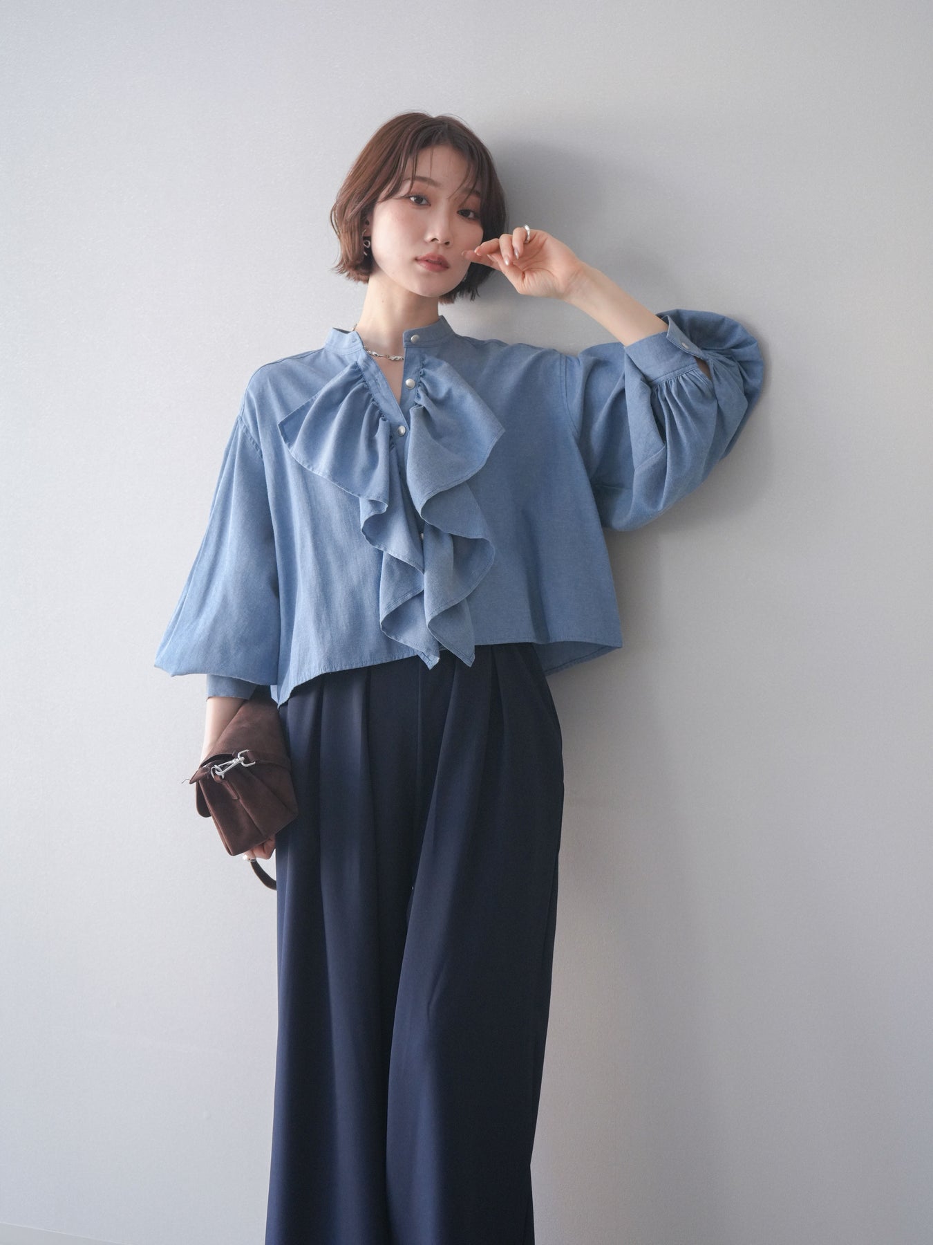 存在感のあるラッフルデザインが目を惹くショートブラウス。立体的に重なるフレアが動くたびに揺れ、華やかさと女性らしさを演出します。コンパクトな丈感でバランスが取りやすく、ハイウエストボトムやボリュームスカートとも好相性。袖は程よくふんわりとしたシルエットで、メリハリのある着こなしが叶う一枚です。 ※ボトムス、キャミソール(インナー)以外の商品は一律でインナーは付属していません