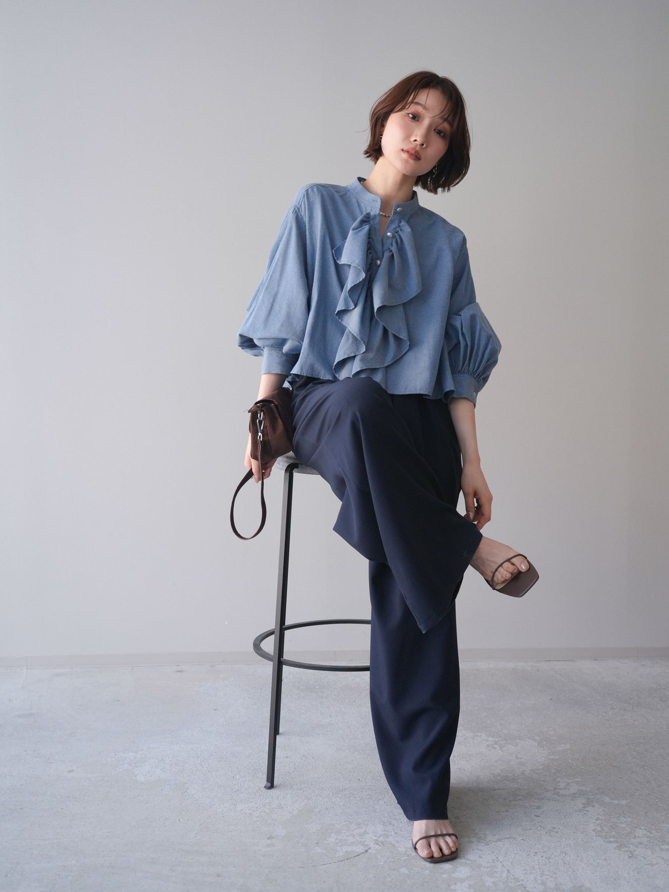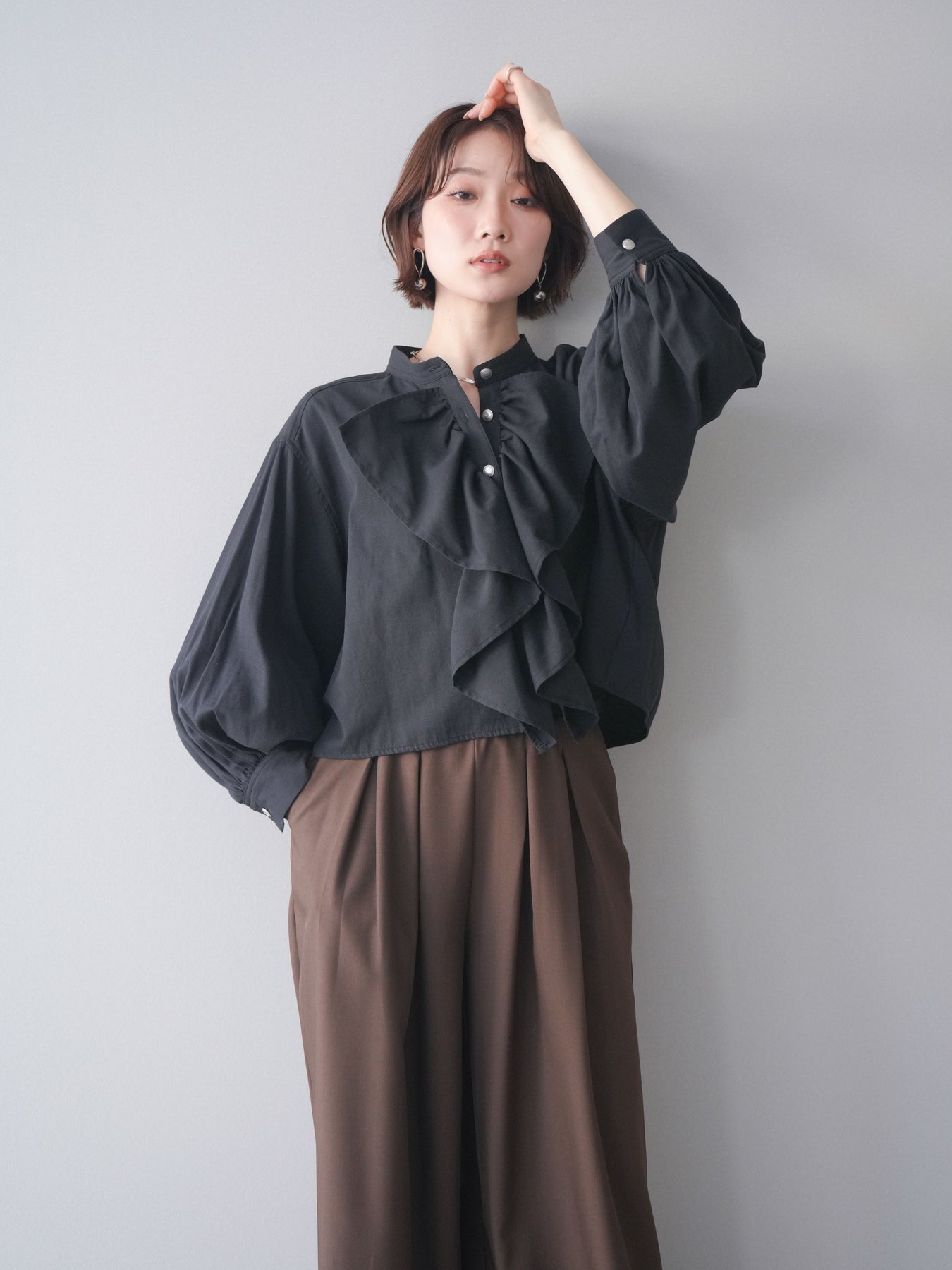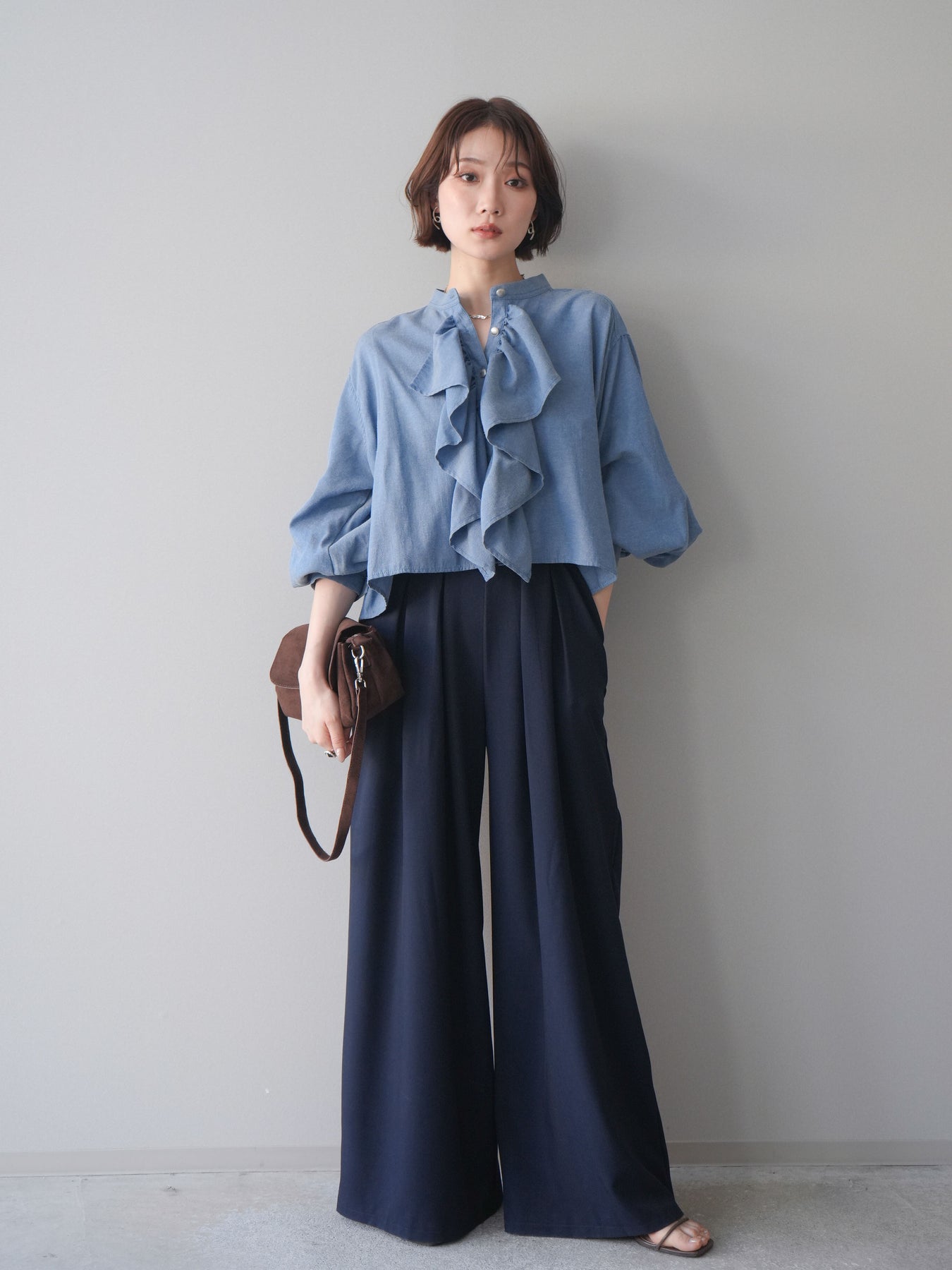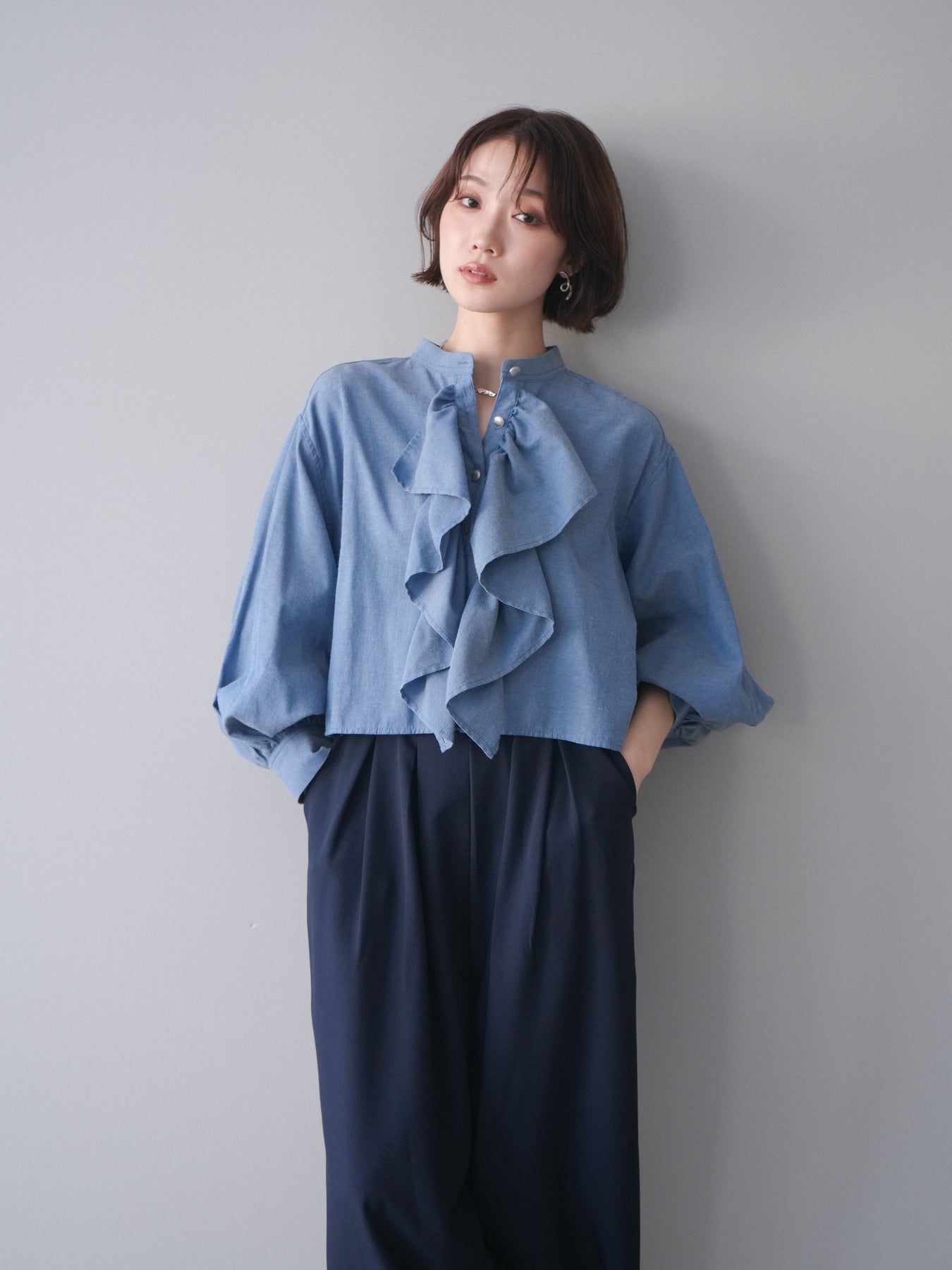 存在感のあるラッフルデザインが目を惹くショートブラウス。立体的に重なるフレアが動くたびに揺れ、華やかさと女性らしさを演出します。コンパクトな丈感でバランスが取りやすく、ハイウエストボトムやボリュームスカートとも好相性。袖は程よくふんわりとしたシルエットで、メリハリのある着こなしが叶う一枚です。 ※ボトムス、キャミソール(インナー)以外の商品は一律でインナーは付属していません