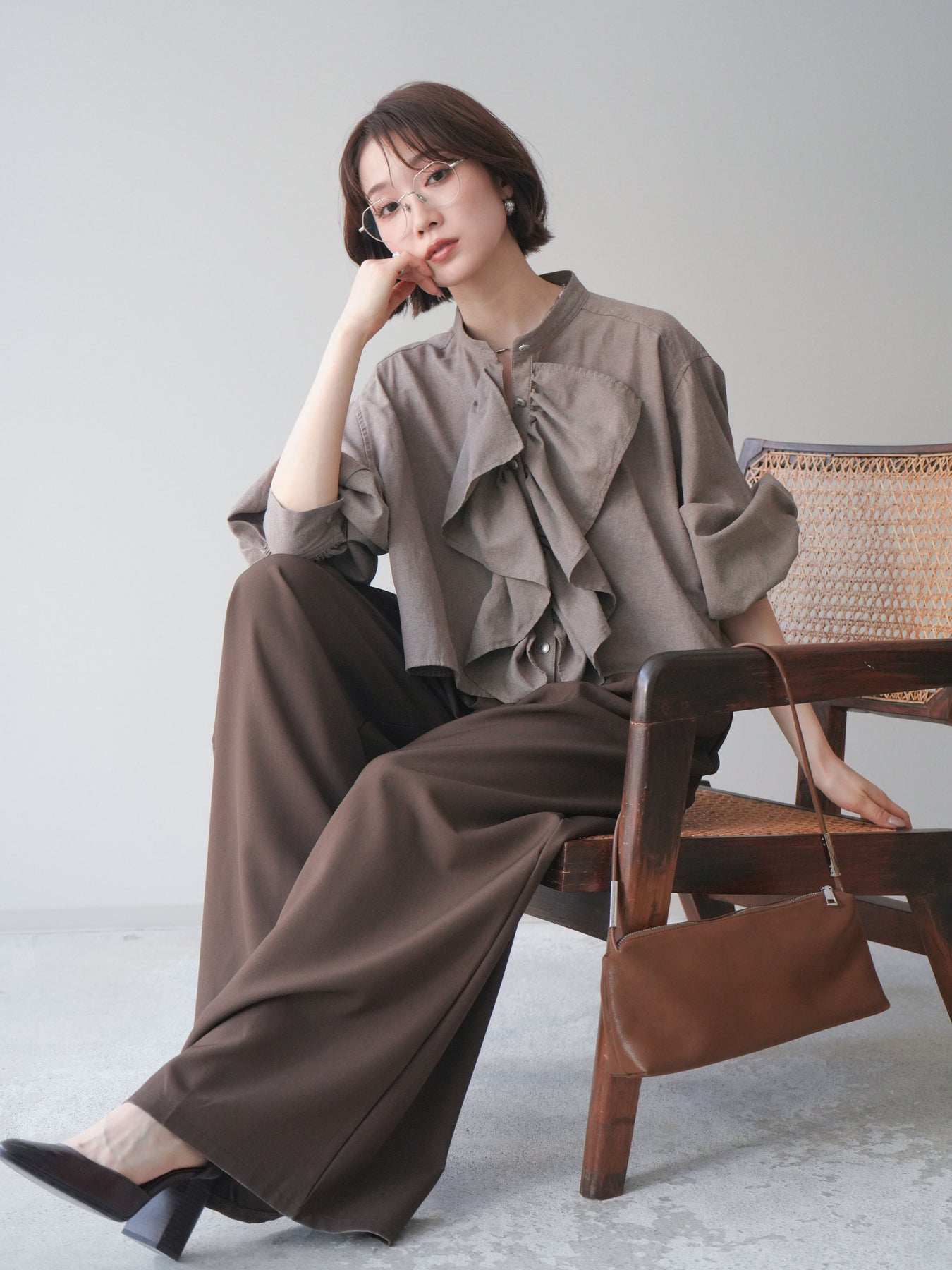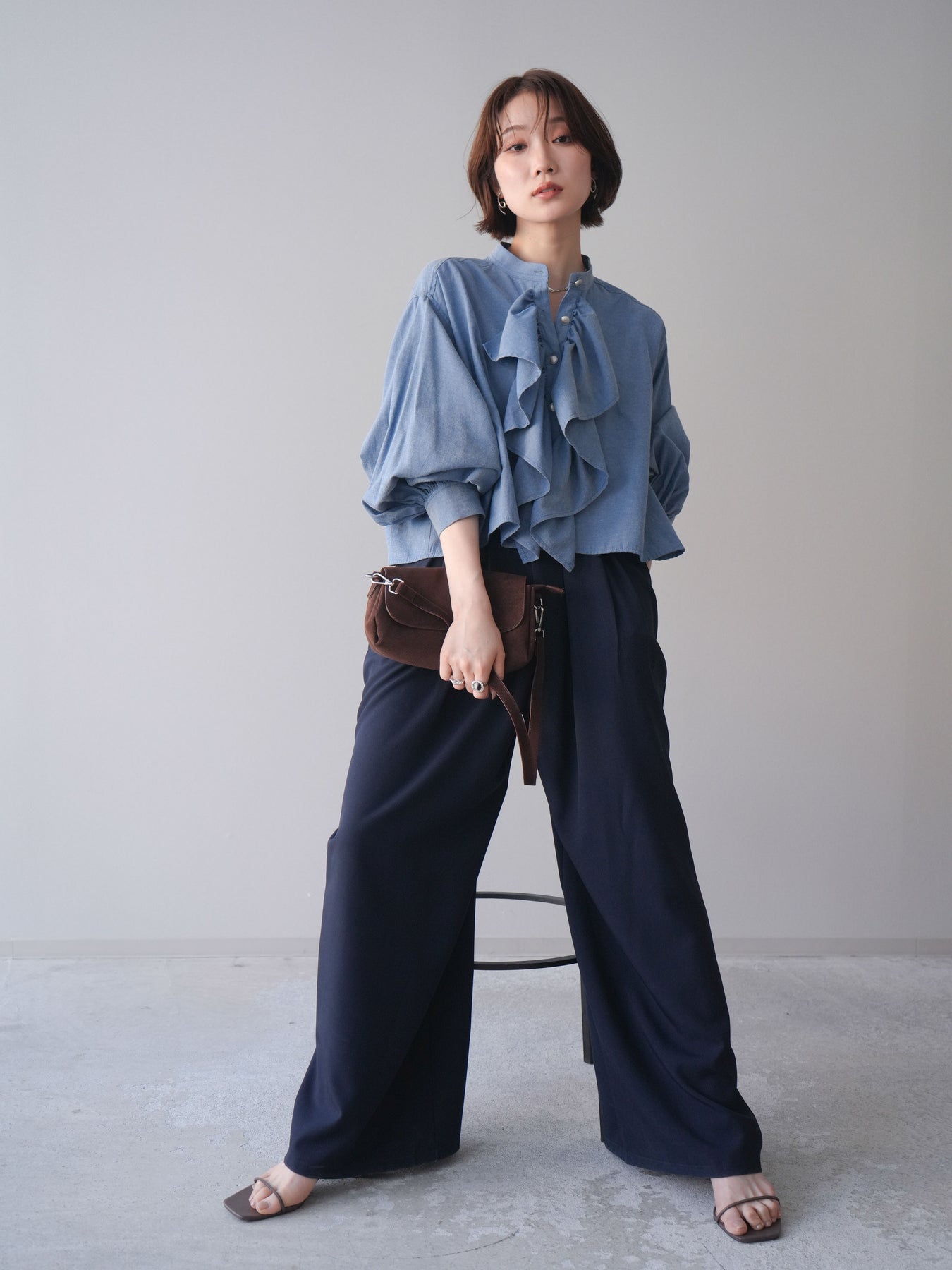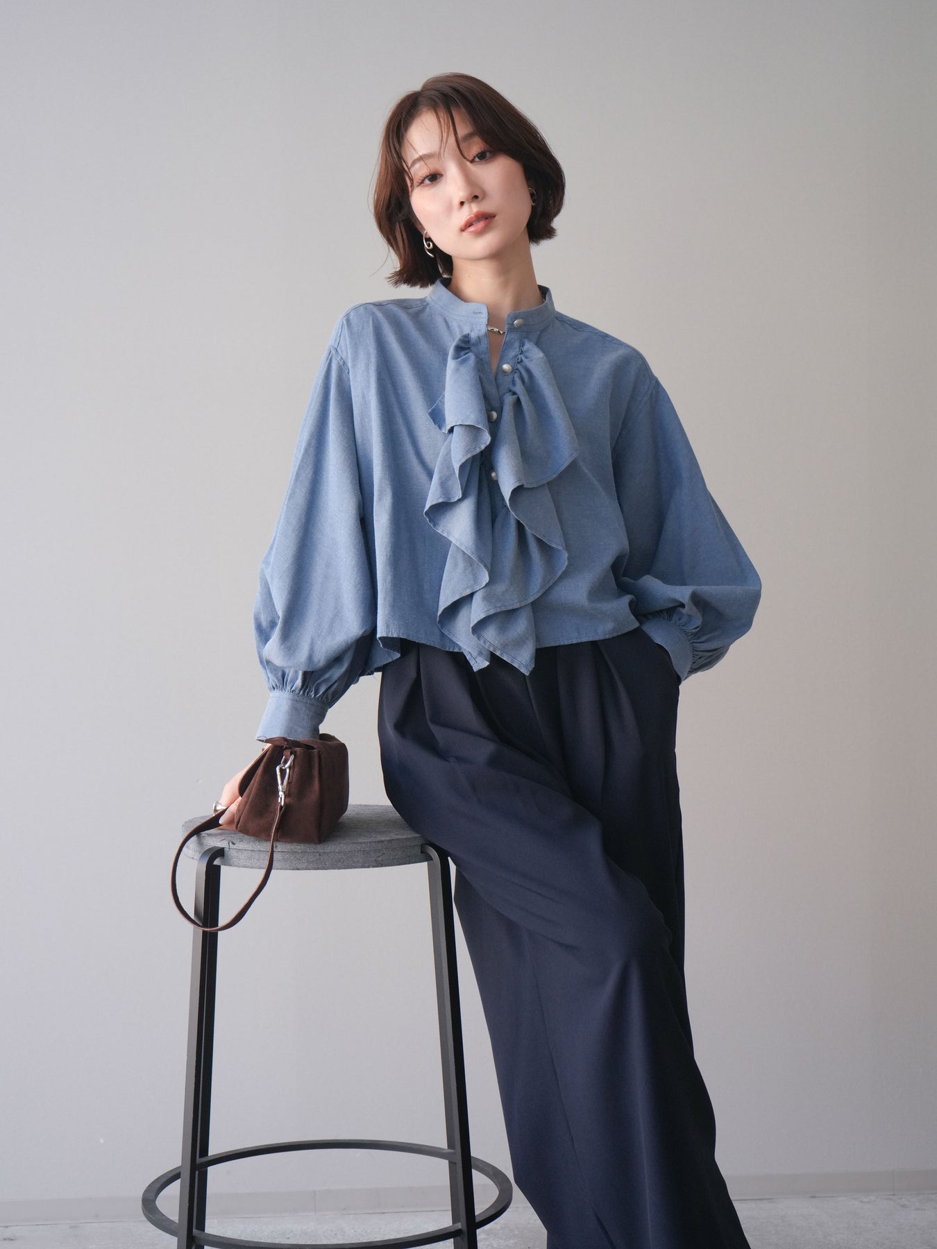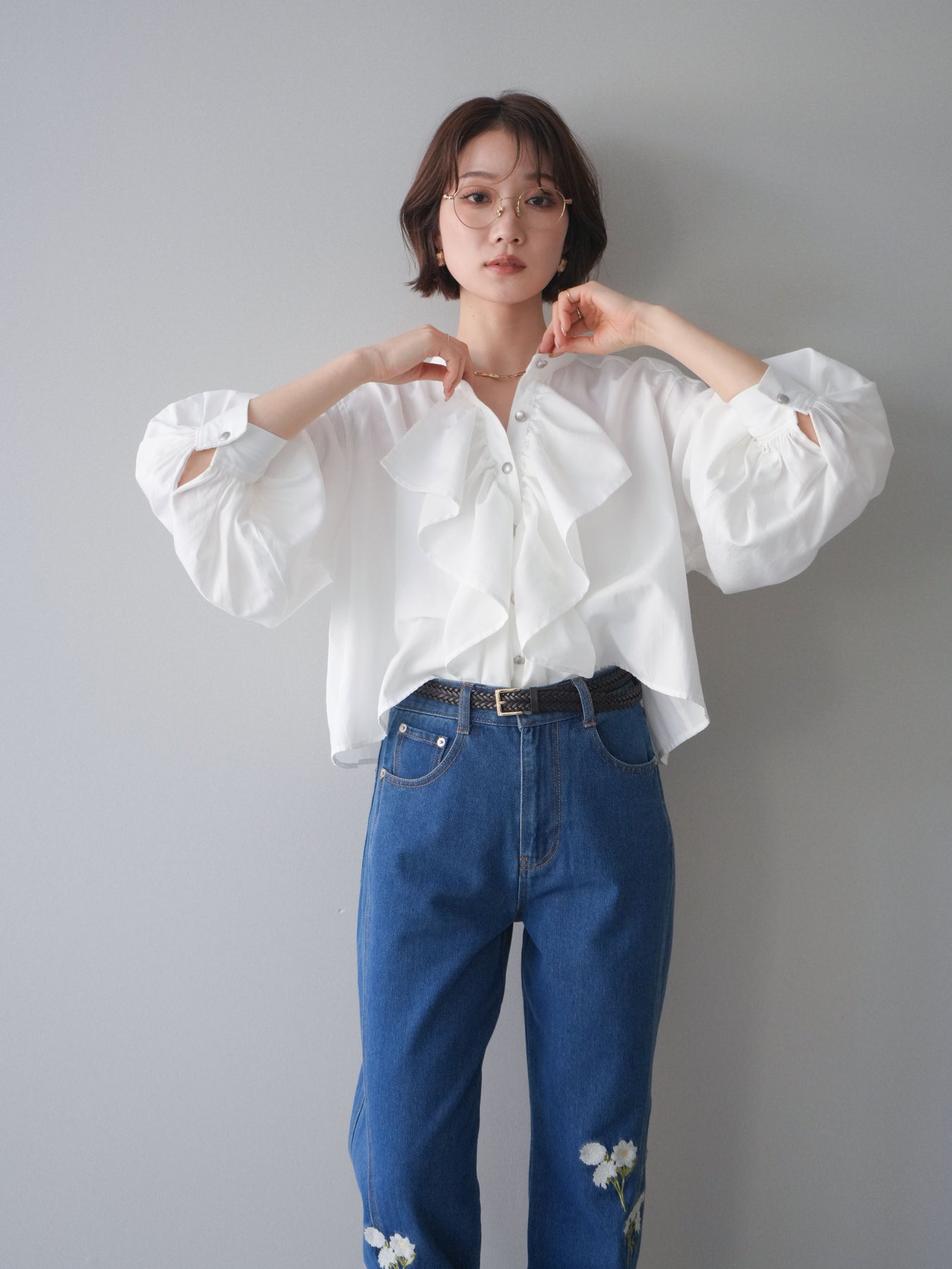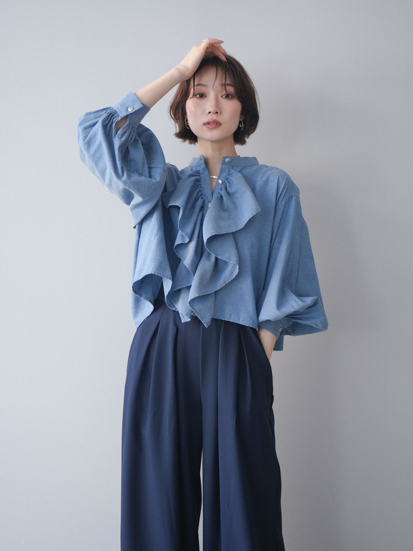 存在感のあるラッフルデザインが目を惹くショートブラウス。立体的に重なるフレアが動くたびに揺れ、華やかさと女性らしさを演出します。コンパクトな丈感でバランスが取りやすく、ハイウエストボトムやボリュームスカートとも好相性。袖は程よくふんわりとしたシルエットで、メリハリのある着こなしが叶う一枚です。 ※ボトムス、キャミソール(インナー)以外の商品は一律でインナーは付属していません
