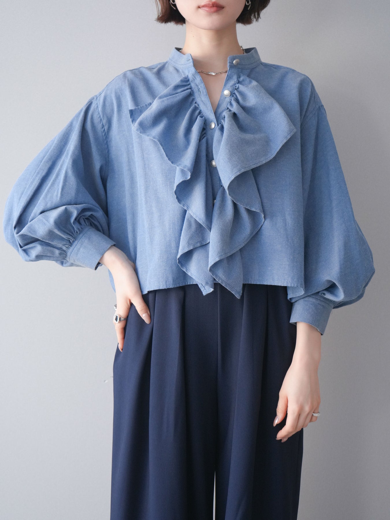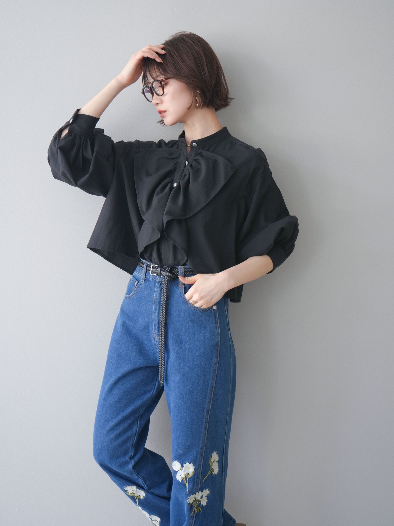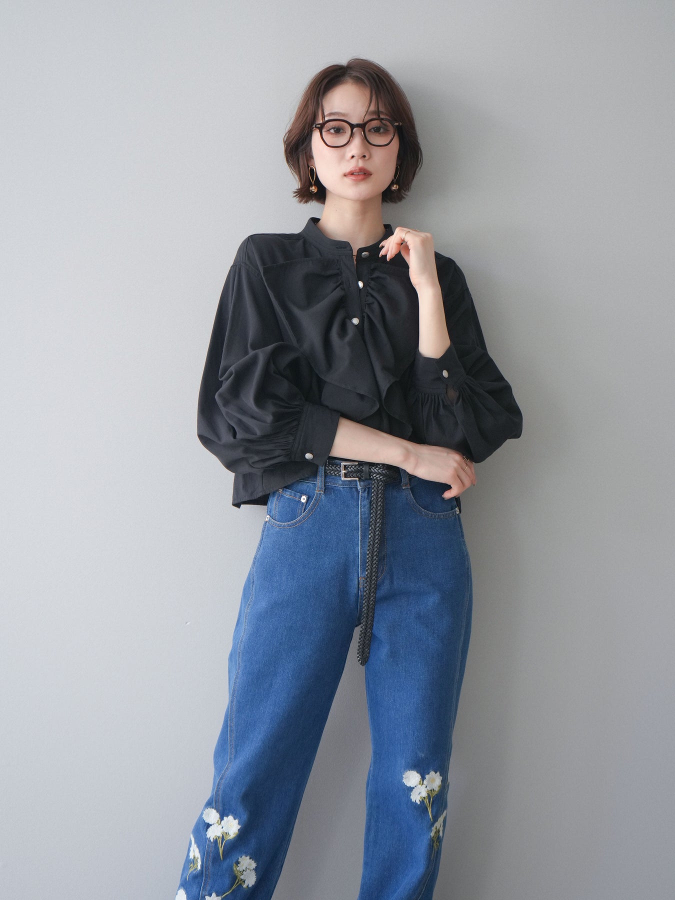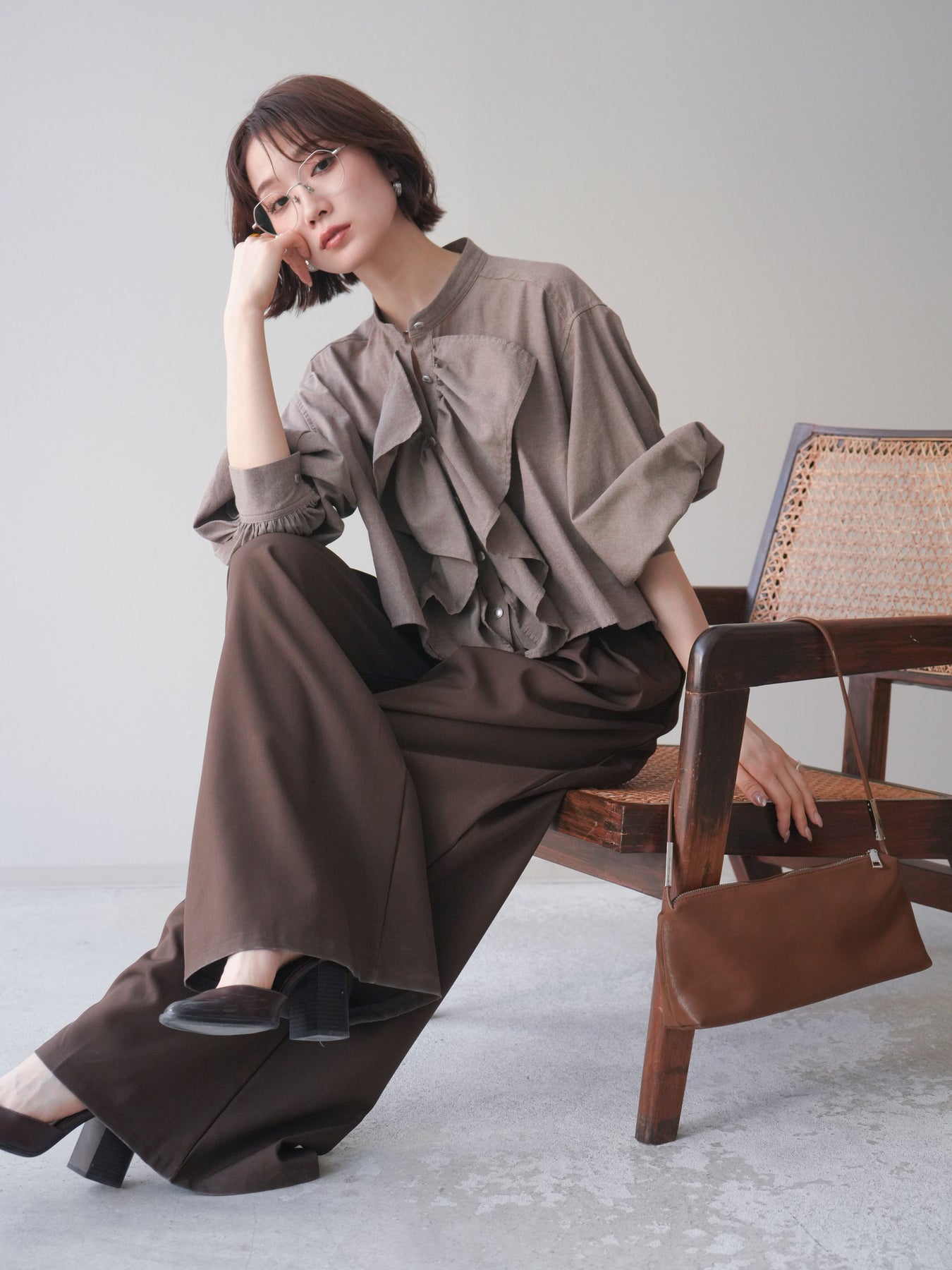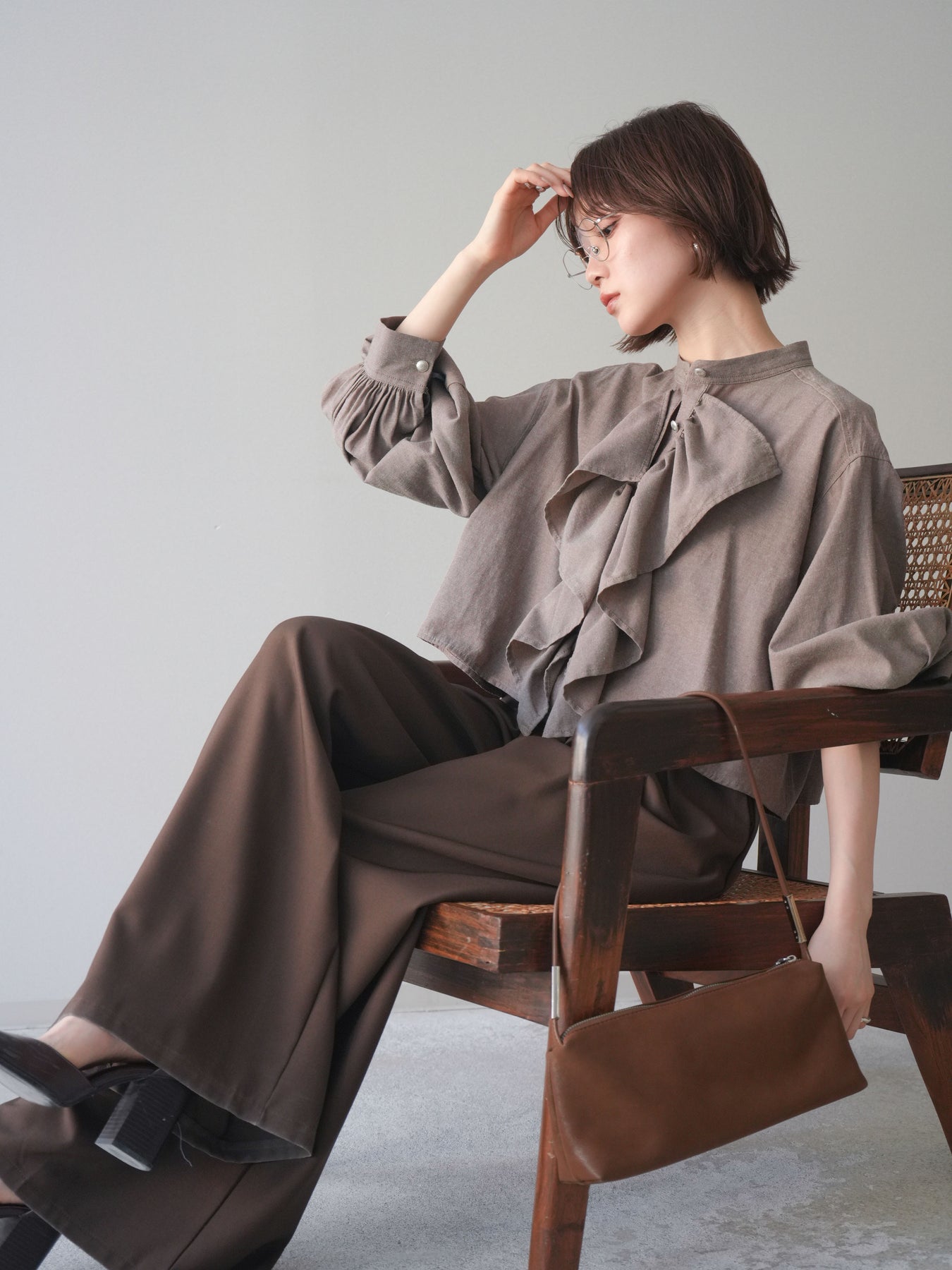 存在感のあるラッフルデザインが目を惹くショートブラウス。立体的に重なるフレアが動くたびに揺れ、華やかさと女性らしさを演出します。コンパクトな丈感でバランスが取りやすく、ハイウエストボトムやボリュームスカートとも好相性。袖は程よくふんわりとしたシルエットで、メリハリのある着こなしが叶う一枚です。 ※ボトムス、キャミソール(インナー)以外の商品は一律でインナーは付属していません