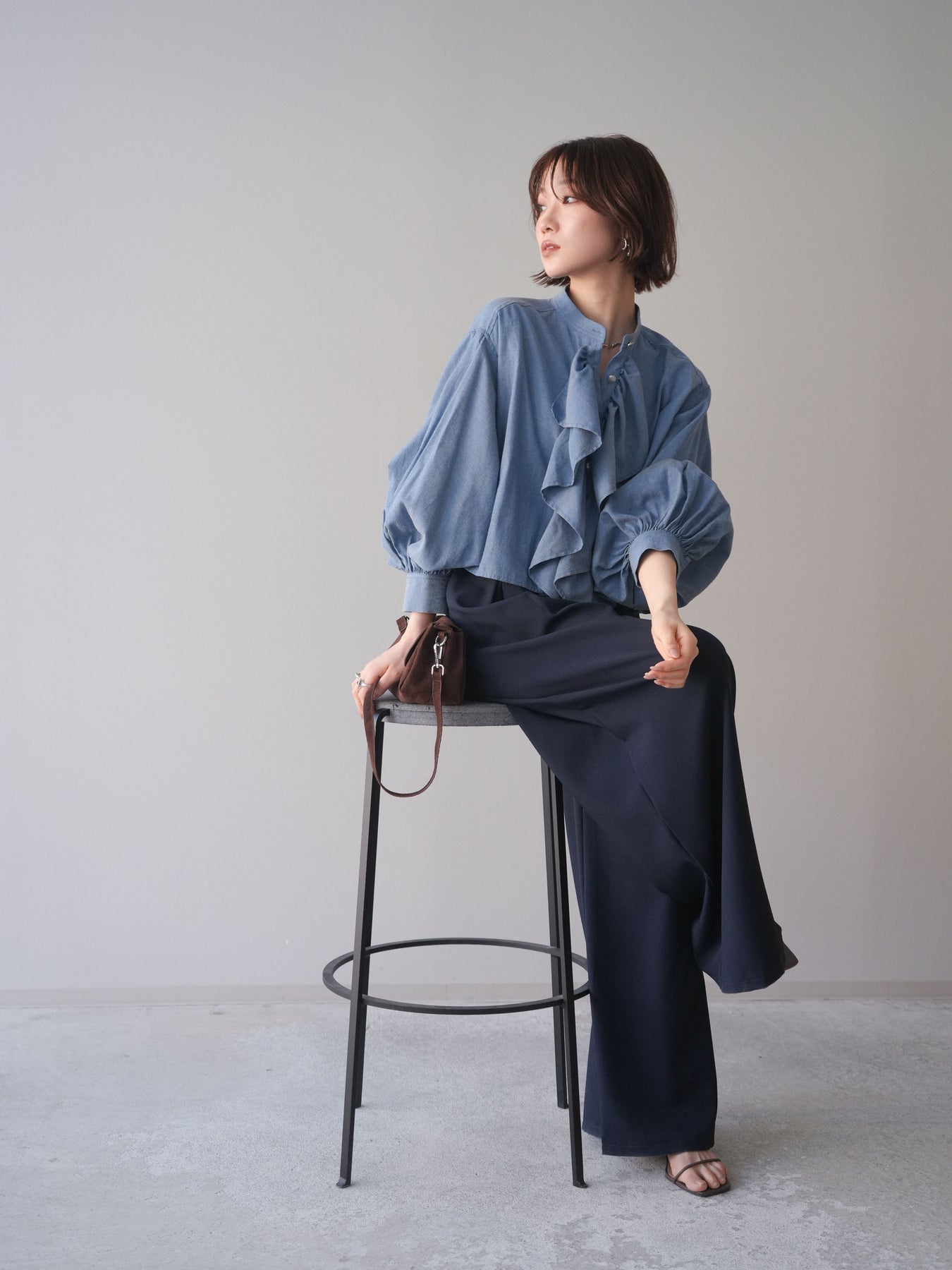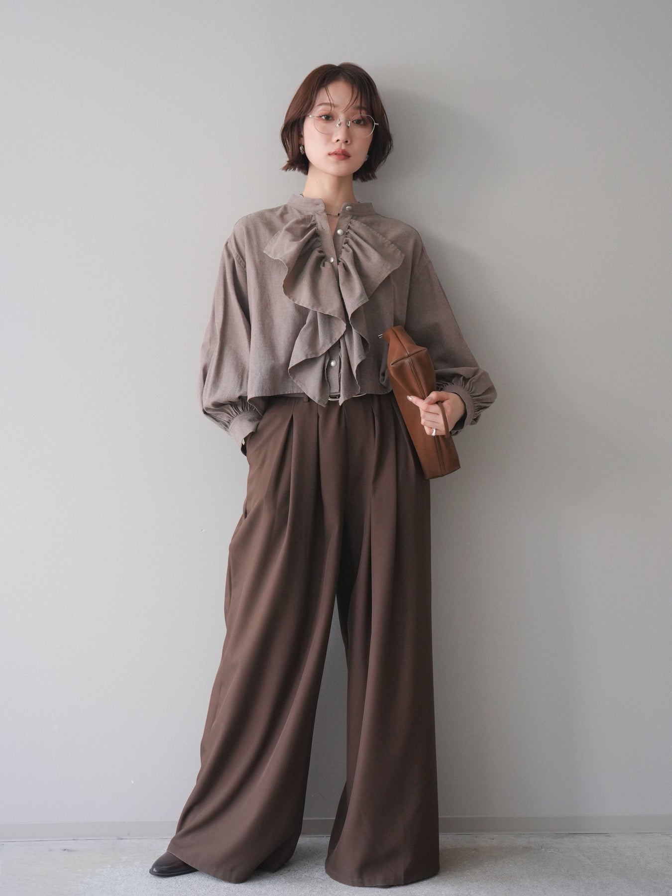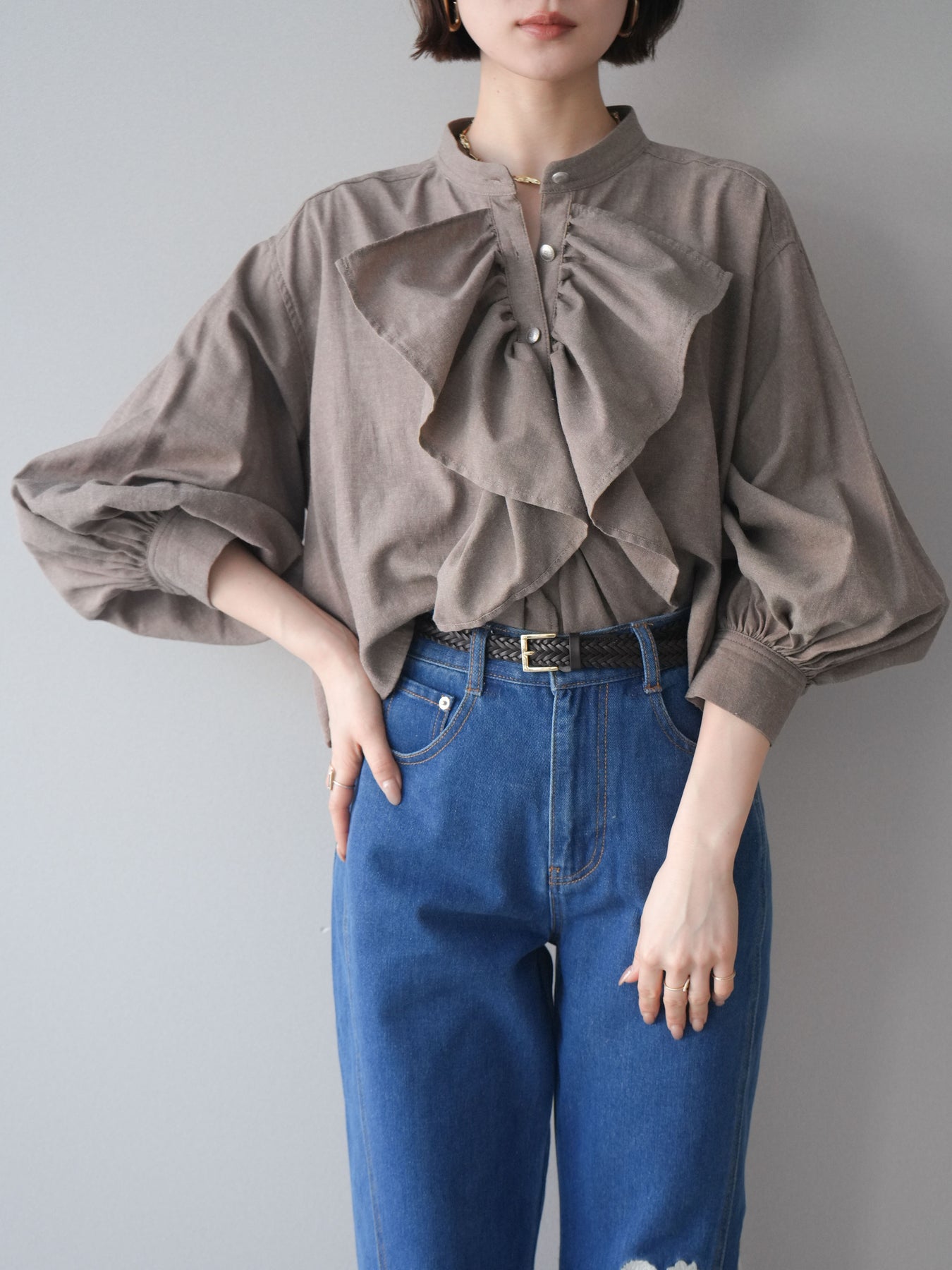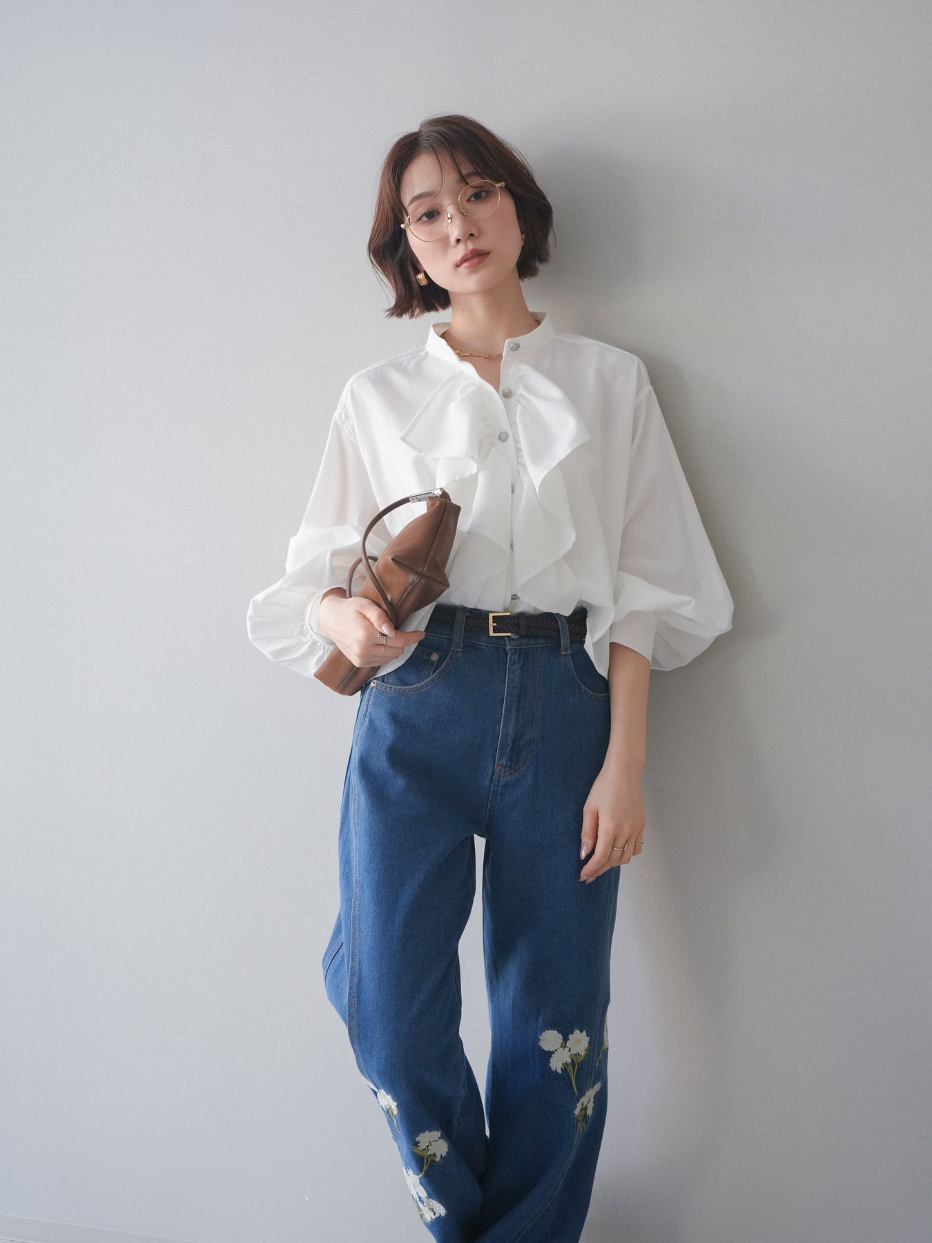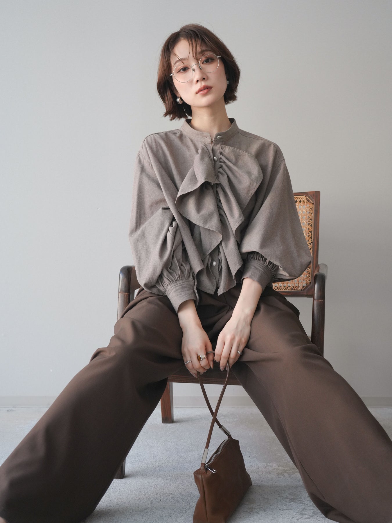存在感のあるラッフルデザインが目を惹くショートブラウス。立体的に重なるフレアが動くたびに揺れ、華やかさと女性らしさを演出します。コンパクトな丈感でバランスが取りやすく、ハイウエストボトムやボリュームスカートとも好相性。袖は程よくふんわりとしたシルエットで、メリハリのある着こなしが叶う一枚です。 ※ボトムス、キャミソール(インナー)以外の商品は一律でインナーは付属していません