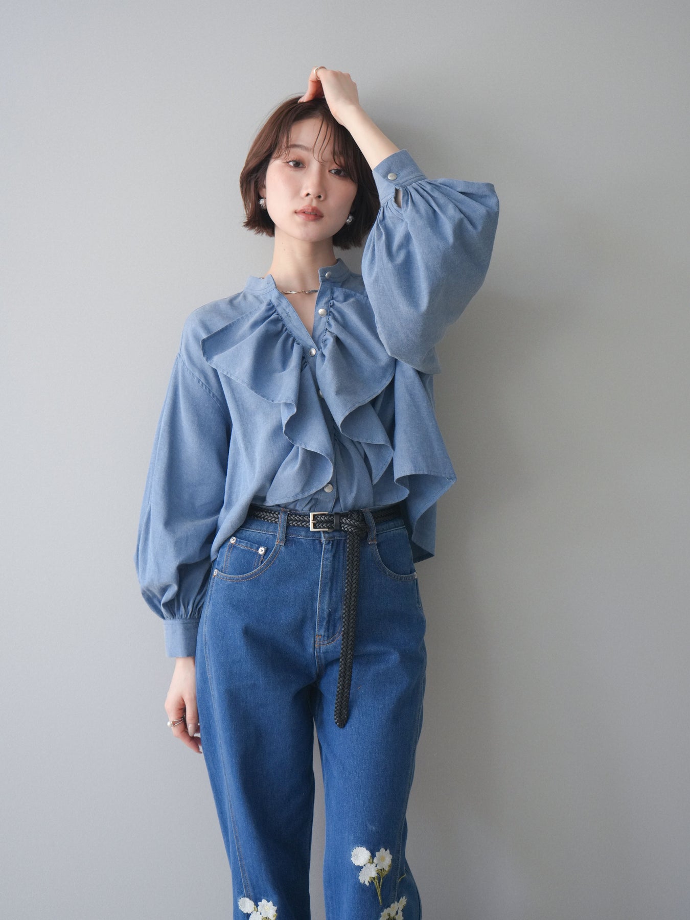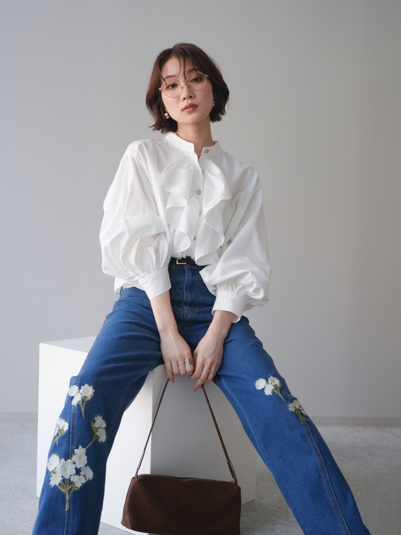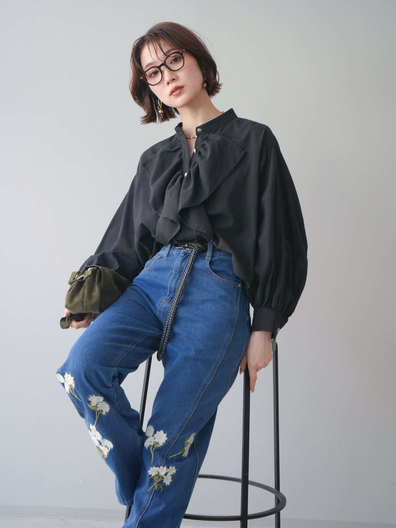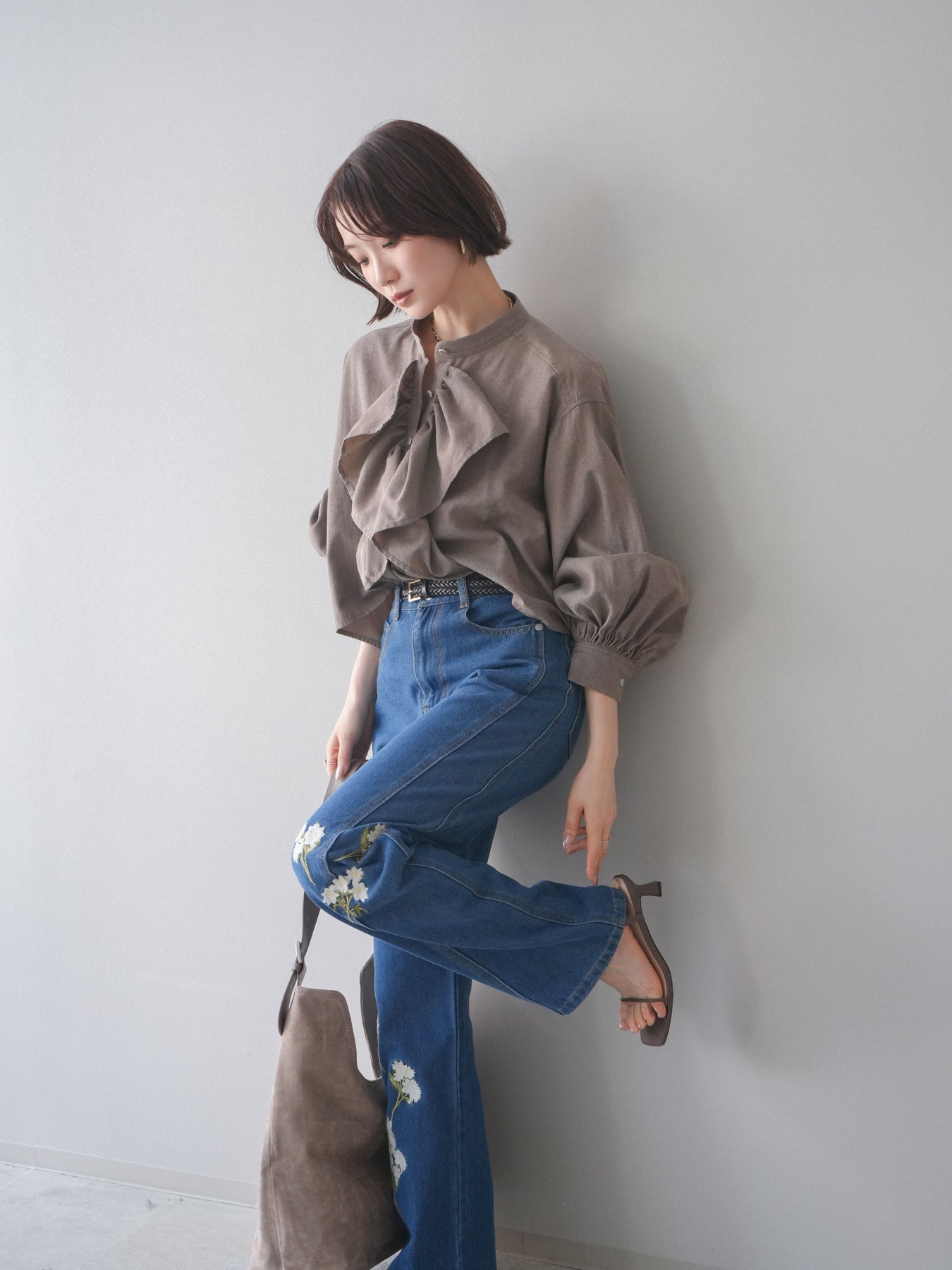 存在感のあるラッフルデザインが目を惹くショートブラウス。立体的に重なるフレアが動くたびに揺れ、華やかさと女性らしさを演出します。コンパクトな丈感でバランスが取りやすく、ハイウエストボトムやボリュームスカートとも好相性。袖は程よくふんわりとしたシルエットで、メリハリのある着こなしが叶う一枚です。 ※ボトムス、キャミソール(インナー)以外の商品は一律でインナーは付属していません