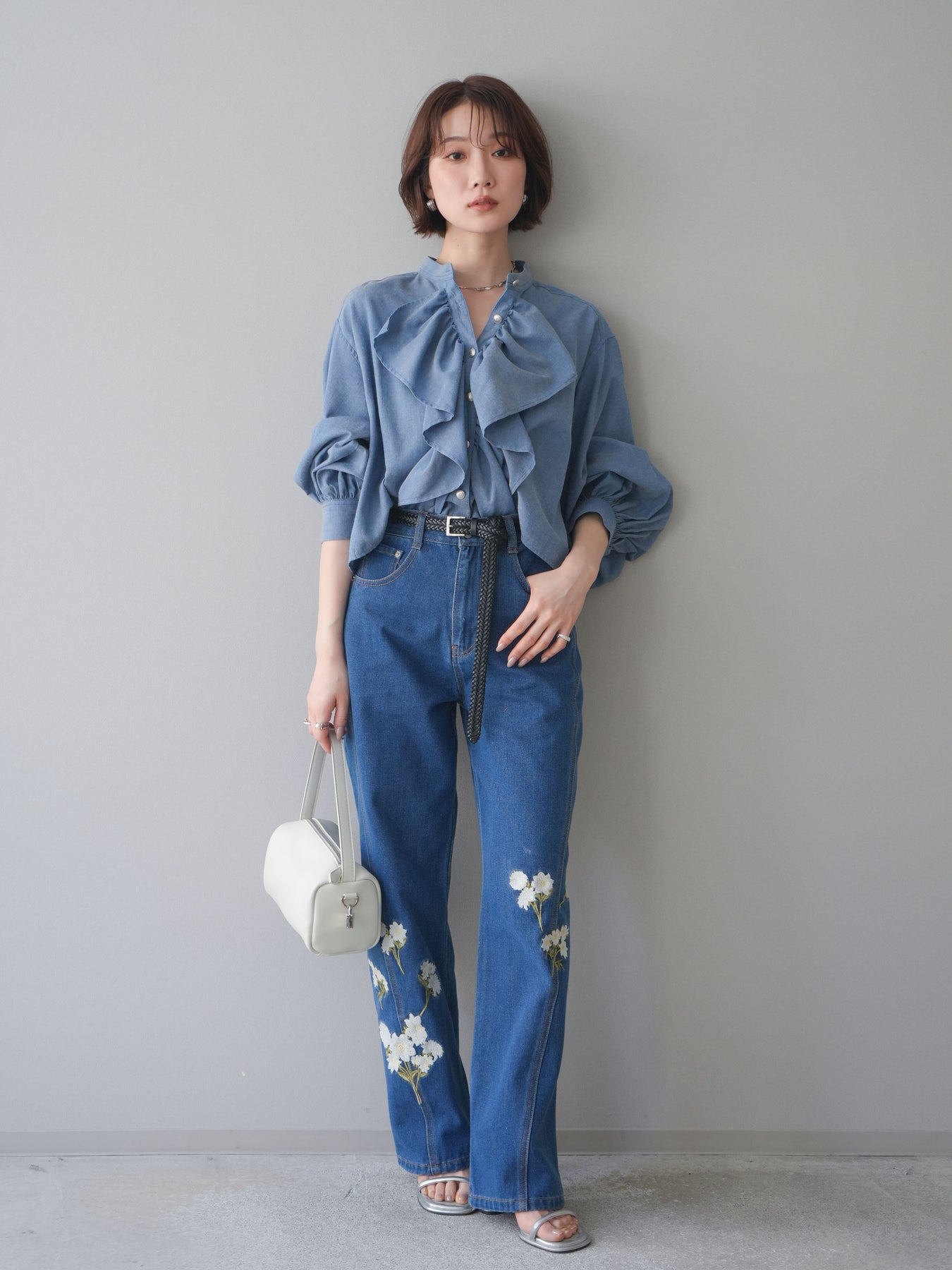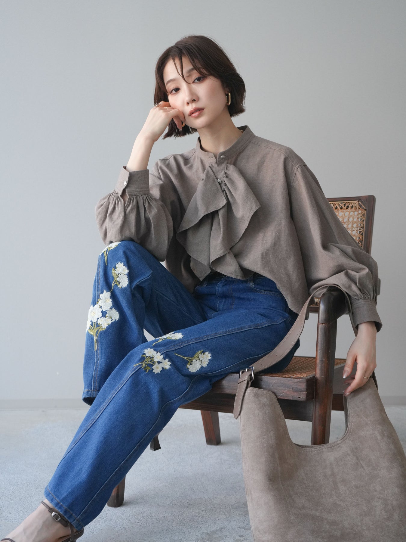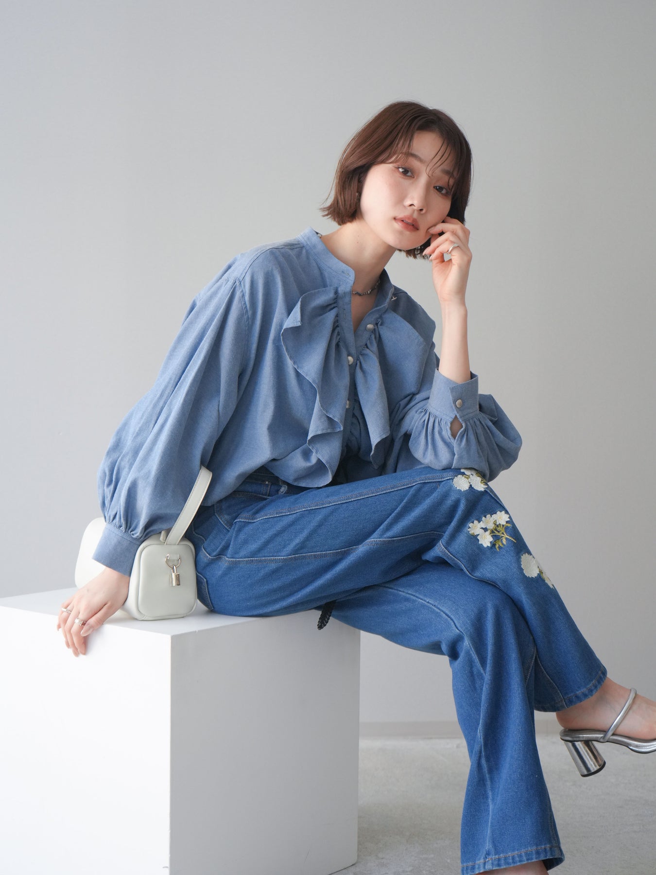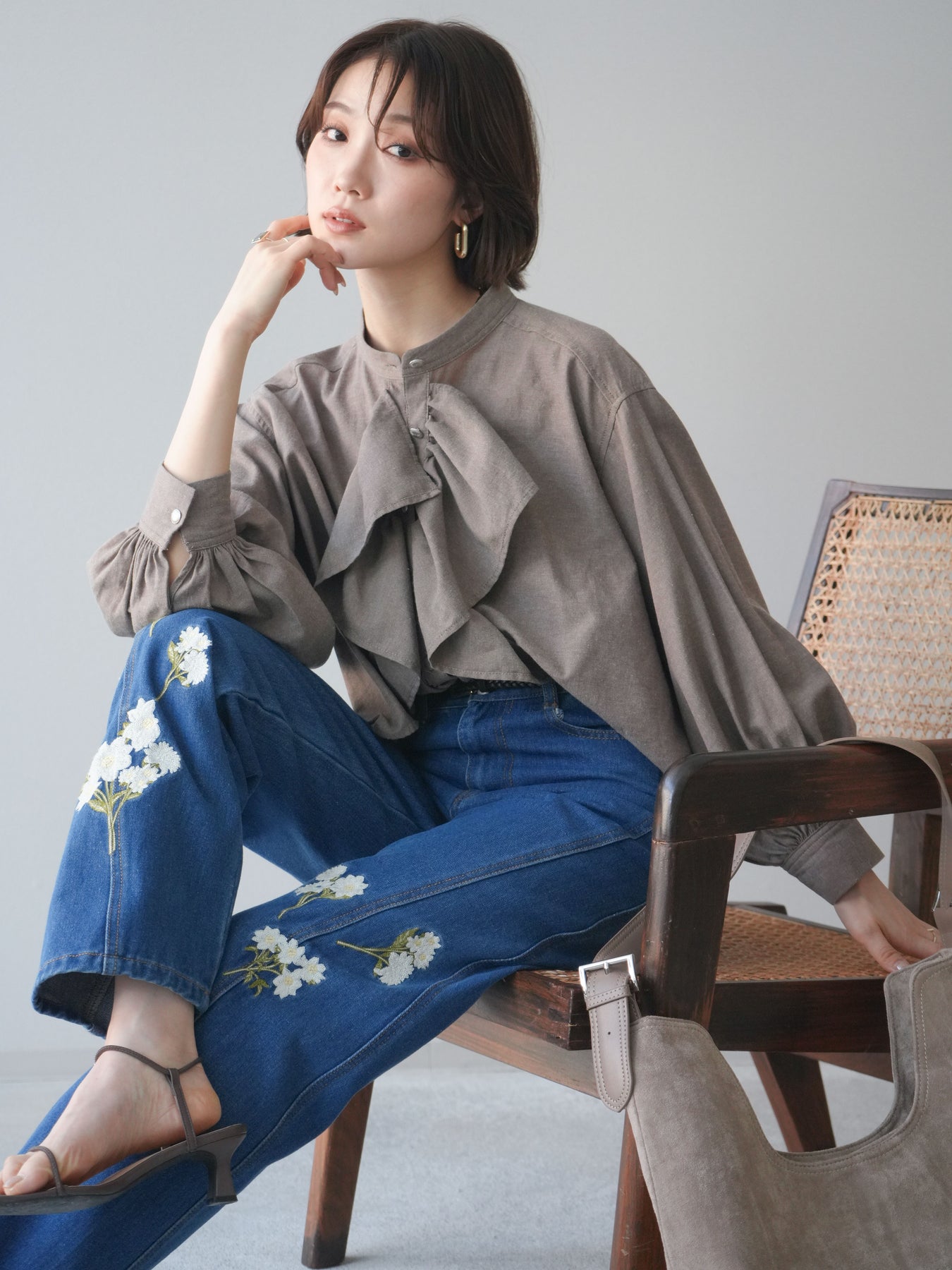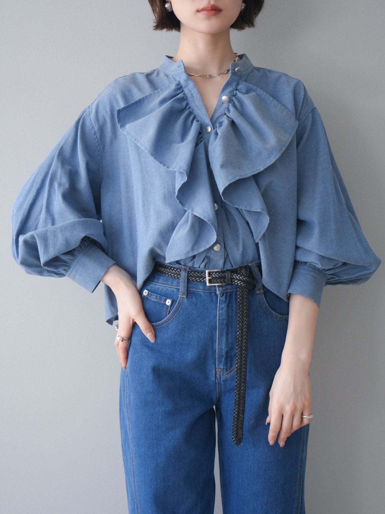 存在感のあるラッフルデザインが目を惹くショートブラウス。立体的に重なるフレアが動くたびに揺れ、華やかさと女性らしさを演出します。コンパクトな丈感でバランスが取りやすく、ハイウエストボトムやボリュームスカートとも好相性。袖は程よくふんわりとしたシルエットで、メリハリのある着こなしが叶う一枚です。 ※ボトムス、キャミソール(インナー)以外の商品は一律でインナーは付属していません