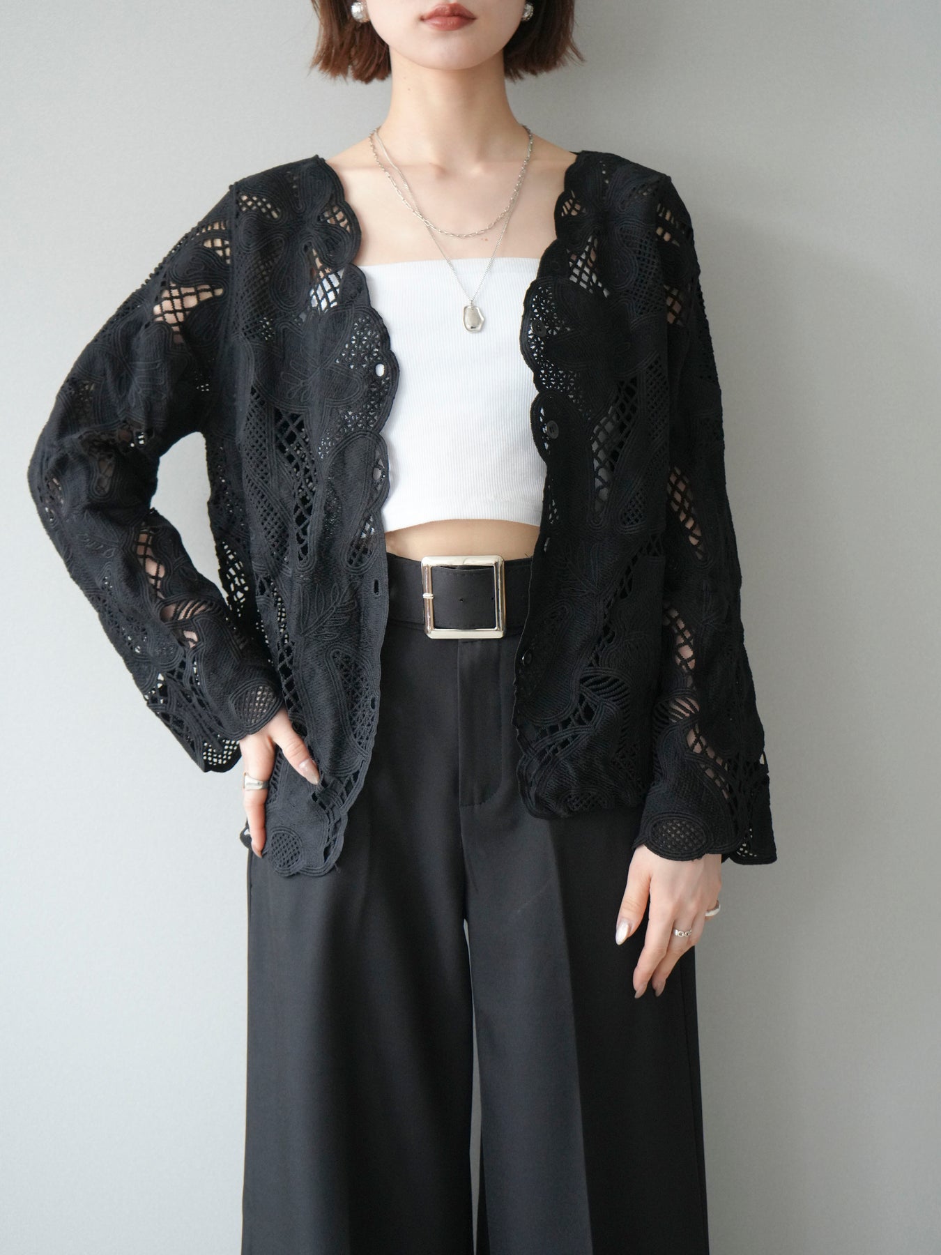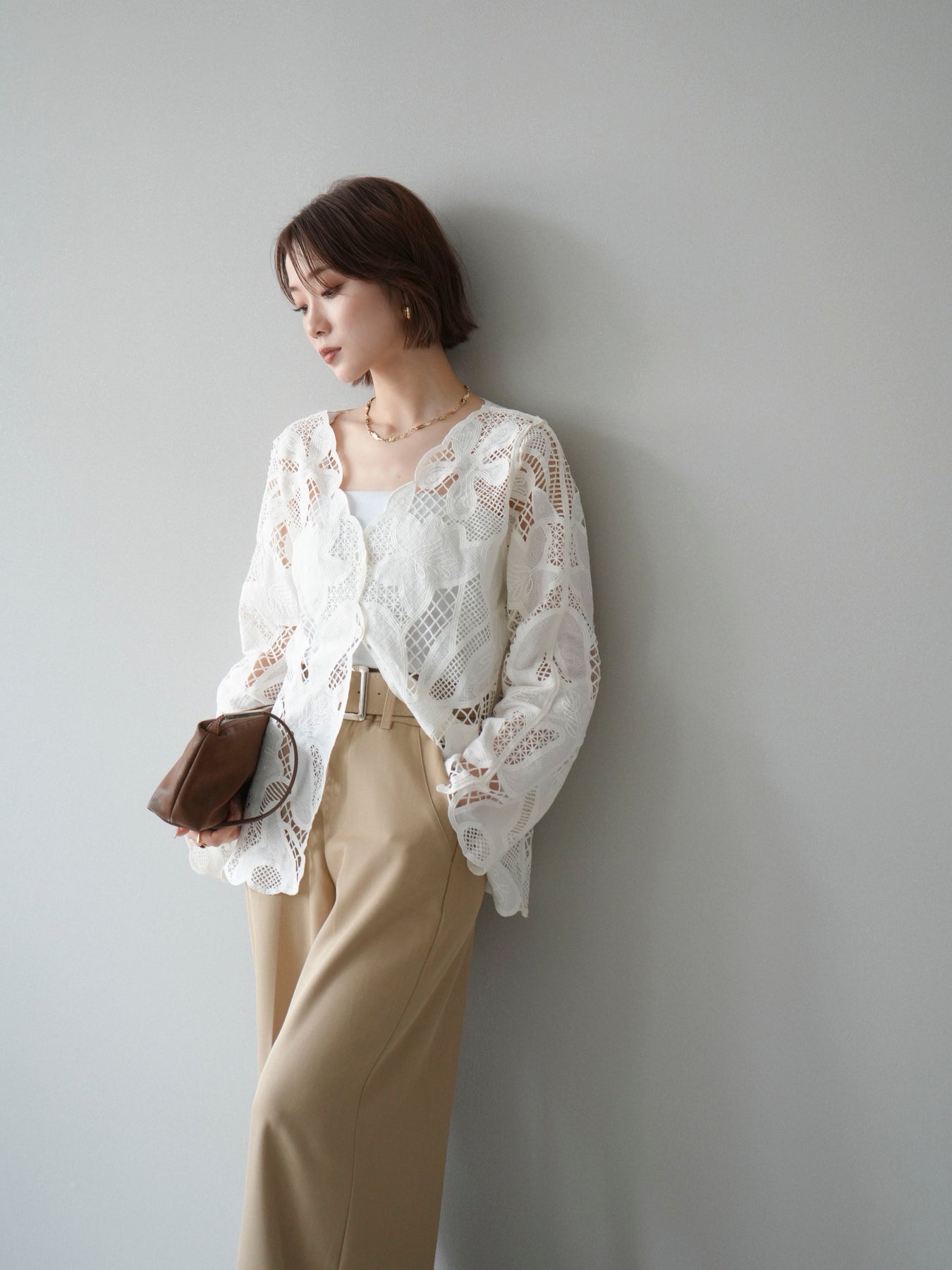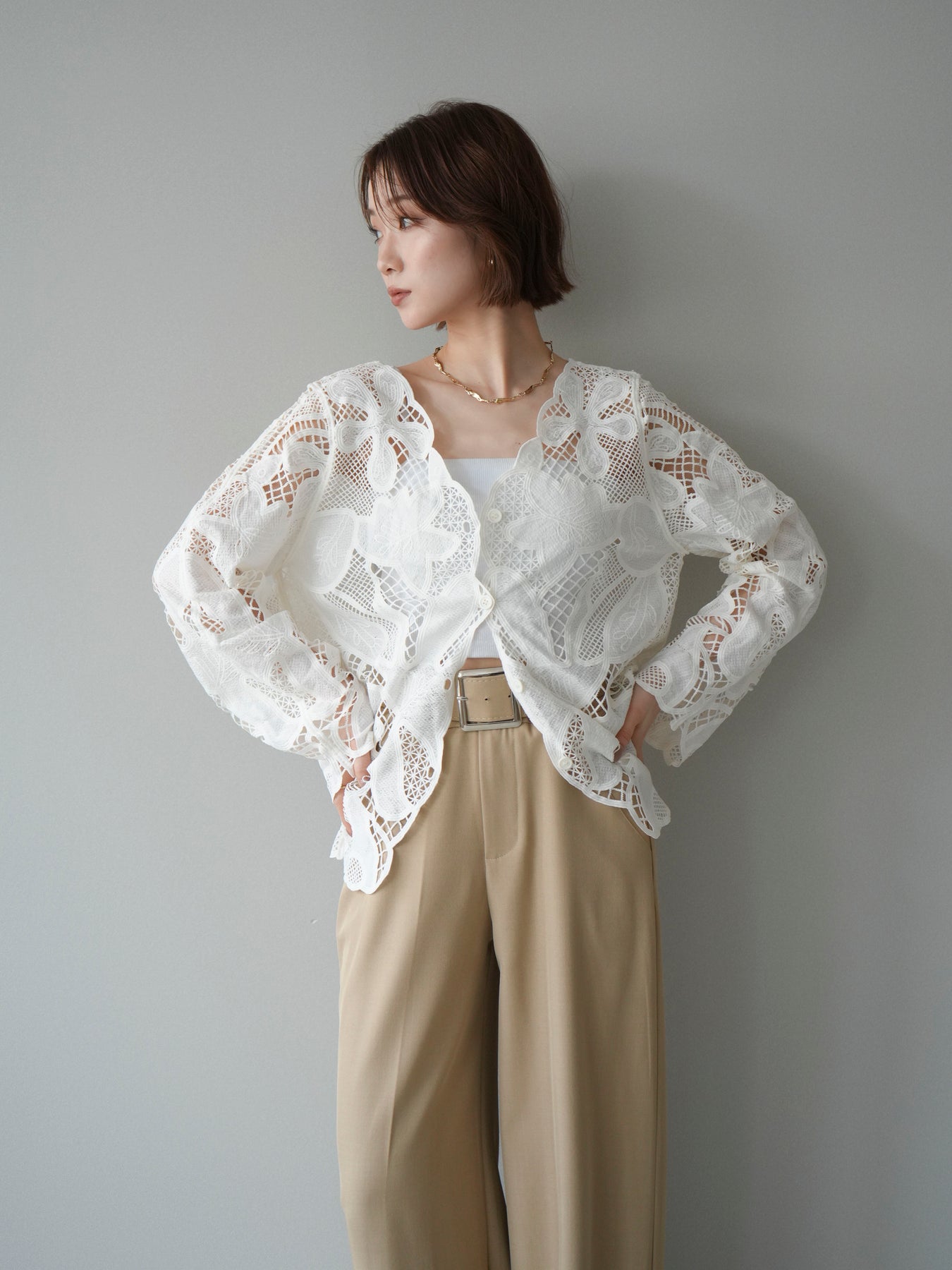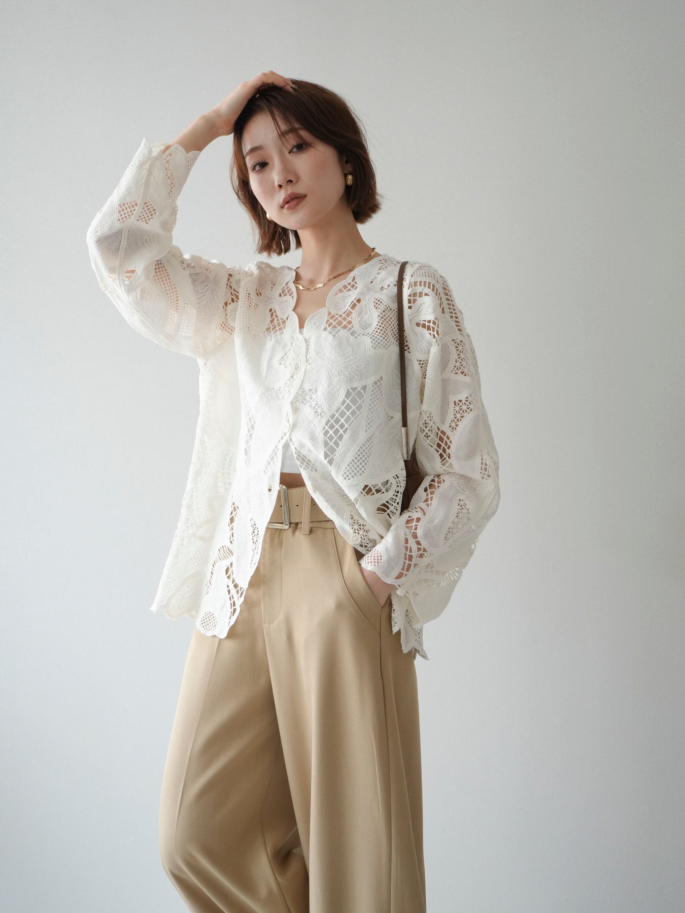 這款扇形邊襯衫飾有精美的立體蕾絲細節。領口和袖口的精緻蕾絲花邊巧妙地勾勒出臉部輪廓,營造出柔美嫵媚的氣質。寬鬆的版型和輕盈的布料,穿著舒適,同時又不失優雅。流蘇裝飾的繫帶更添一絲精緻,為整體造型增添層次感。搭配下裝即可輕鬆打造時尚造型,無論是日常穿著還是外出,都是理想之選。 *請注意,除下裝和吊帶背心(內衣)外,其他商品均不包含內衣。