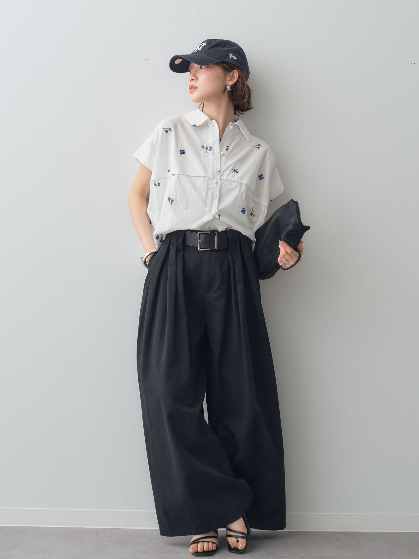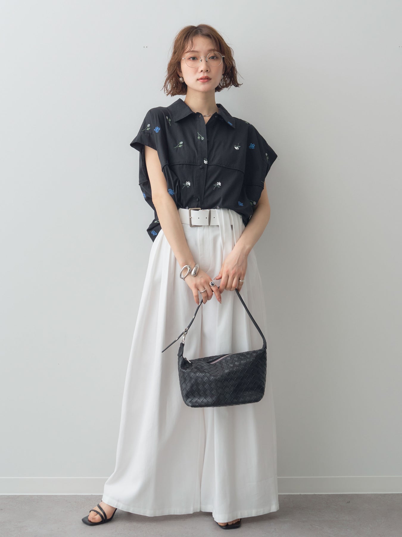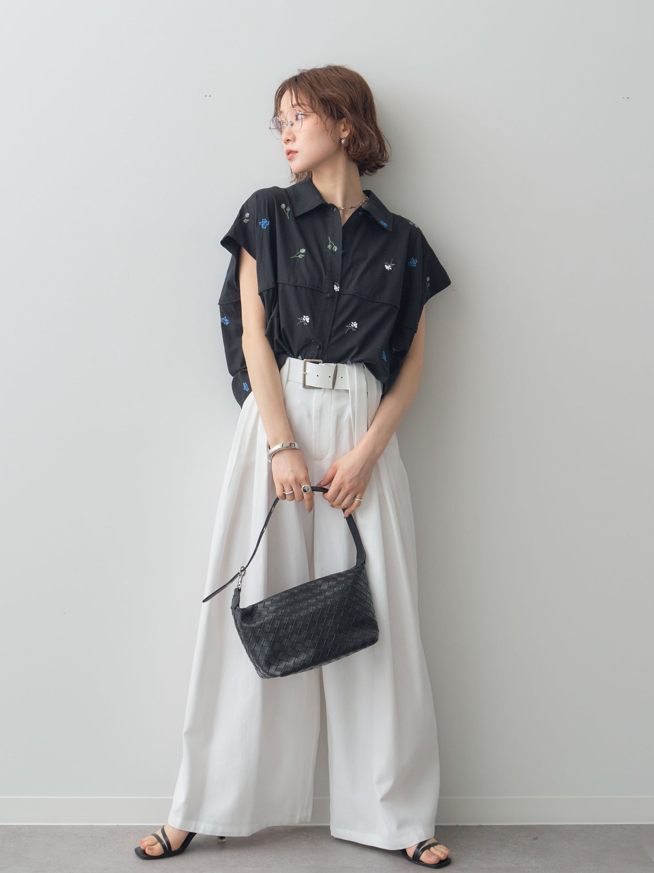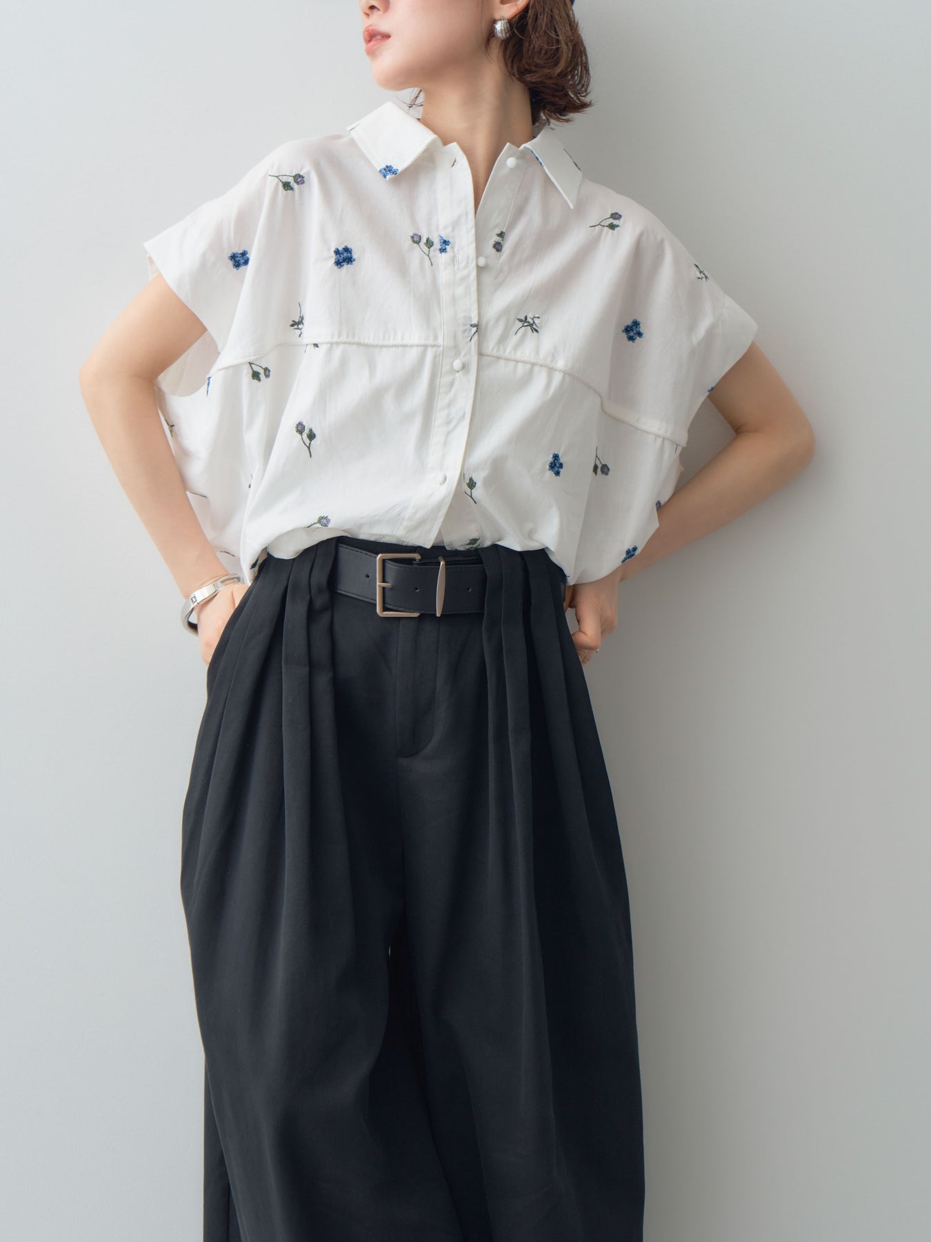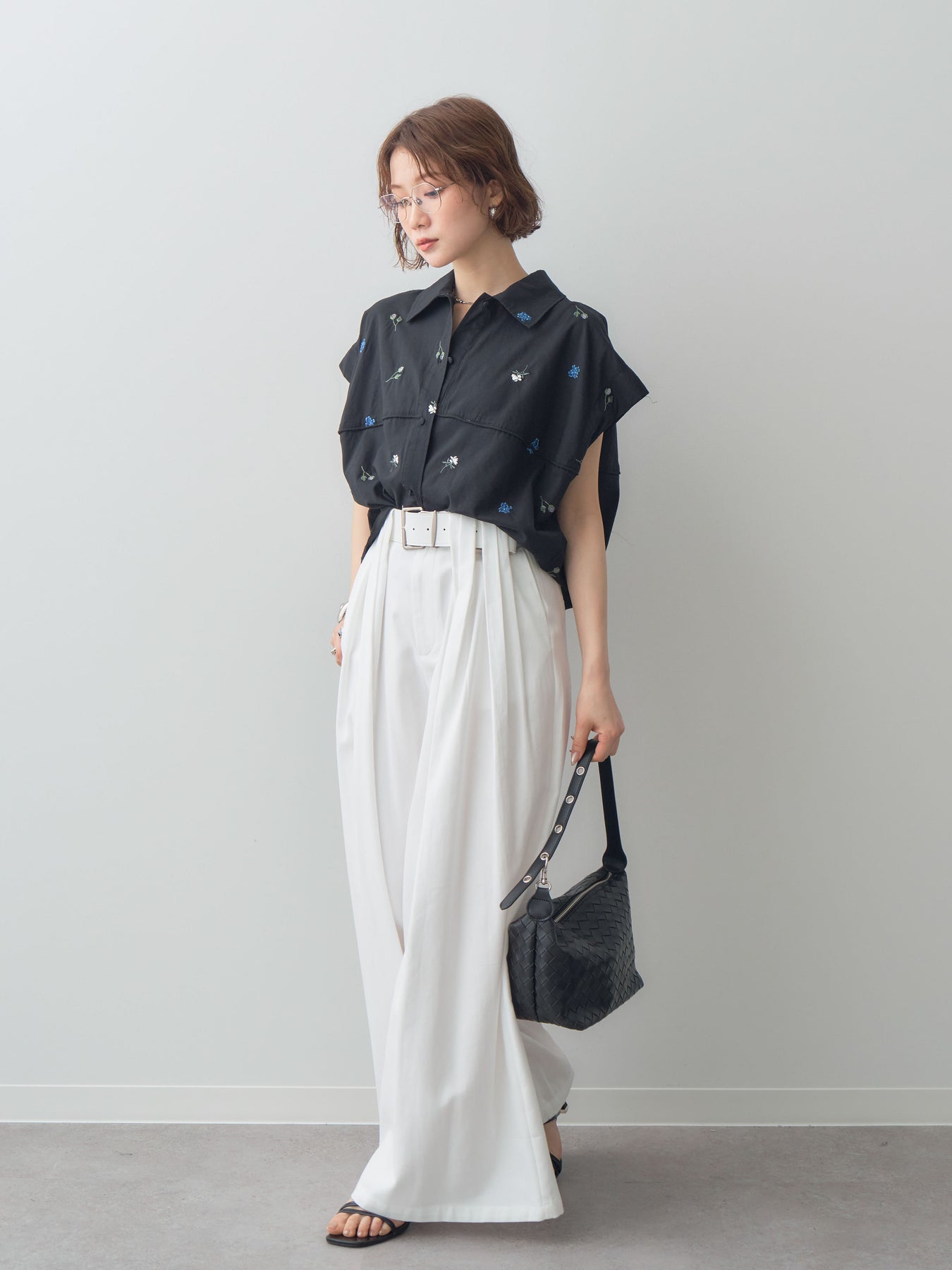 【套裝】花卉刺繡燈籠無袖襯衫+腰帶設計環扣闊腿褲(兩件套)