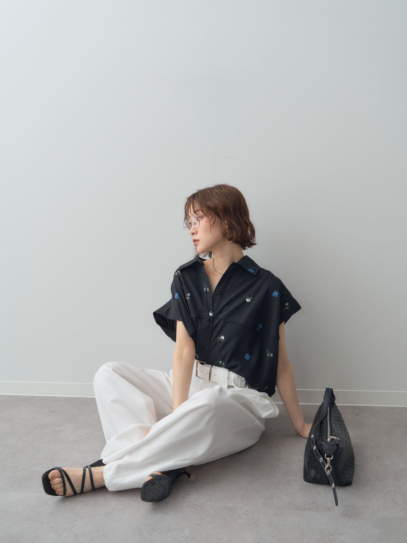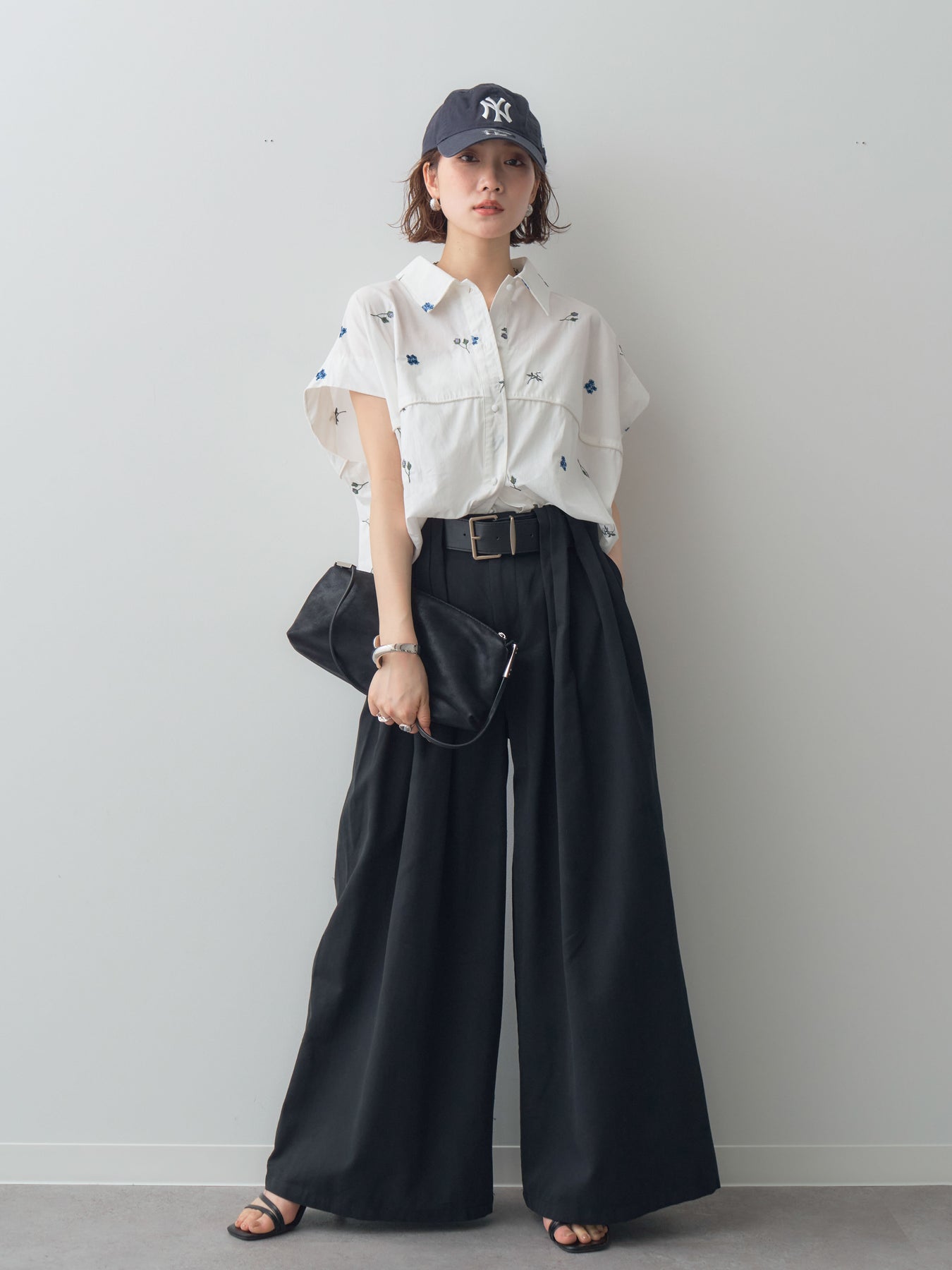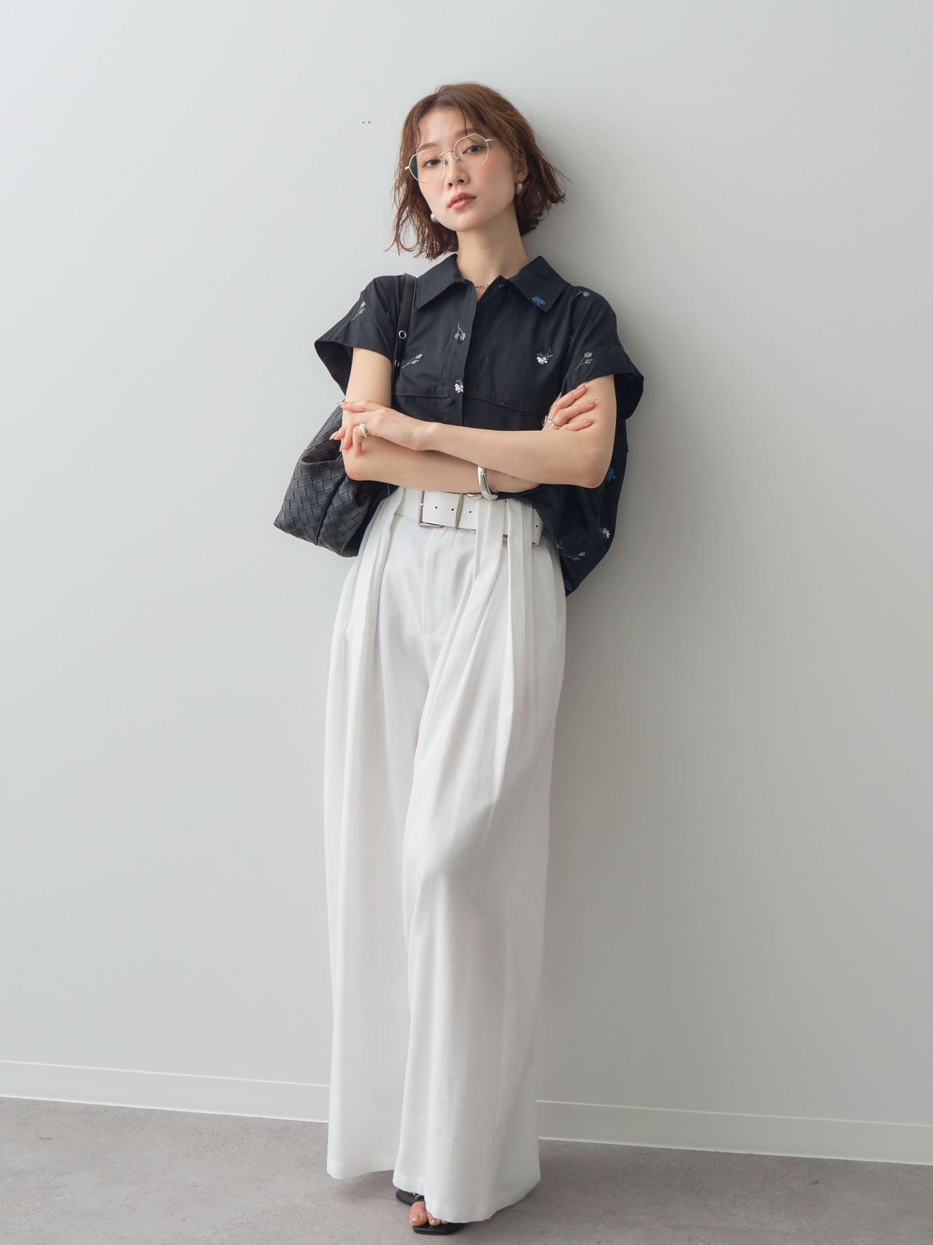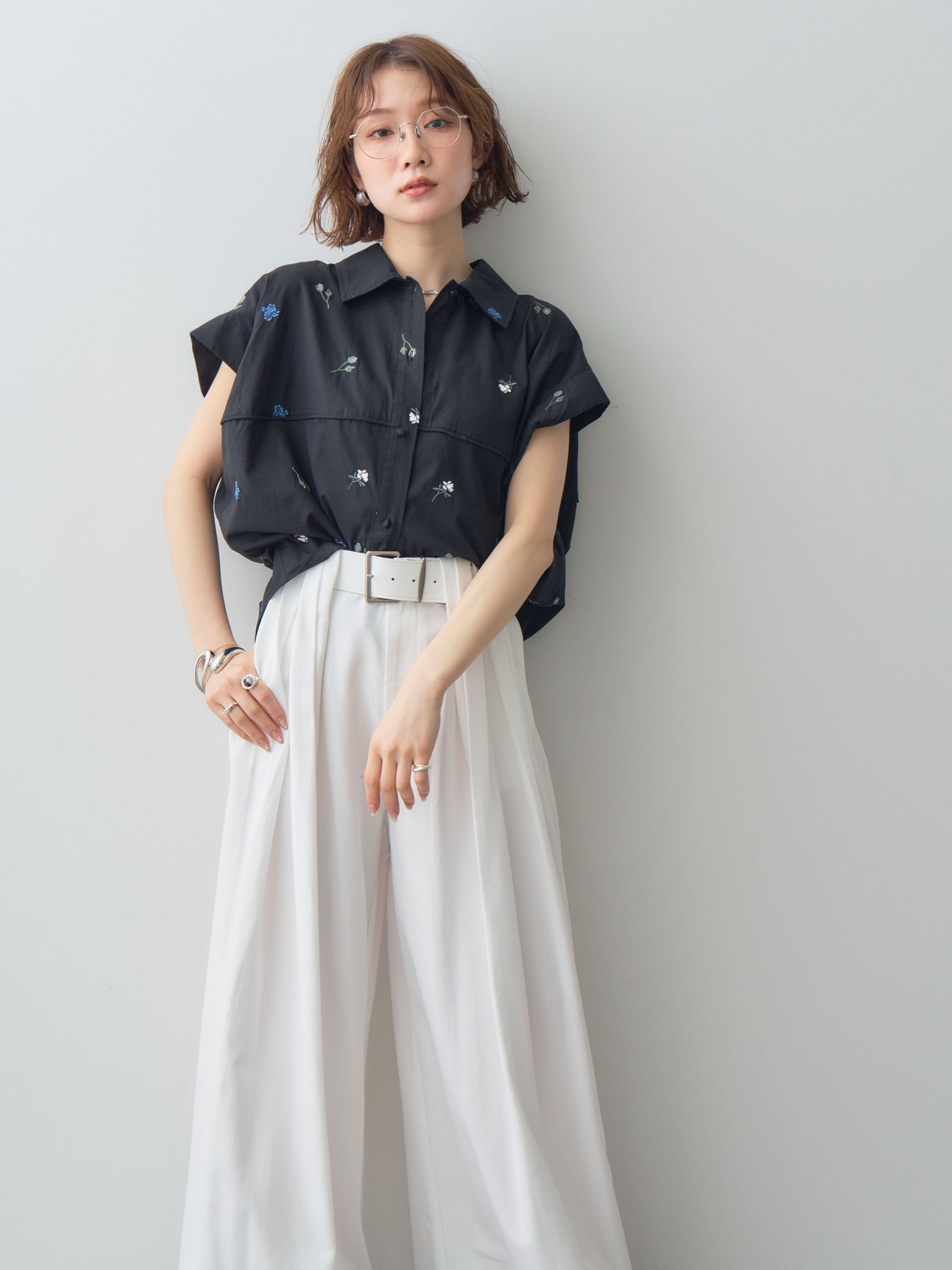 【套裝】花卉刺繡燈籠無袖襯衫+腰帶設計環扣闊腿褲(兩件套)