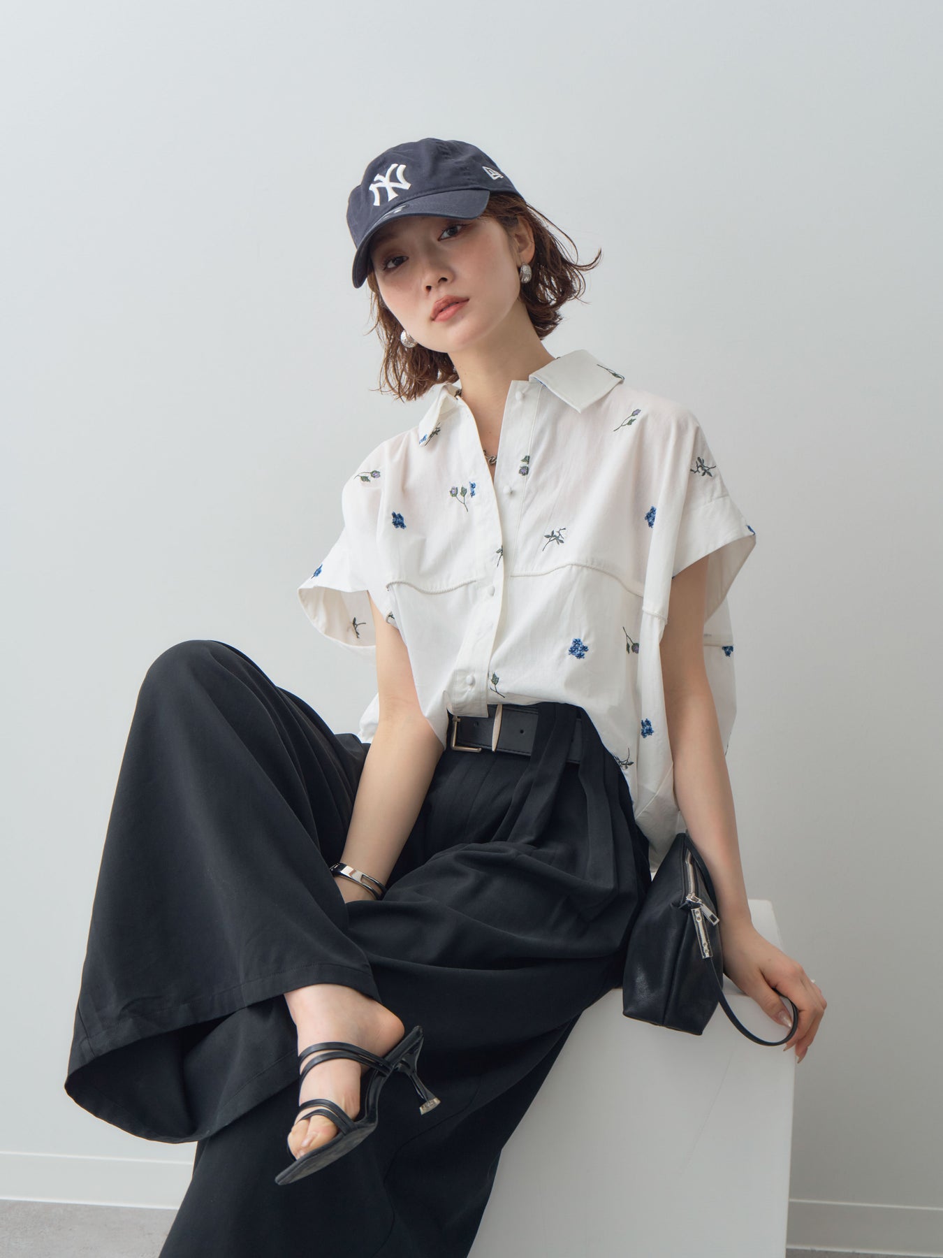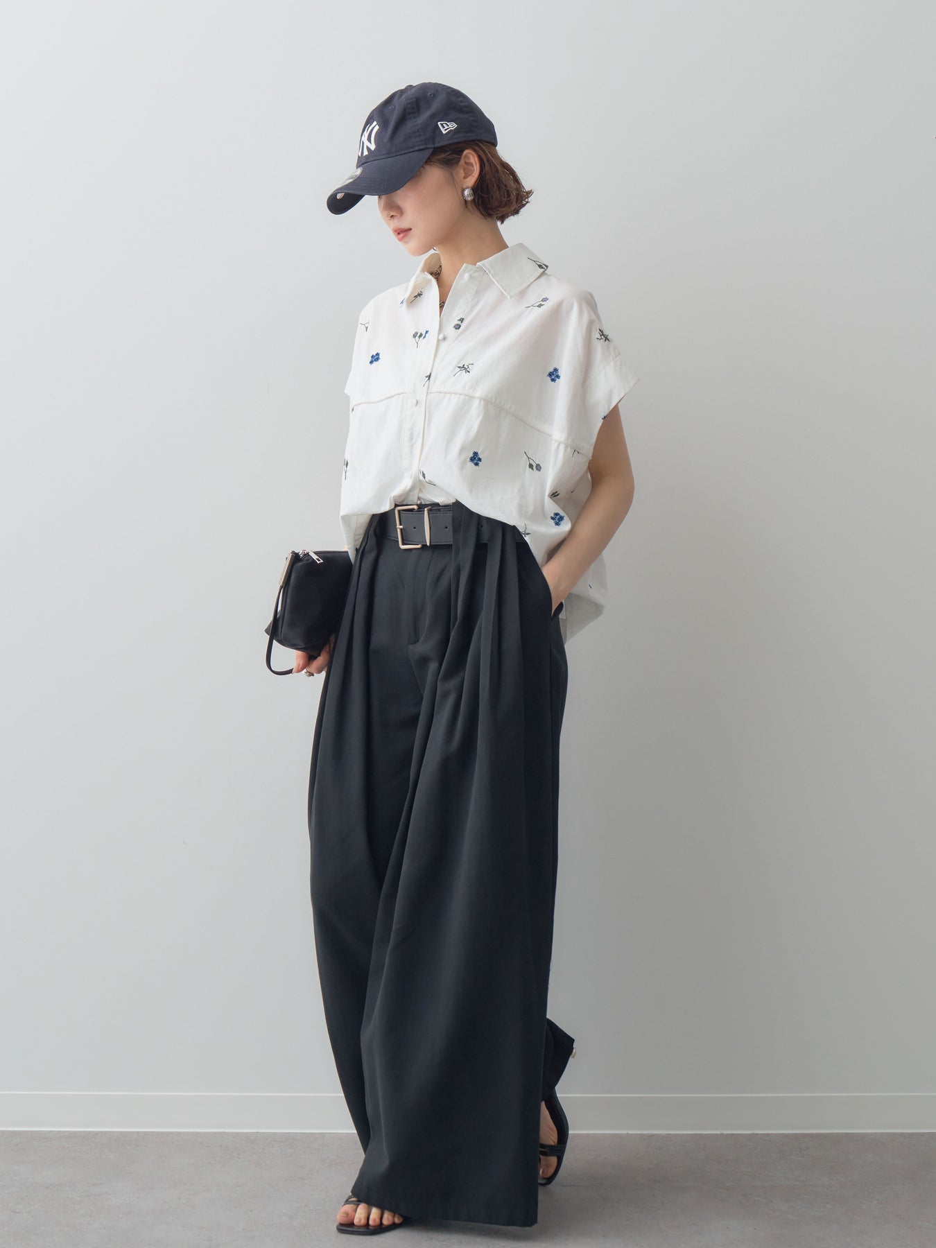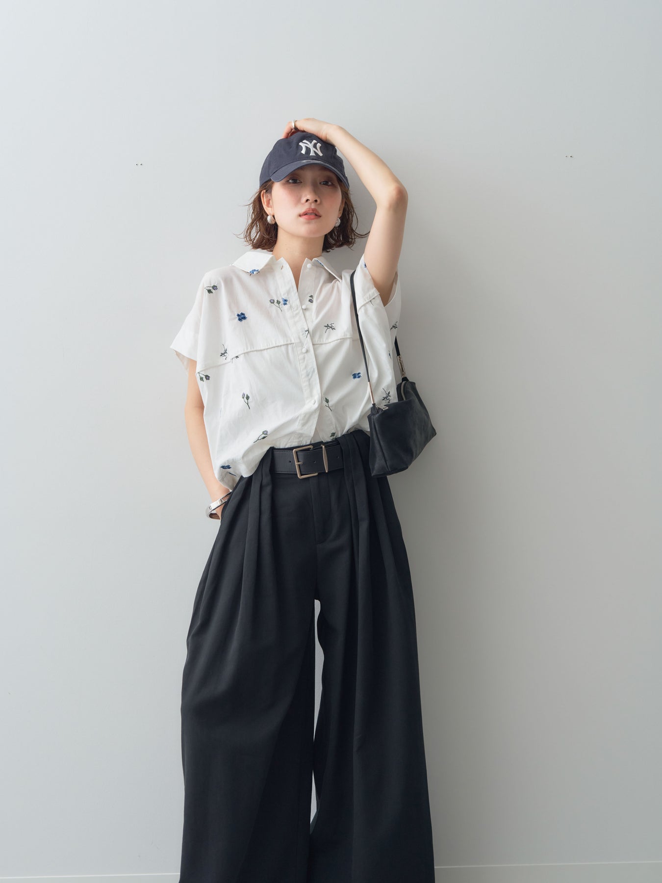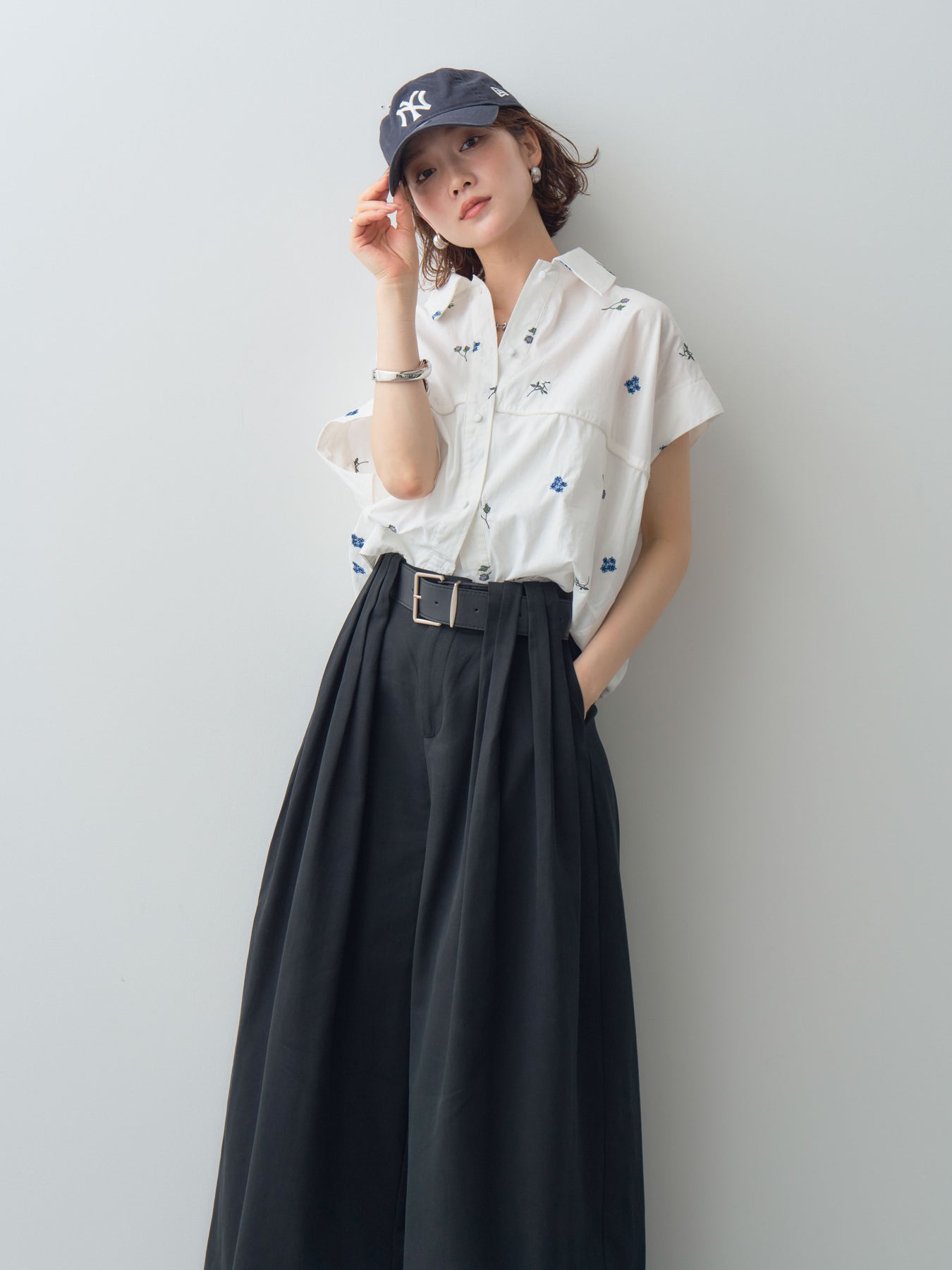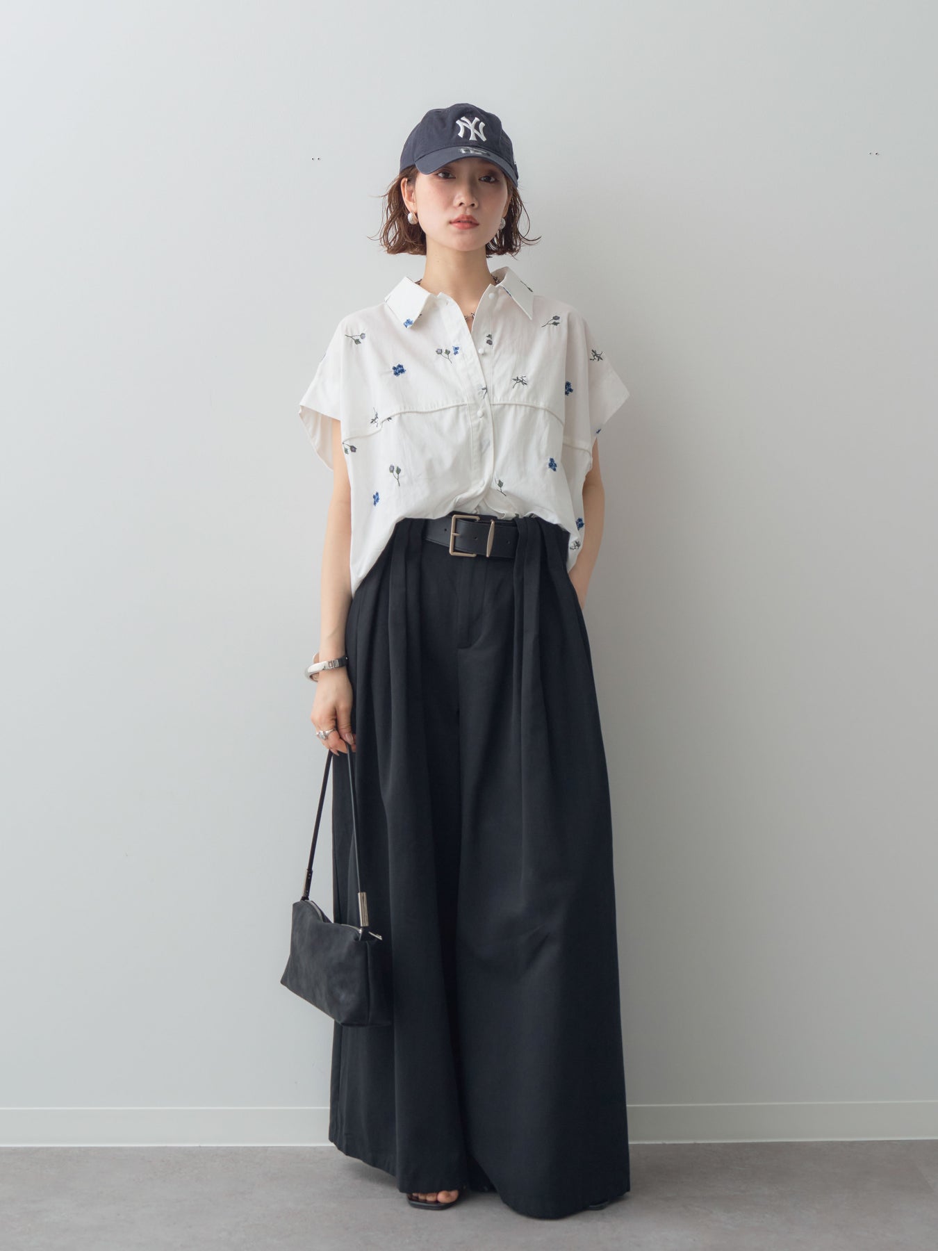 【套裝】花卉刺繡燈籠無袖襯衫+腰帶設計環扣闊腿褲(兩件套)