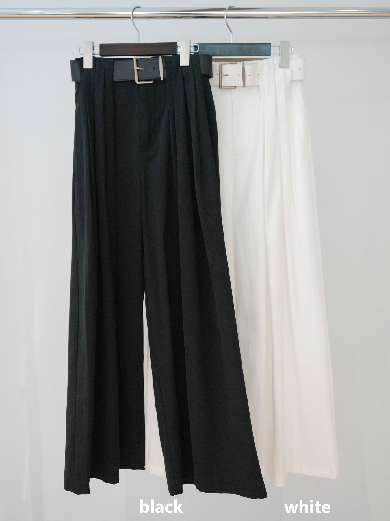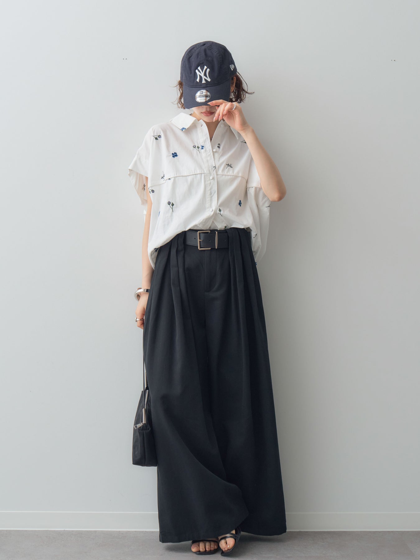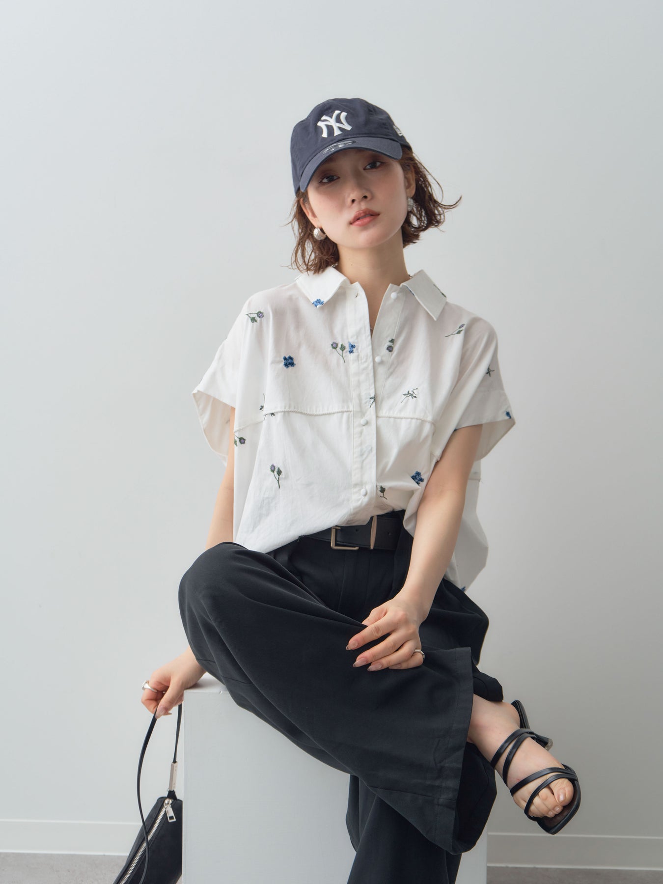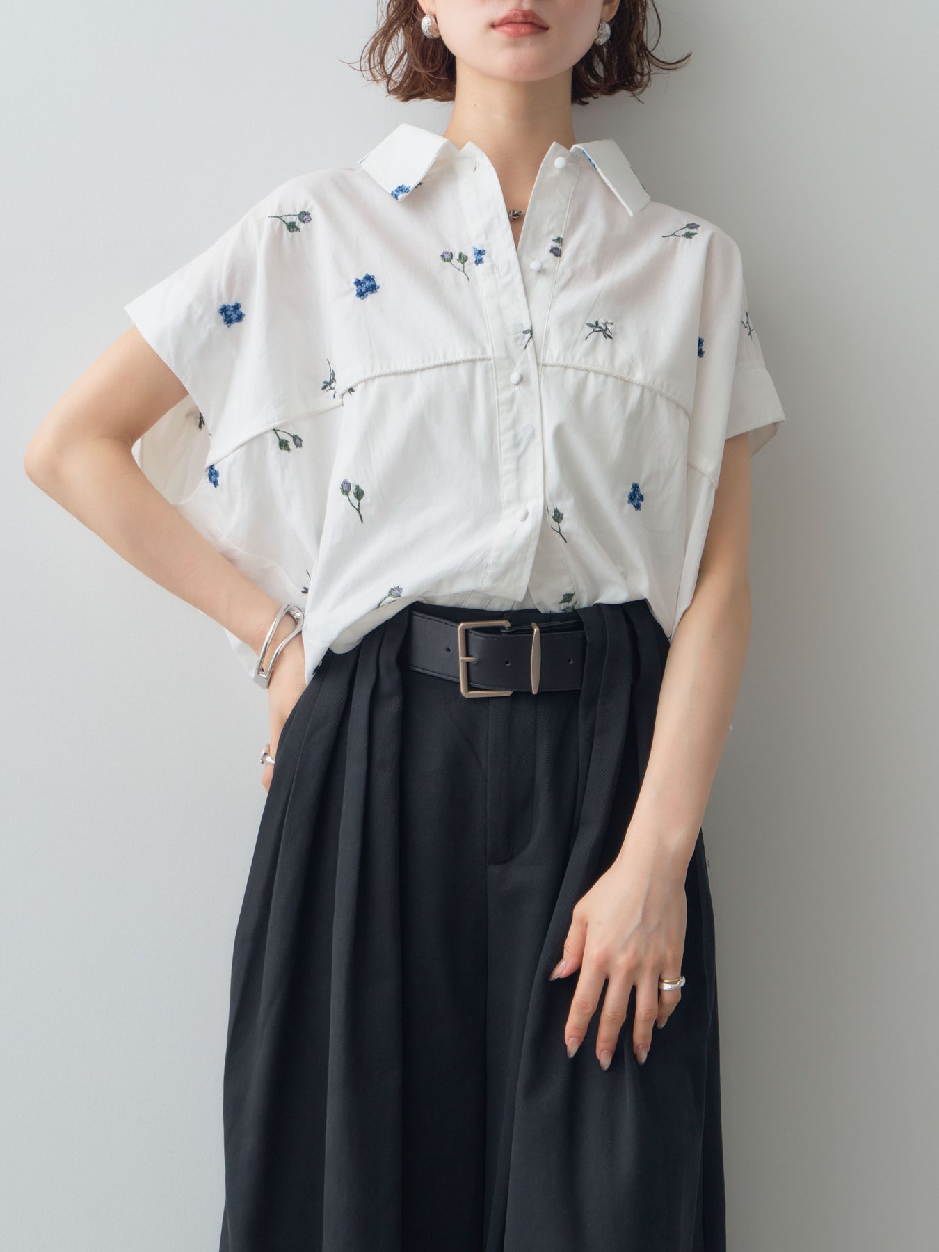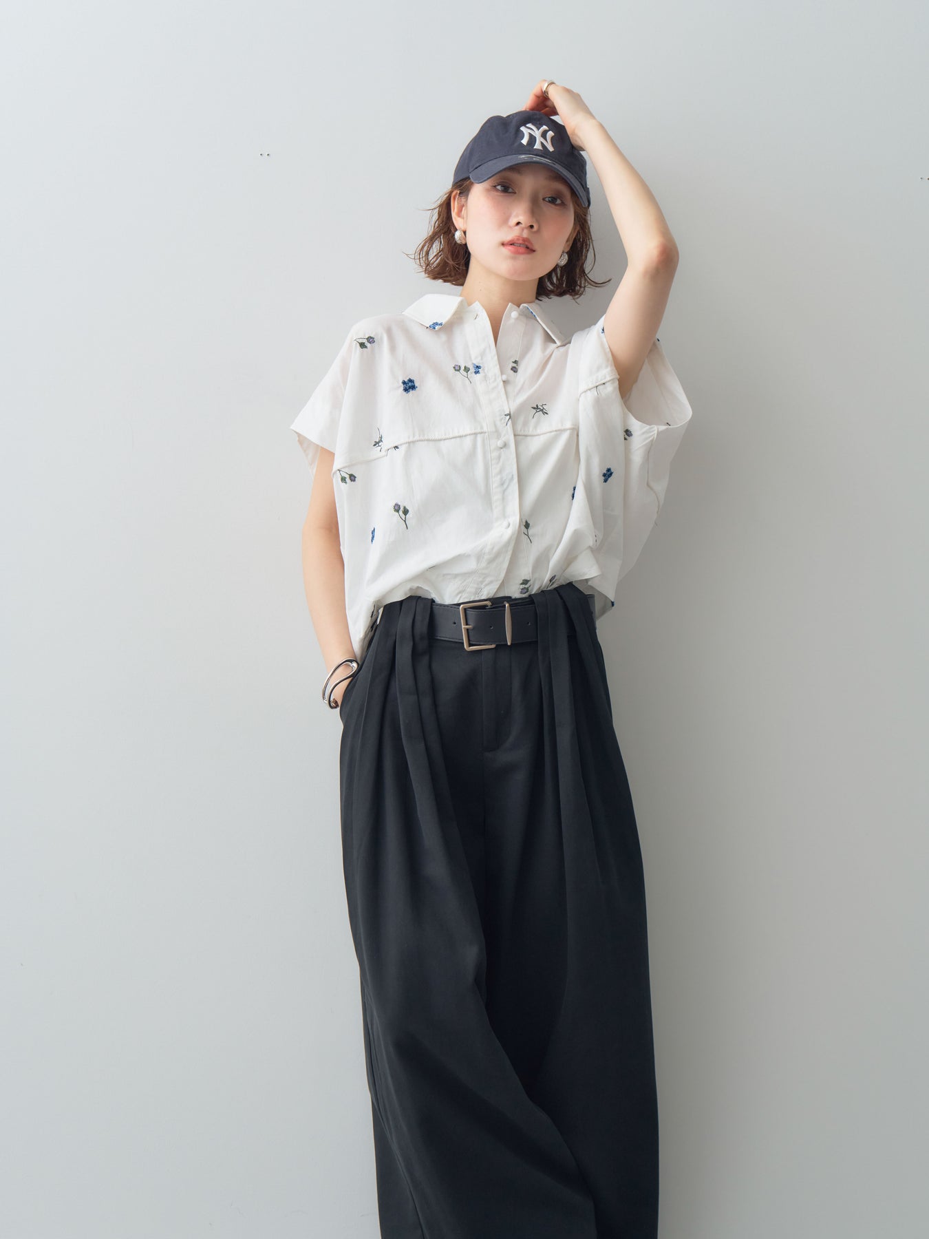 【套裝】花卉刺繡燈籠無袖襯衫+腰帶設計環扣闊腿褲(兩件套)