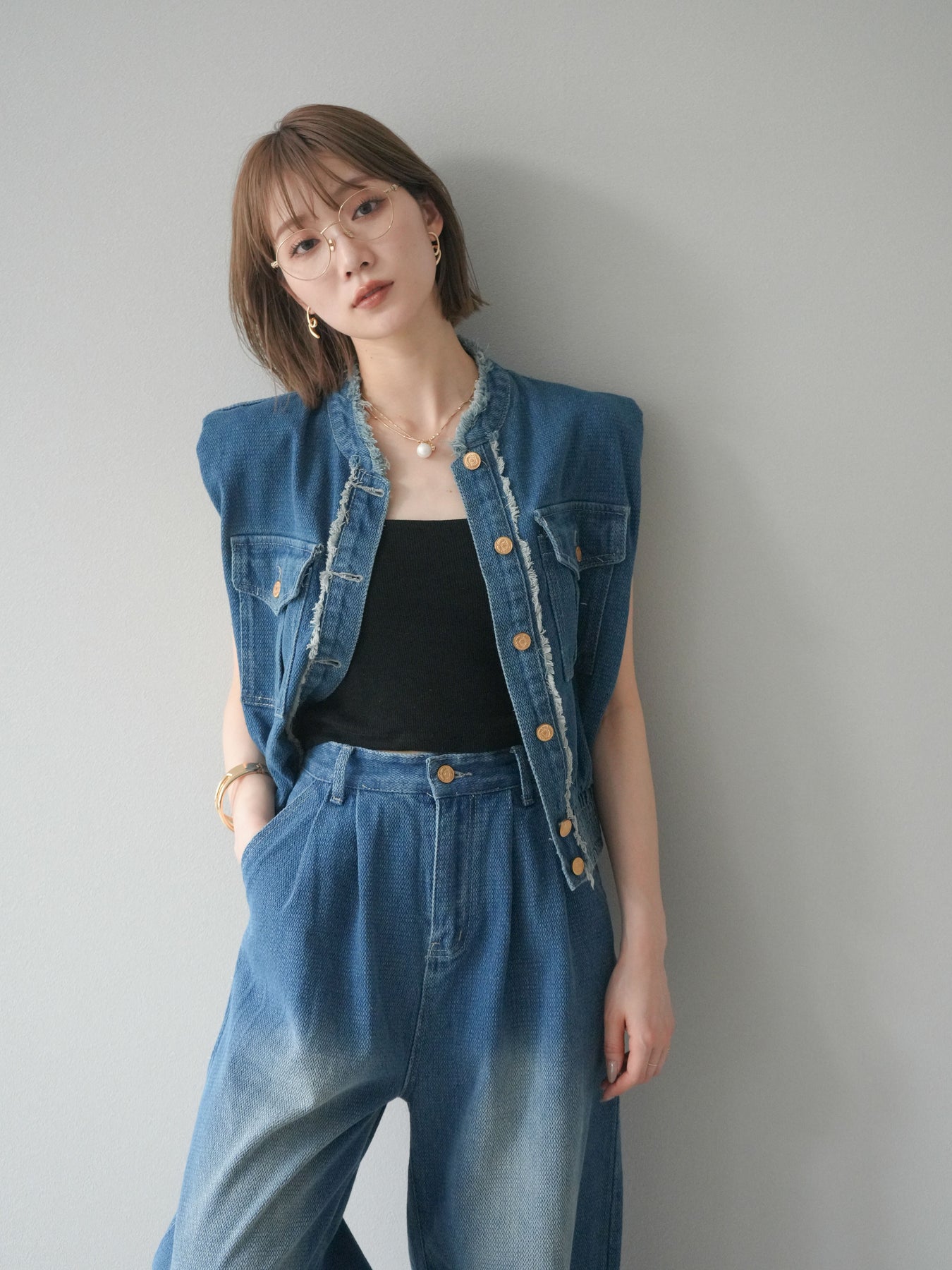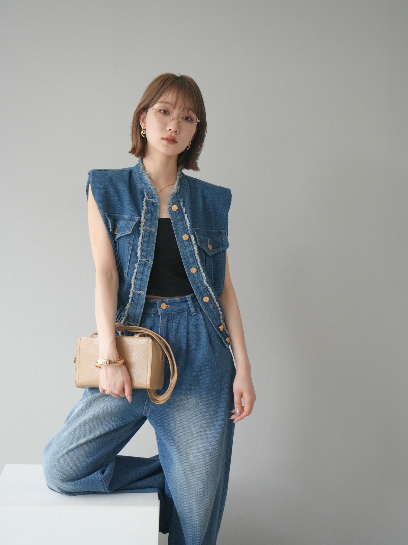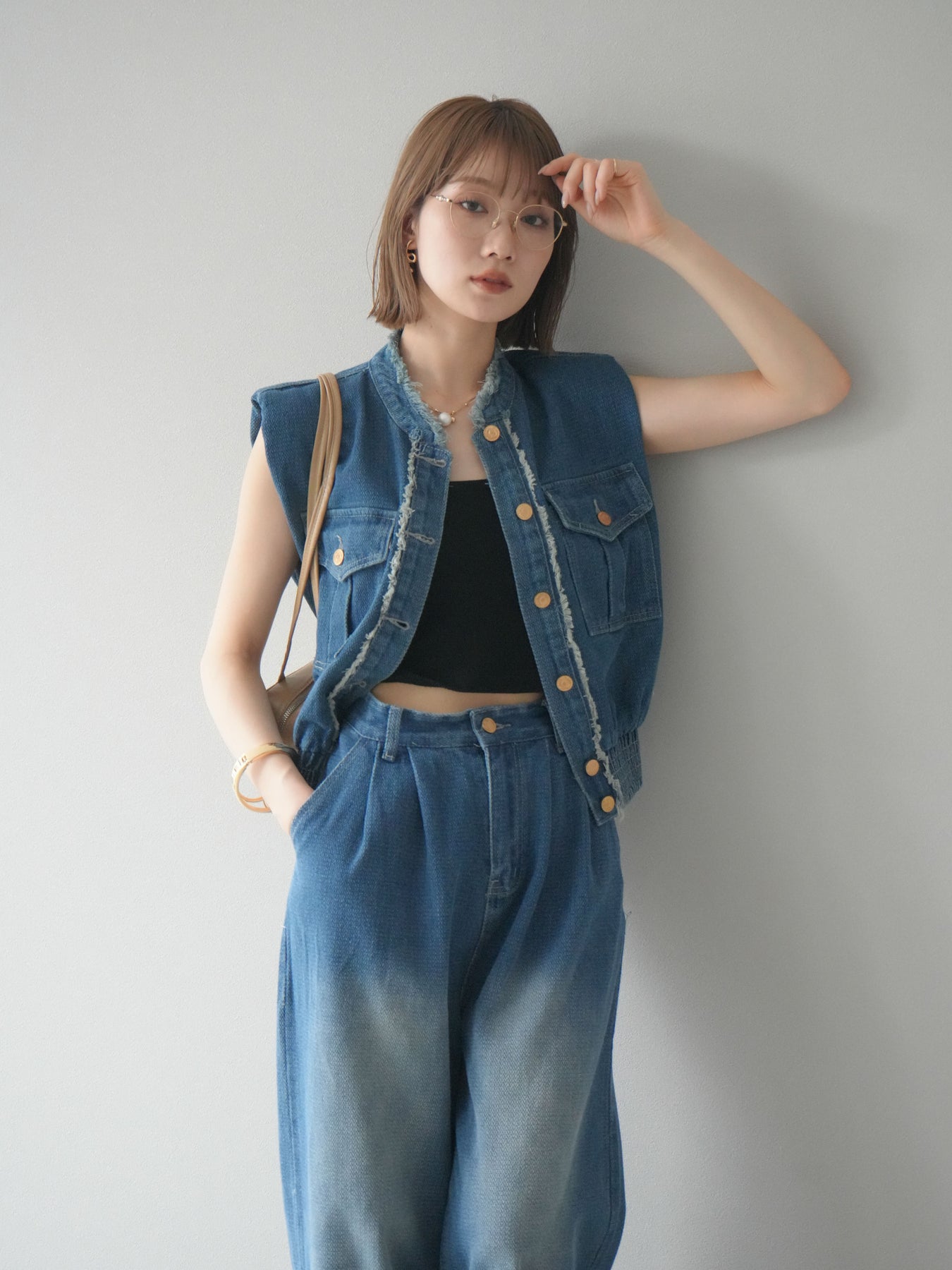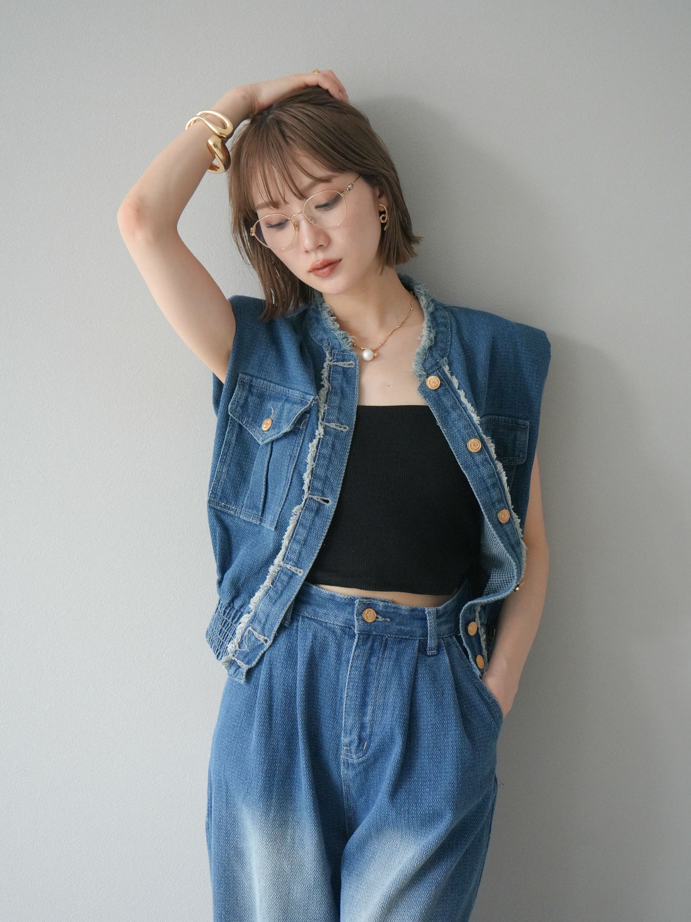 流蘇點綴的牛仔背心和褲子套裝。背心採用小巧的剪裁和褶飾,打造清晰的輪廓;褲子則採用寬鬆的廓形,打造休閒的造型。既可以成套穿著,也可以單獨穿著。打造緊跟本季潮流的牛仔風格。 *除下裝及吊帶背心(內衣)外,所有商品均為標準配置,不含內衣。