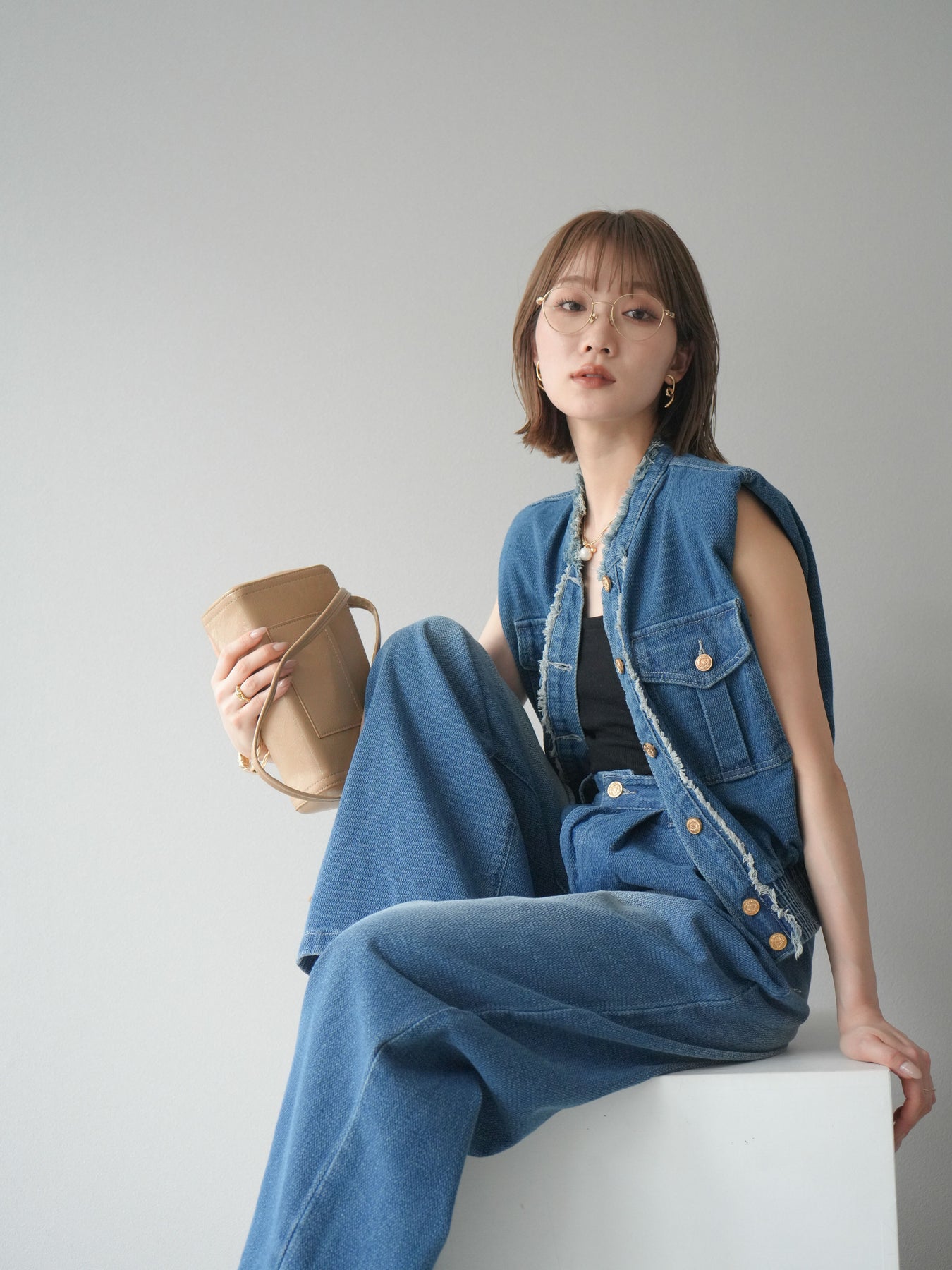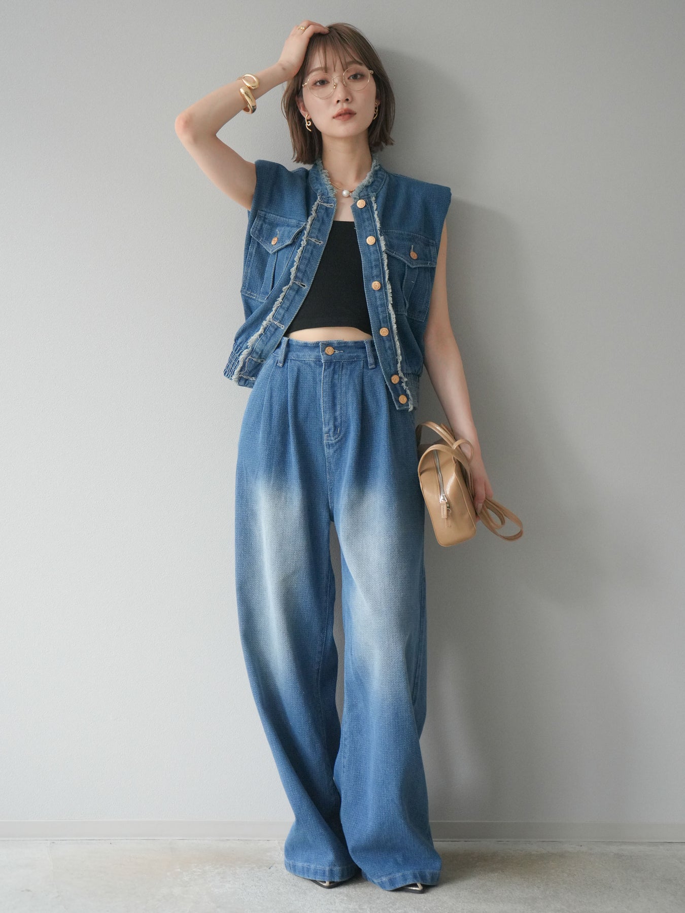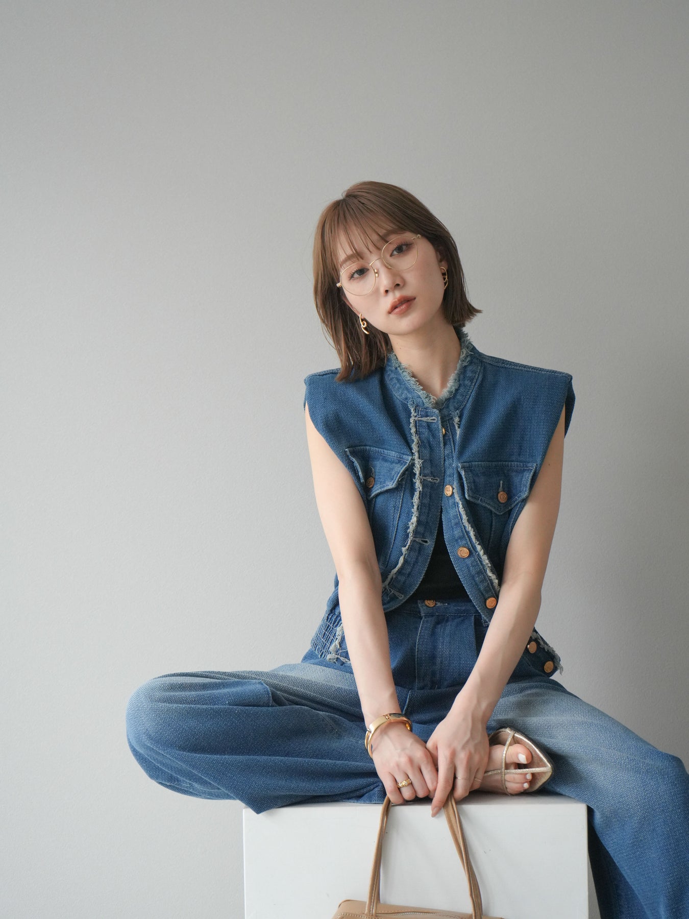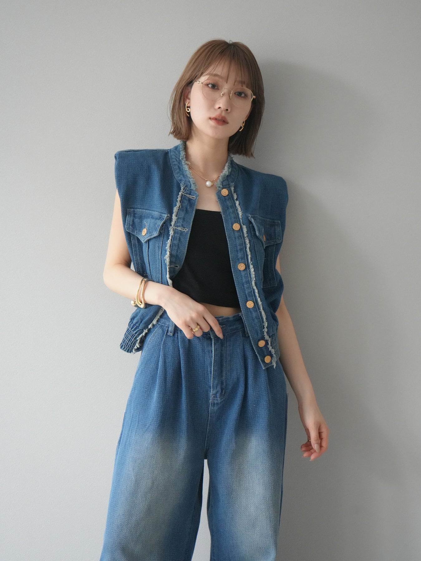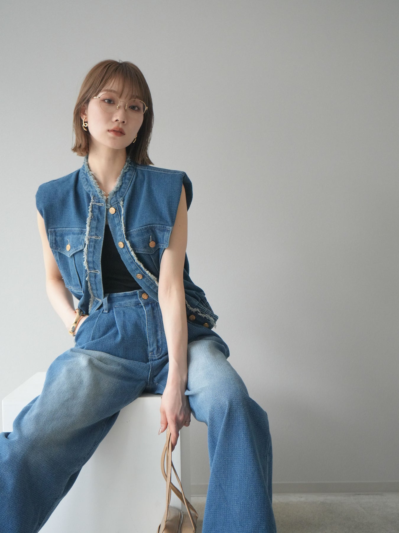 流蘇點綴的牛仔背心和褲子套裝。背心採用小巧的剪裁和褶飾,打造清晰的輪廓;褲子則採用寬鬆的廓形,打造休閒的造型。既可以成套穿著,也可以單獨穿著。打造緊跟本季潮流的牛仔風格。 *除下裝及吊帶背心(內衣)外,所有商品均為標準配置,不含內衣。
