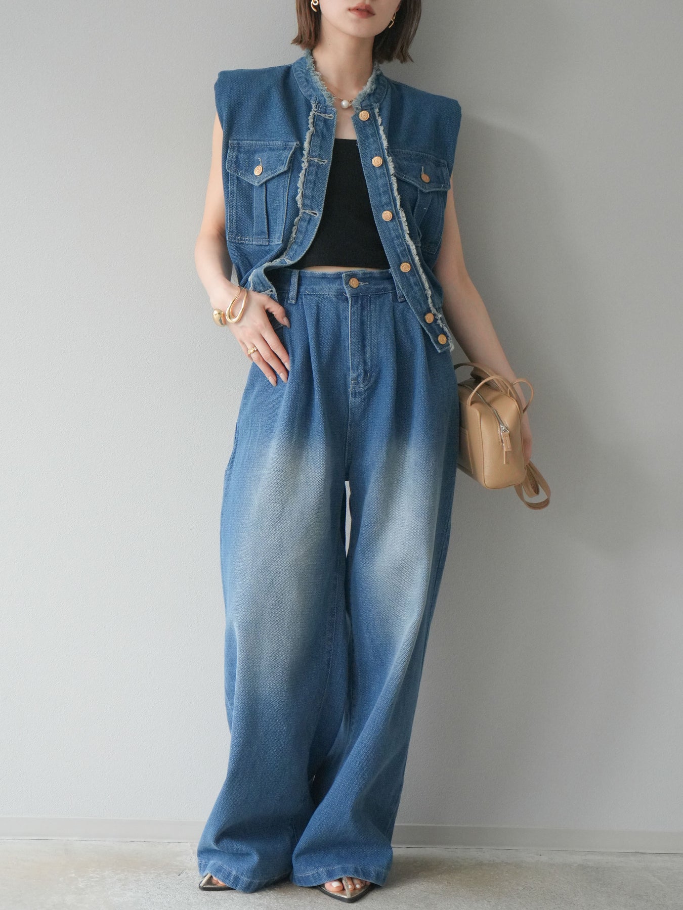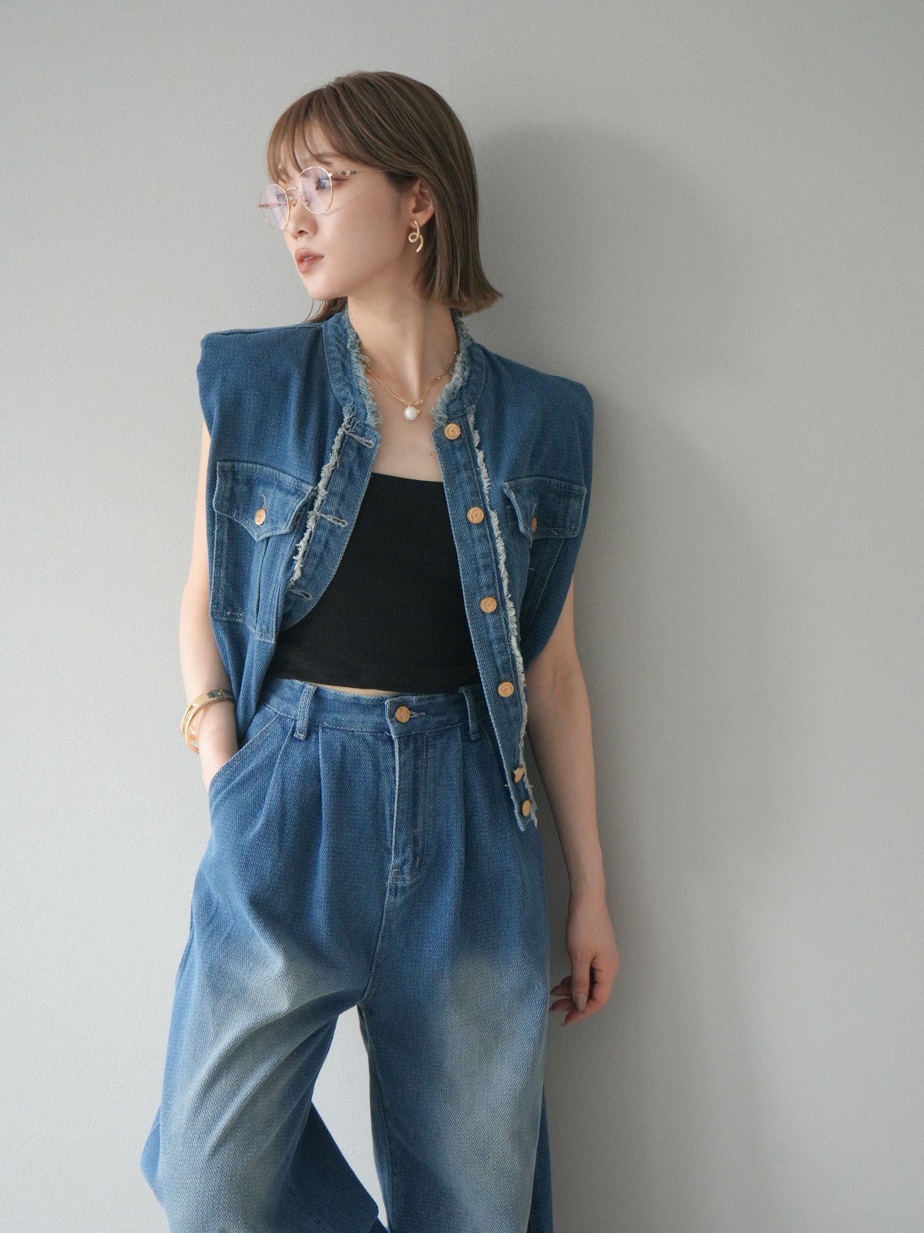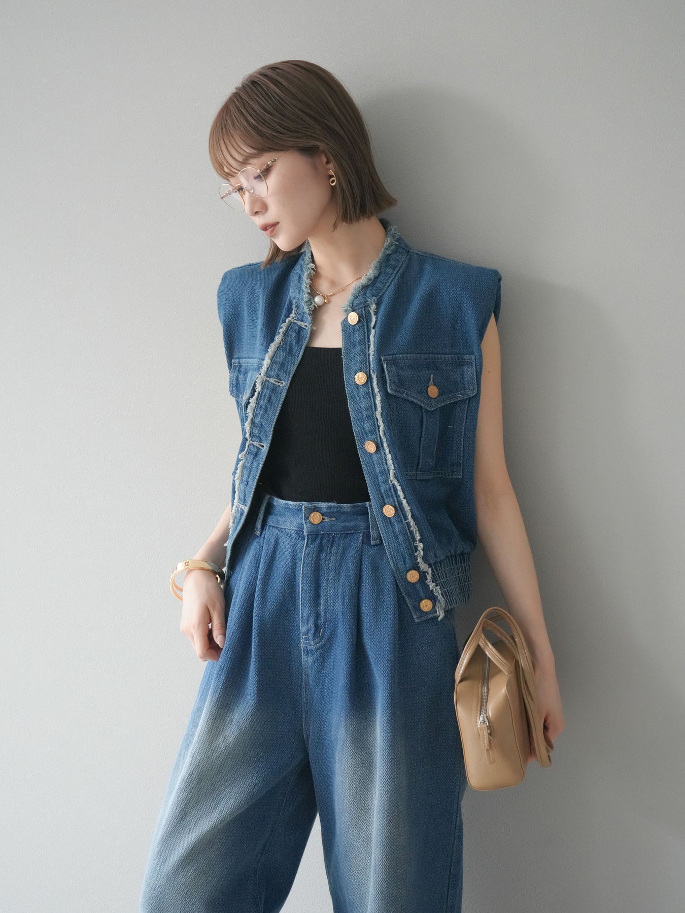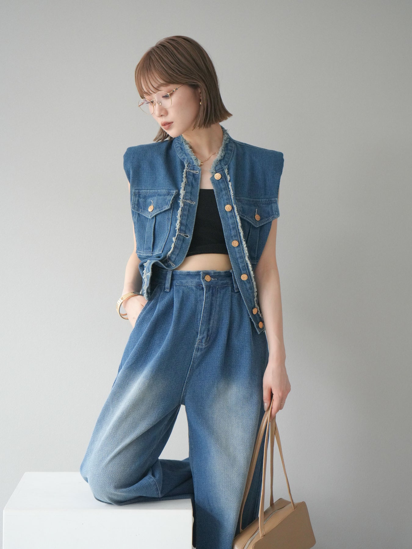 流蘇點綴的牛仔背心和褲子套裝。背心採用小巧的剪裁和褶飾,打造清晰的輪廓;褲子則採用寬鬆的廓形,打造休閒的造型。既可以成套穿著,也可以單獨穿著。打造緊跟本季潮流的牛仔風格。 *除下裝及吊帶背心(內衣)外,所有商品均為標準配置,不含內衣。