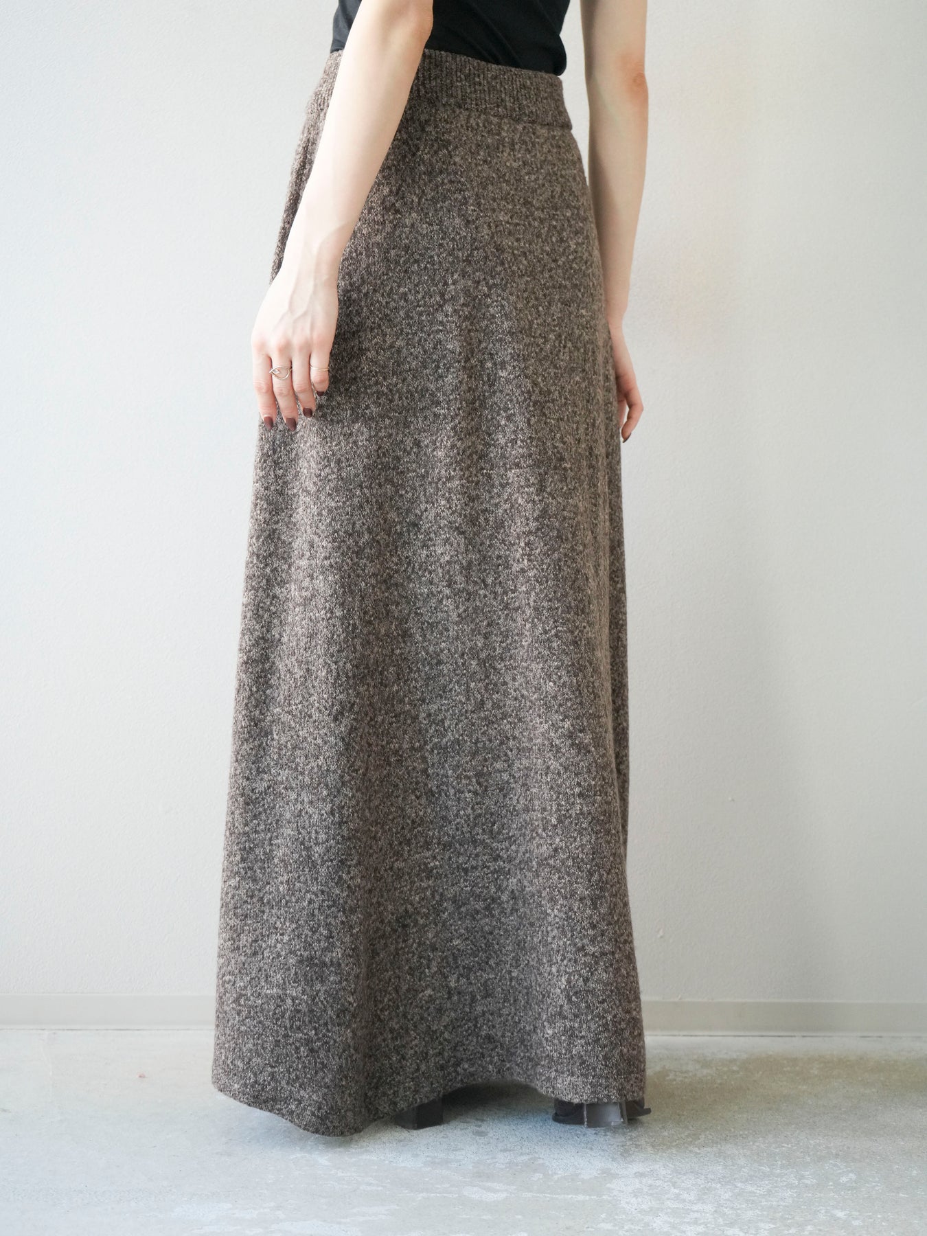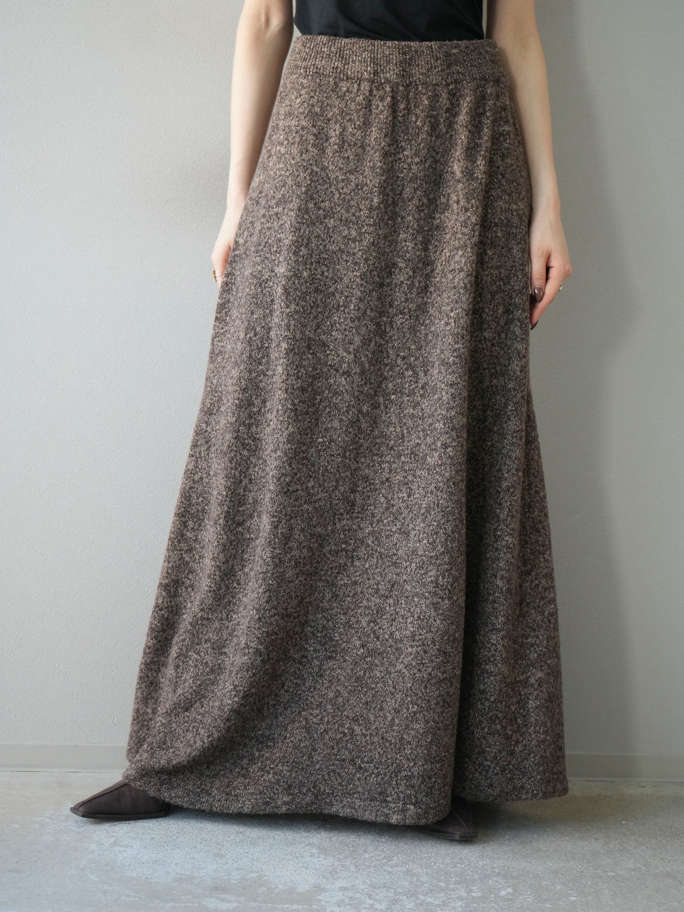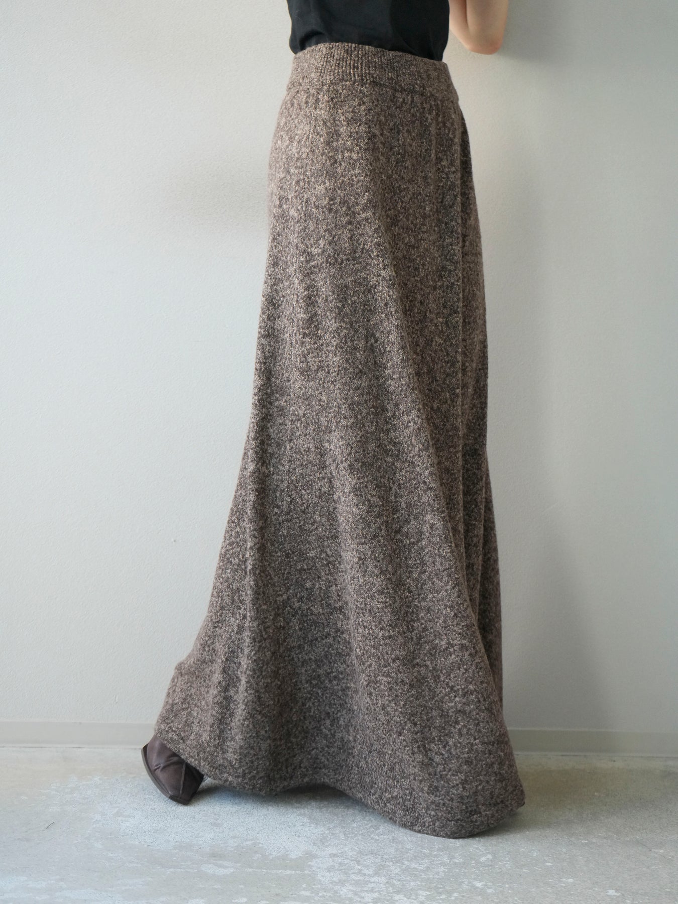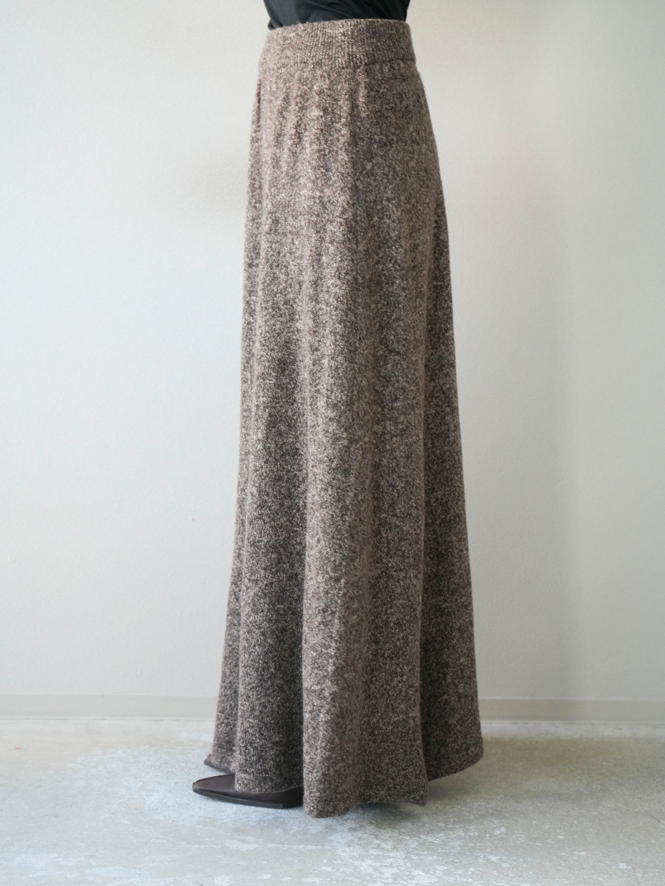 表情豊かなミックスヤーンを使用したニットスカート。歩くたびに揺れる柔らかな素材感と程よいフレアシルエットが、女性らしい印象を引き立てます。ウエストはゴム仕様で快適な穿き心地を叶えつつ、リラックス感のある着用感が魅力。シンプルなトップスを合わせるだけでコーディネートが完成し、同素材のトップスやベストと合わせてセットアップ風に着こなすのもおすすめです。シーズンムードを高めてくれる、デイリーに取り入れやすい一着です。