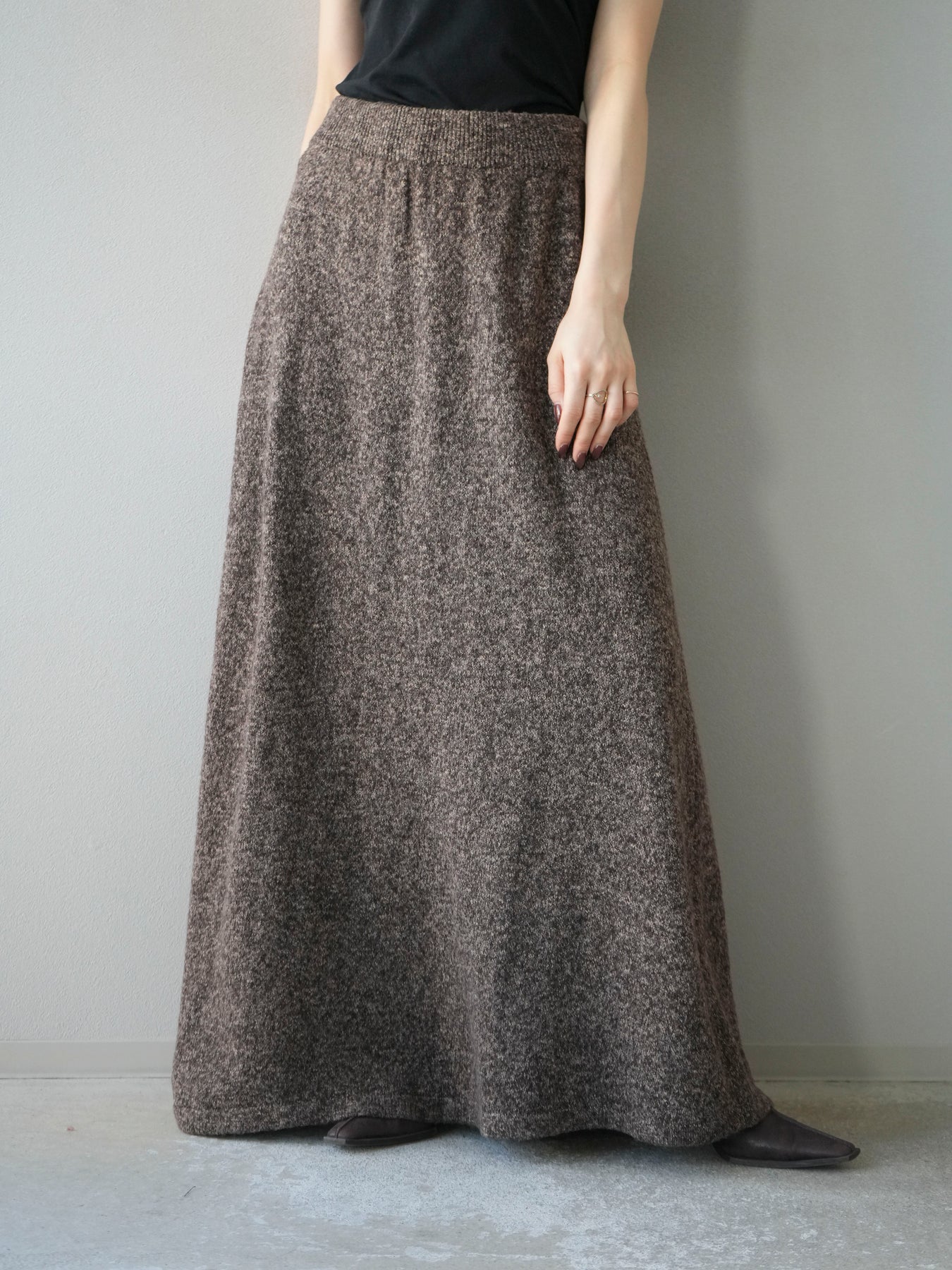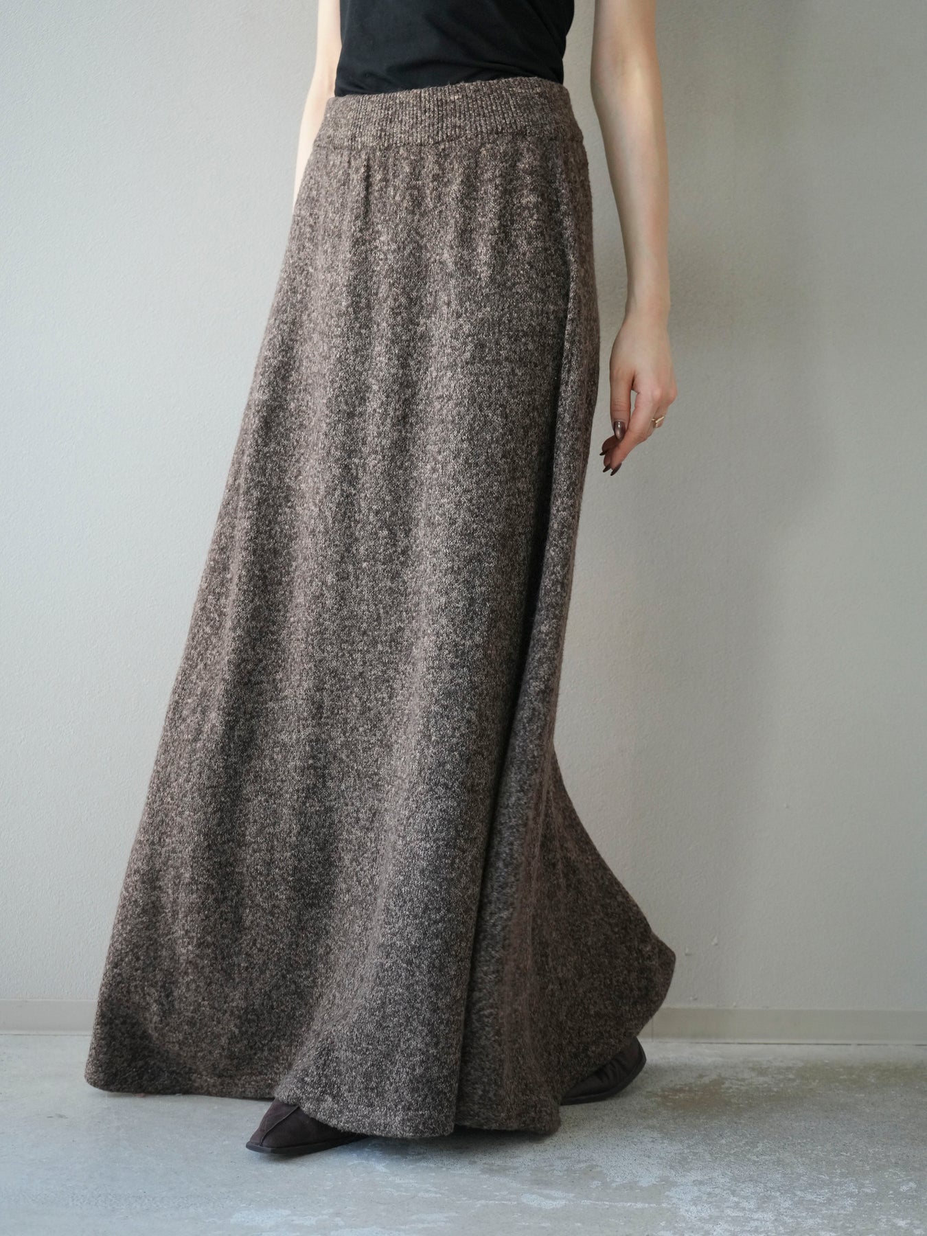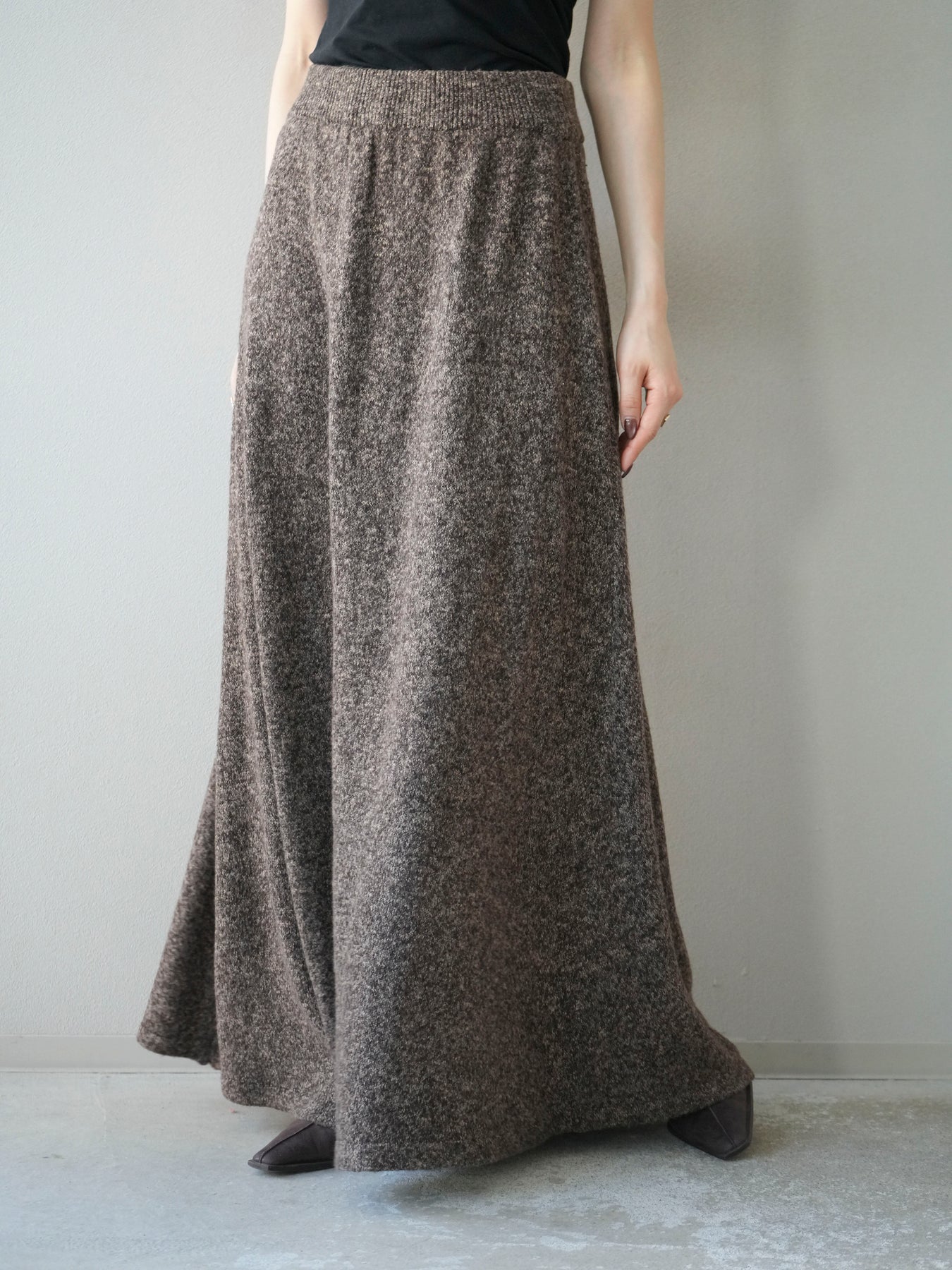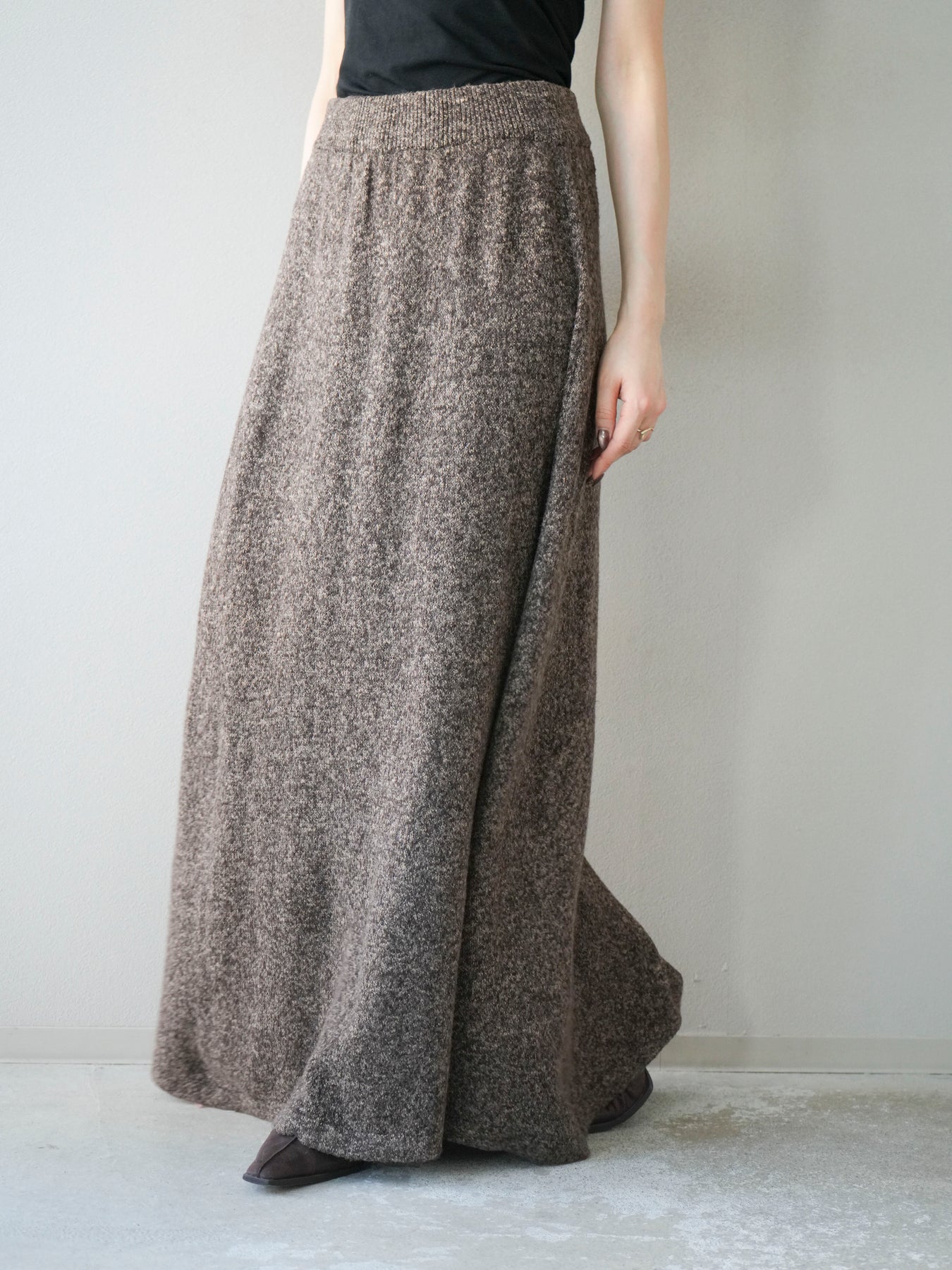 表情豊かなミックスヤーンを使用したニットスカート。歩くたびに揺れる柔らかな素材感と程よいフレアシルエットが、女性らしい印象を引き立てます。ウエストはゴム仕様で快適な穿き心地を叶えつつ、リラックス感のある着用感が魅力。シンプルなトップスを合わせるだけでコーディネートが完成し、同素材のトップスやベストと合わせてセットアップ風に着こなすのもおすすめです。シーズンムードを高めてくれる、デイリーに取り入れやすい一着です。