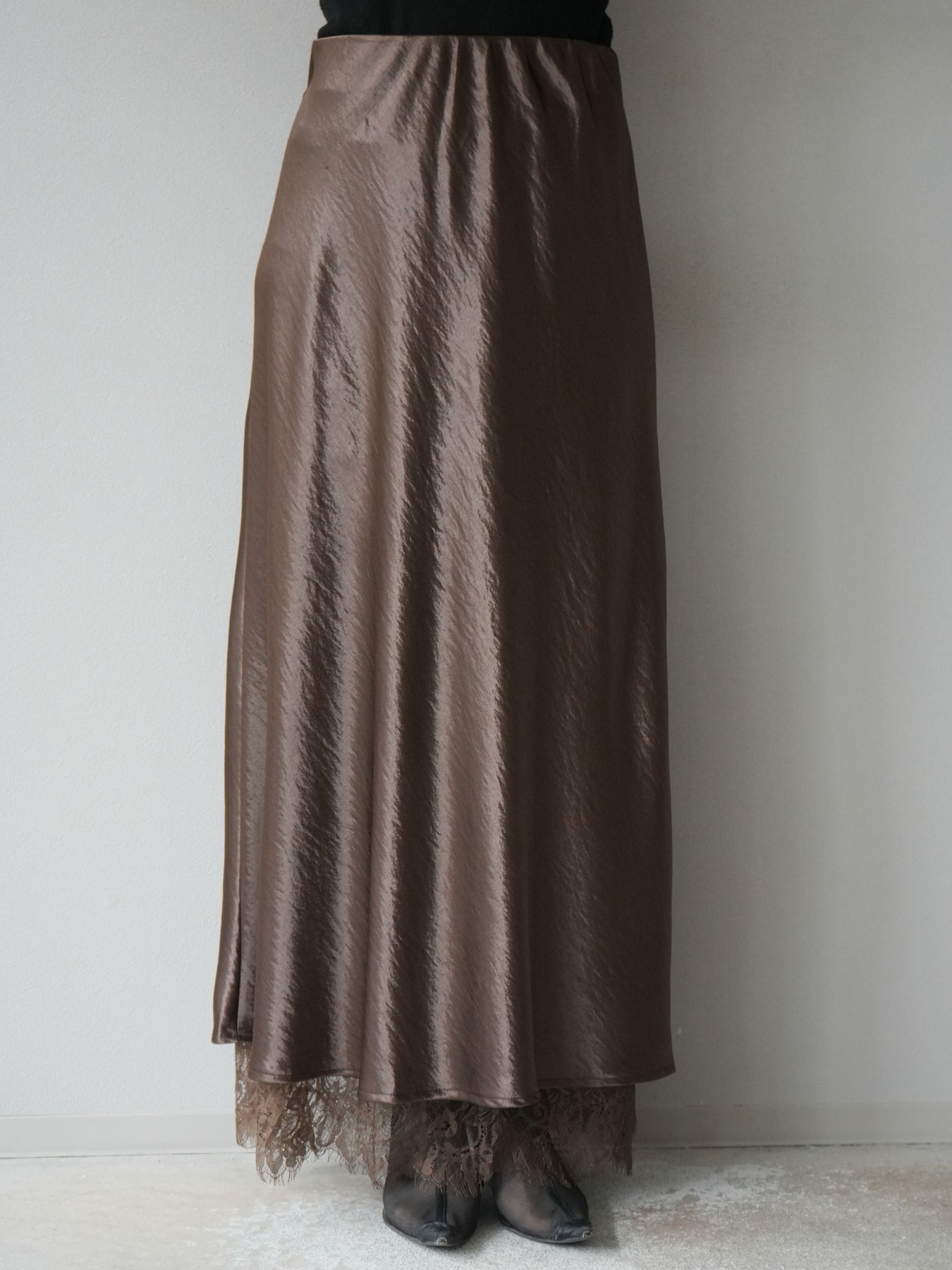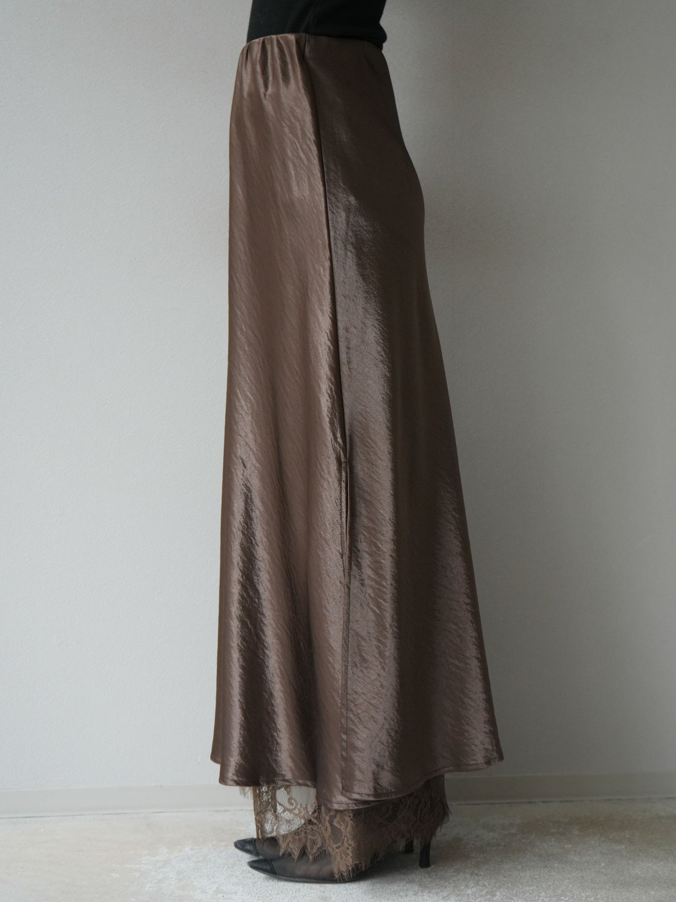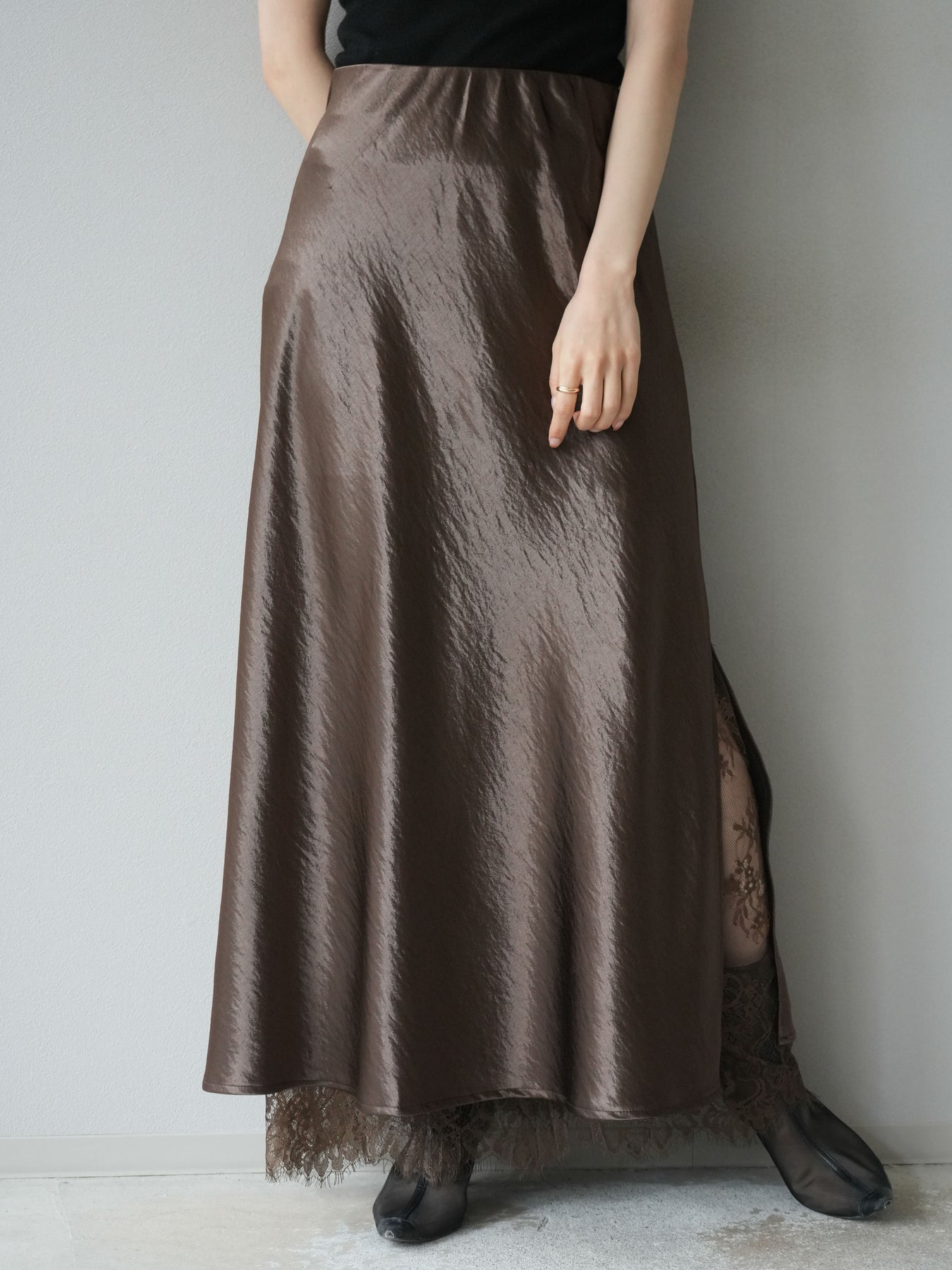 上品な光沢感のあるサテン素材に、裾のレースをあしらったナロースカート。動くたびに揺れるレースが女性らしさを引き立て、エレガントな印象を演出します。程よく身体に沿うシルエットが美しいラインを描き、スタイルアップ効果も◎。シンプルなトップスを合わせるだけで上品にまとまり、カジュアルにもきれいめにも着回せる万能アイテムです。