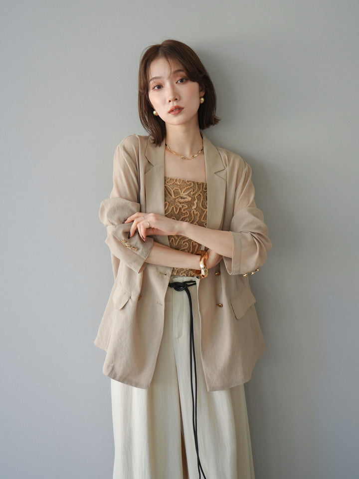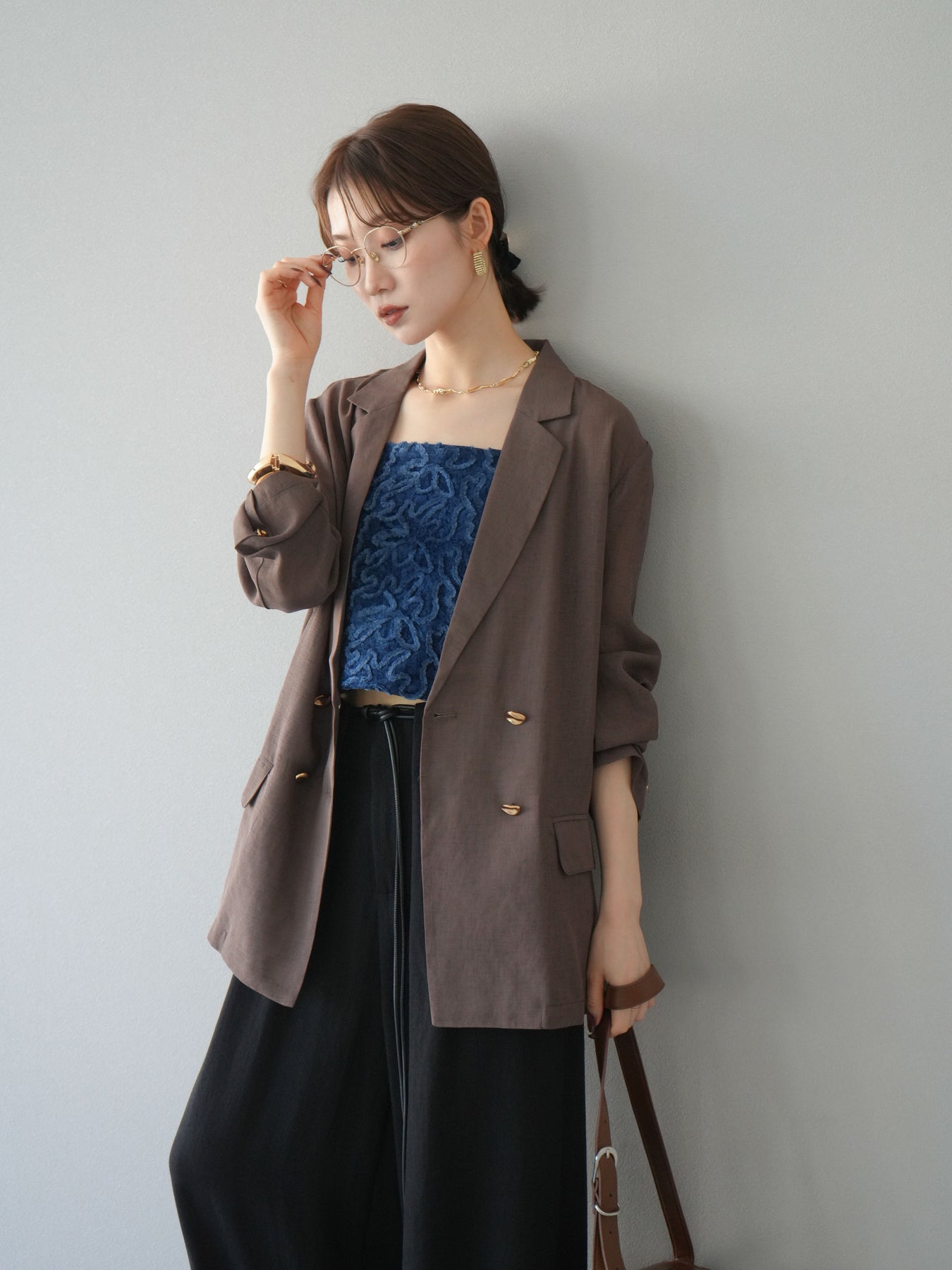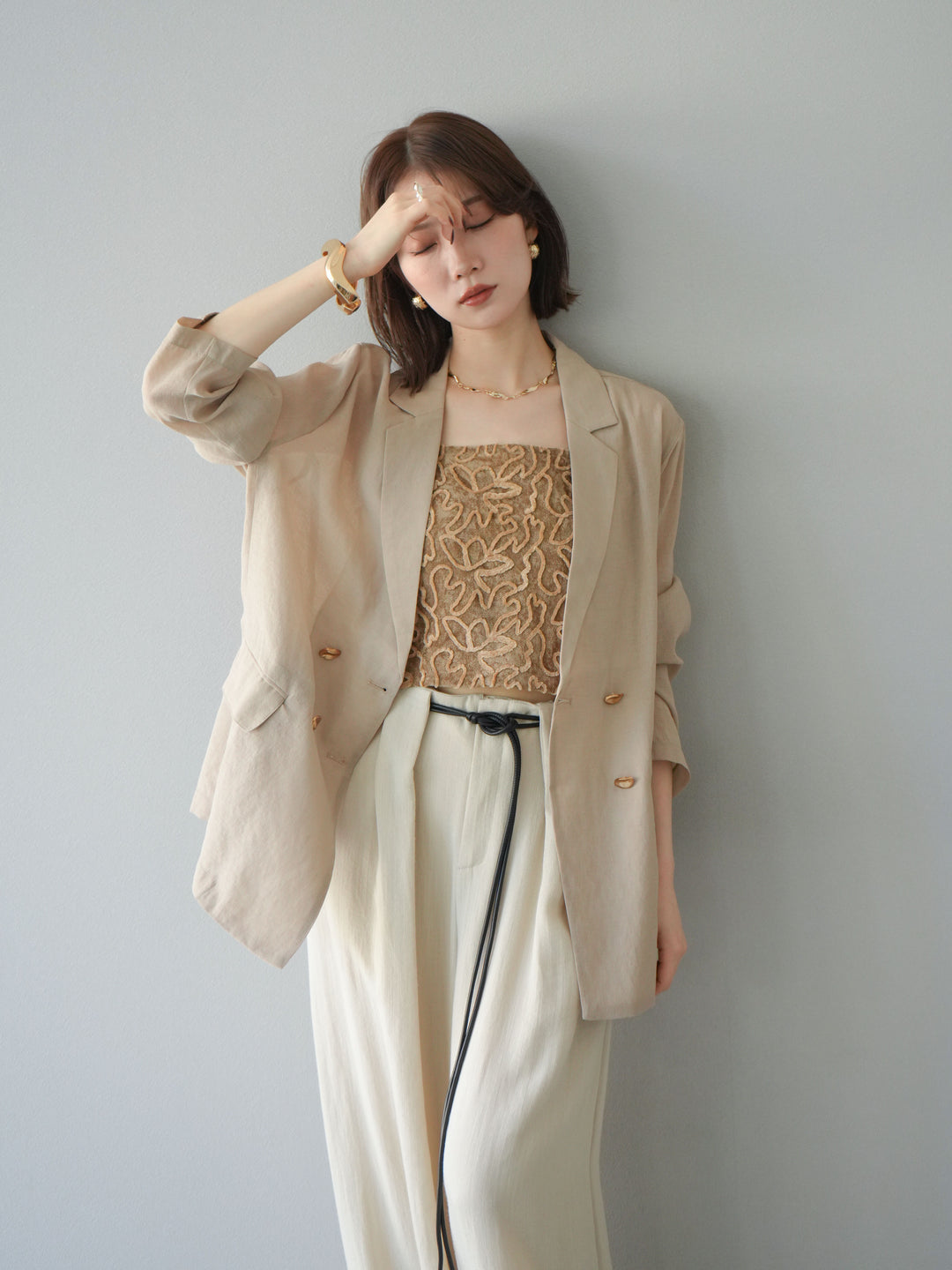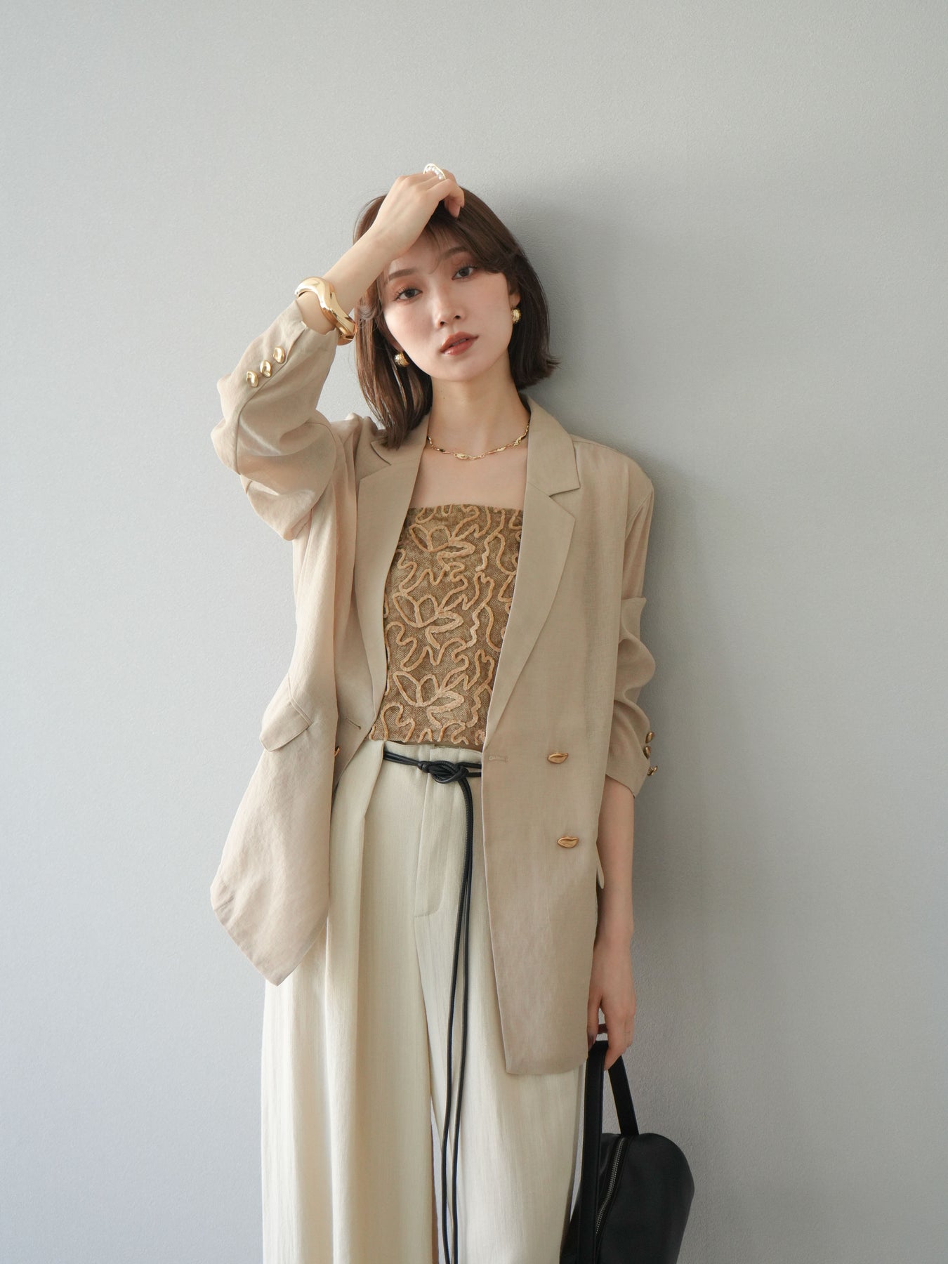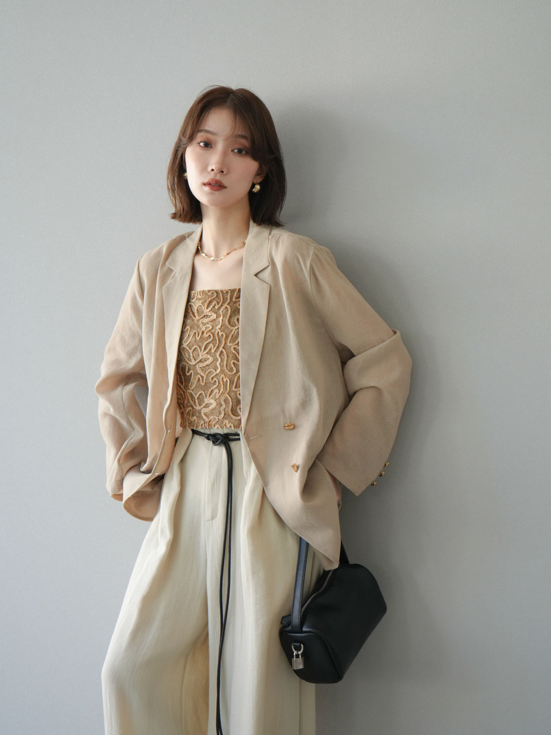 輕盈的透視夾克,散發著古典氣息。適度的透明度營造出季節感,輕鬆隨興的穿搭也能完美呈現造型。金色金屬紐扣點綴其間,更添優雅幹練的氣質。適度及臀的長度,寬鬆的輪廓巧妙地遮蓋住身材,亞麻般的天然材質帶來舒適的穿著體驗。它不僅適合搭配洋裝、半身裙,也適合搭配牛仔褲和寬褲。無論工作或休閒,都能輕鬆駕馭。 ※除下裝、吊帶背心(內衣)以外的商品均為標準品,不含內衣。