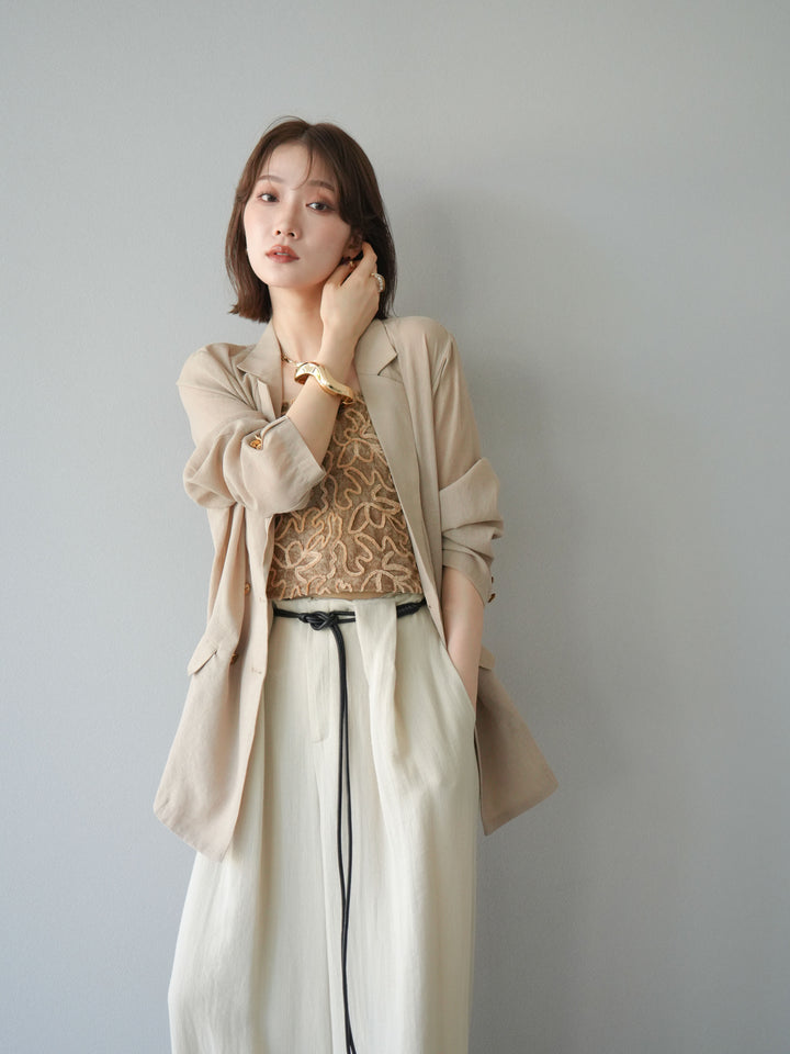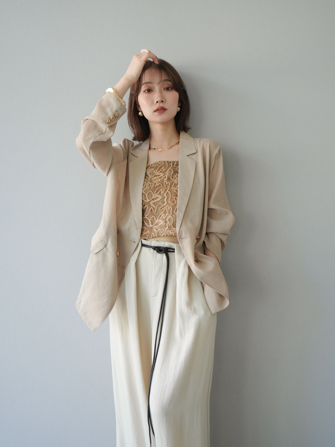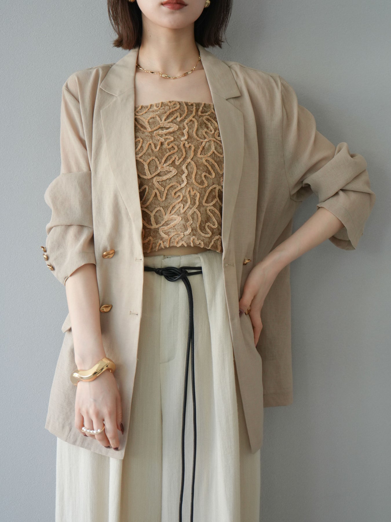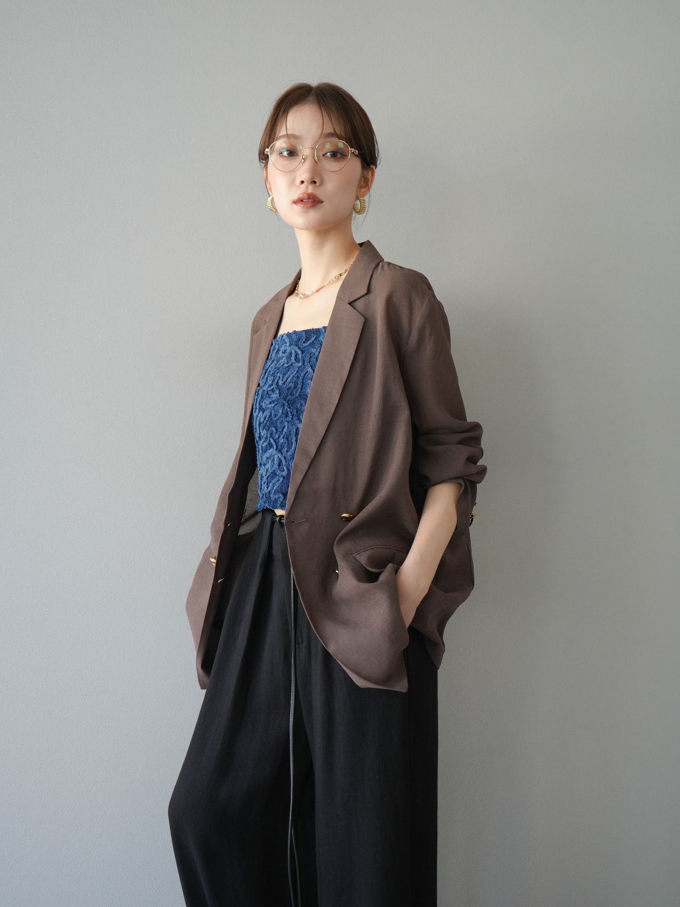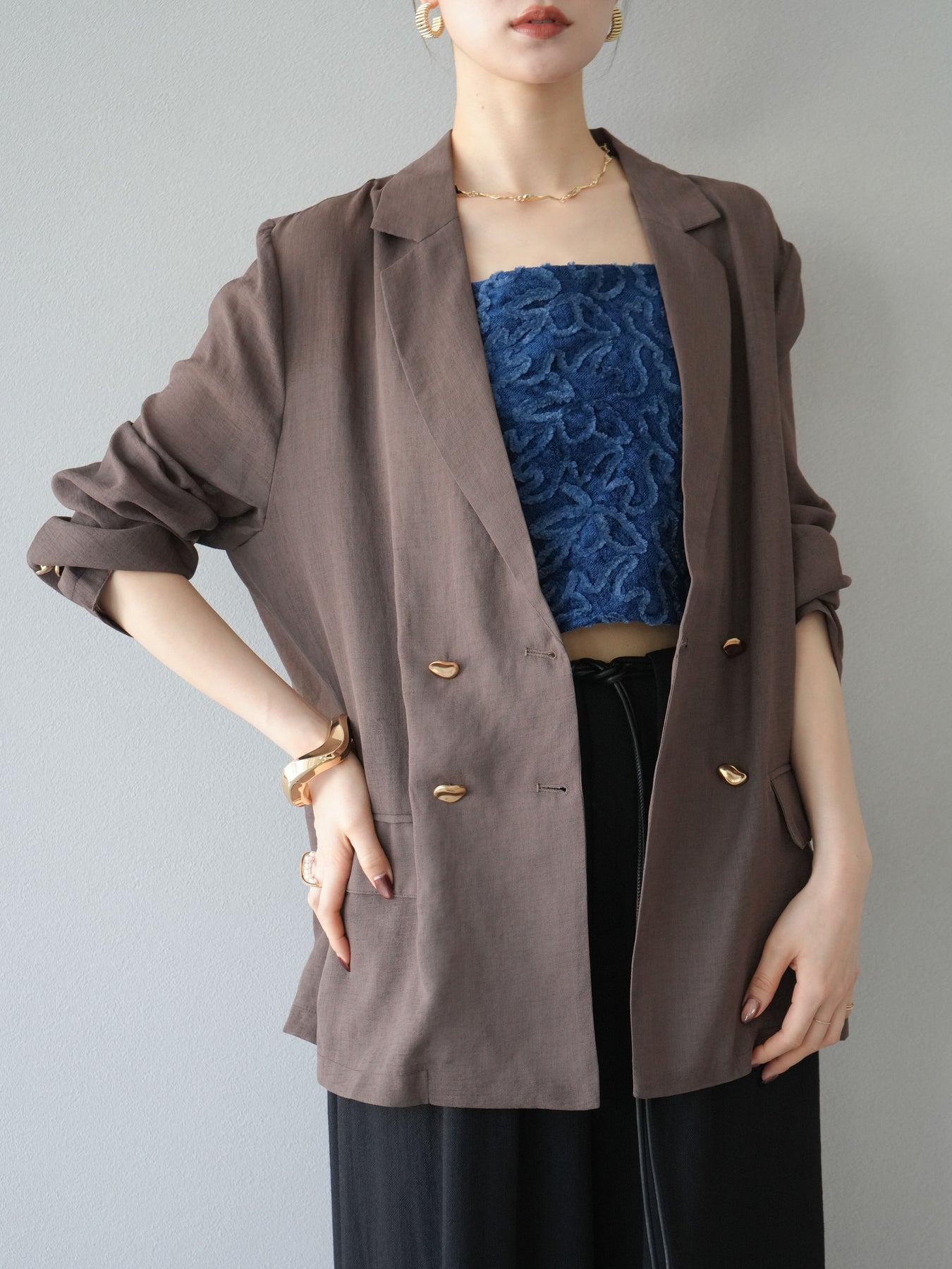 輕盈的透視夾克,散發著古典氣息。適度的透明度營造出季節感,輕鬆隨興的穿搭也能完美呈現造型。金色金屬紐扣點綴其間,更添優雅幹練的氣質。適度及臀的長度,寬鬆的輪廓巧妙地遮蓋住身材,亞麻般的天然材質帶來舒適的穿著體驗。它不僅適合搭配洋裝、半身裙,也適合搭配牛仔褲和寬褲。無論工作或休閒,都能輕鬆駕馭。 ※除下裝、吊帶背心(內衣)以外的商品均為標準品,不含內衣。