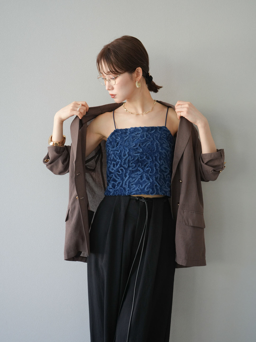 這款華麗的透明天鵝絨吊帶背心,飾有立體花朵圖案,令人眼前一亮。拉絨滾邊花朵圖案優雅摩登,適度的透明度則增添一絲輕盈感。簡潔的長度使其與高腰下裝完美搭配。纖細的肩帶讓肩頸線條更俐落,更添女性魅力。我們也推薦搭配同材質的裙子,使其成為特別外出或活動的完美選擇。 ※除下裝、吊帶背心(內衣)以外的商品均為標準品,不含內衣。