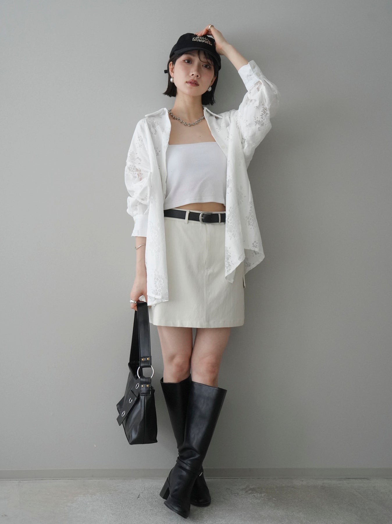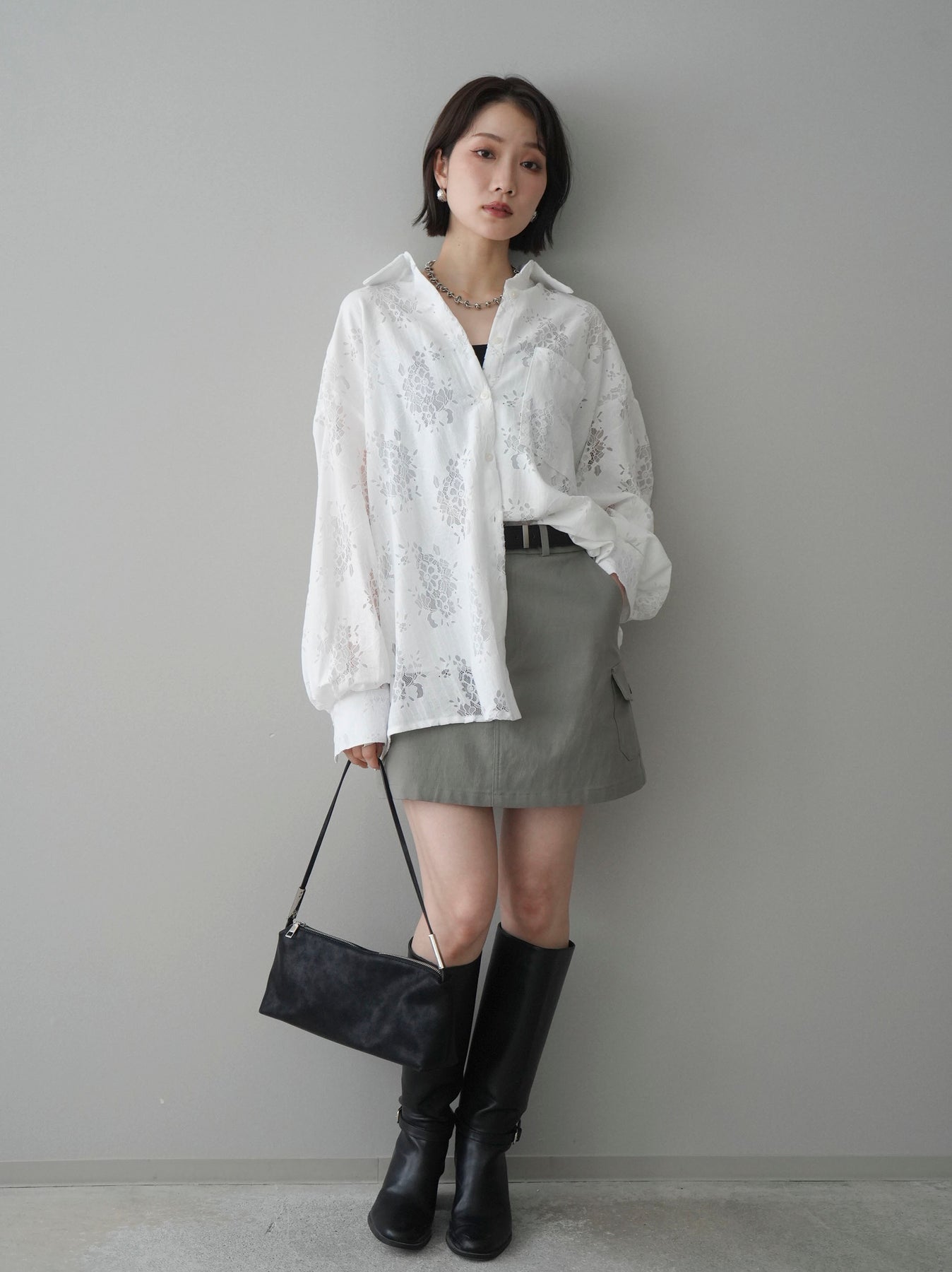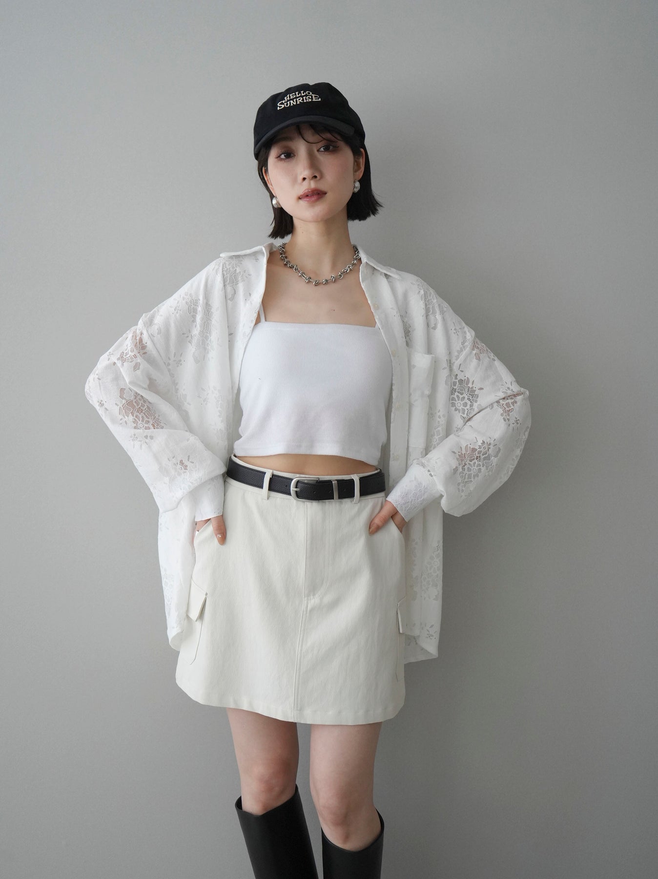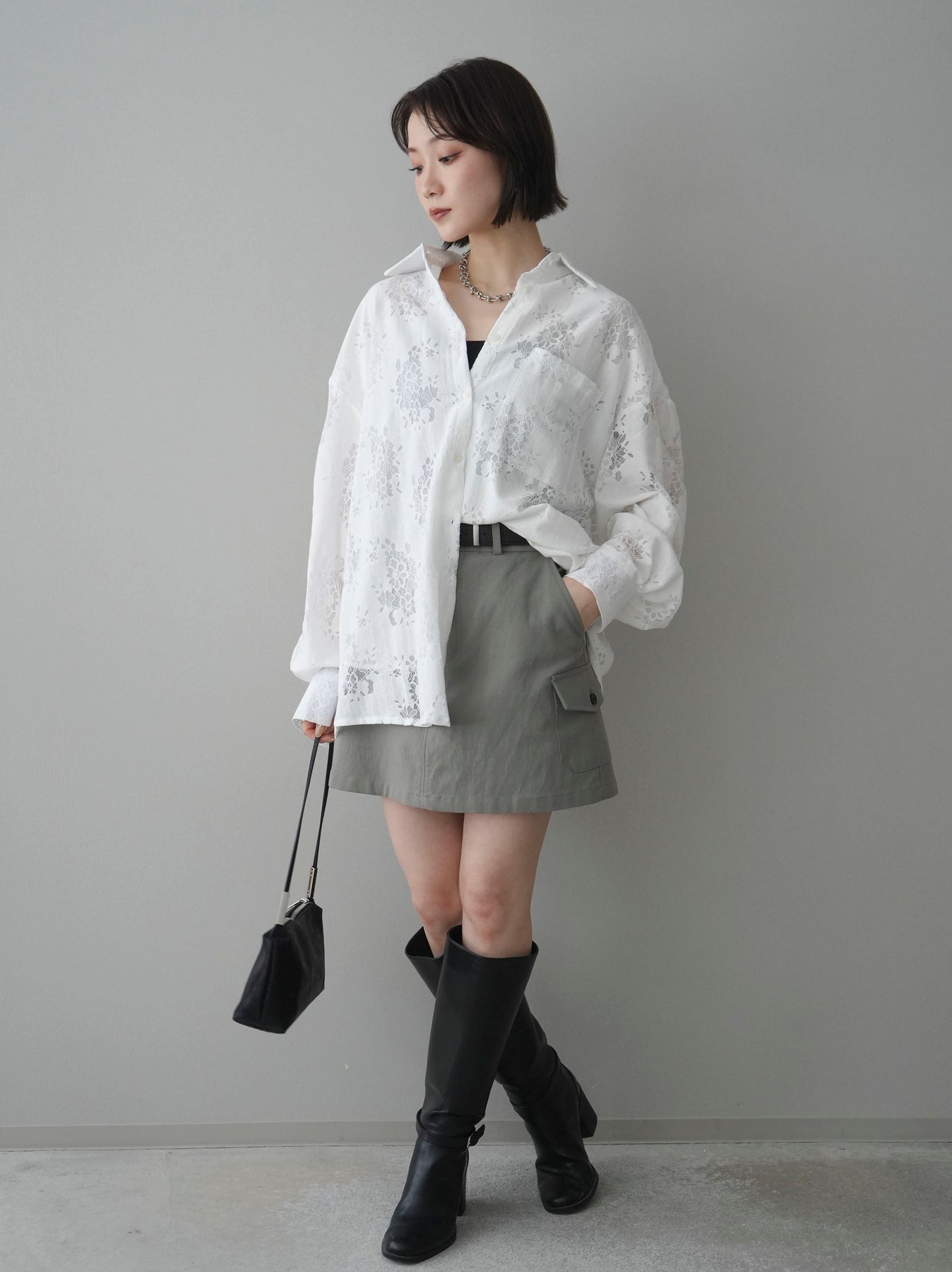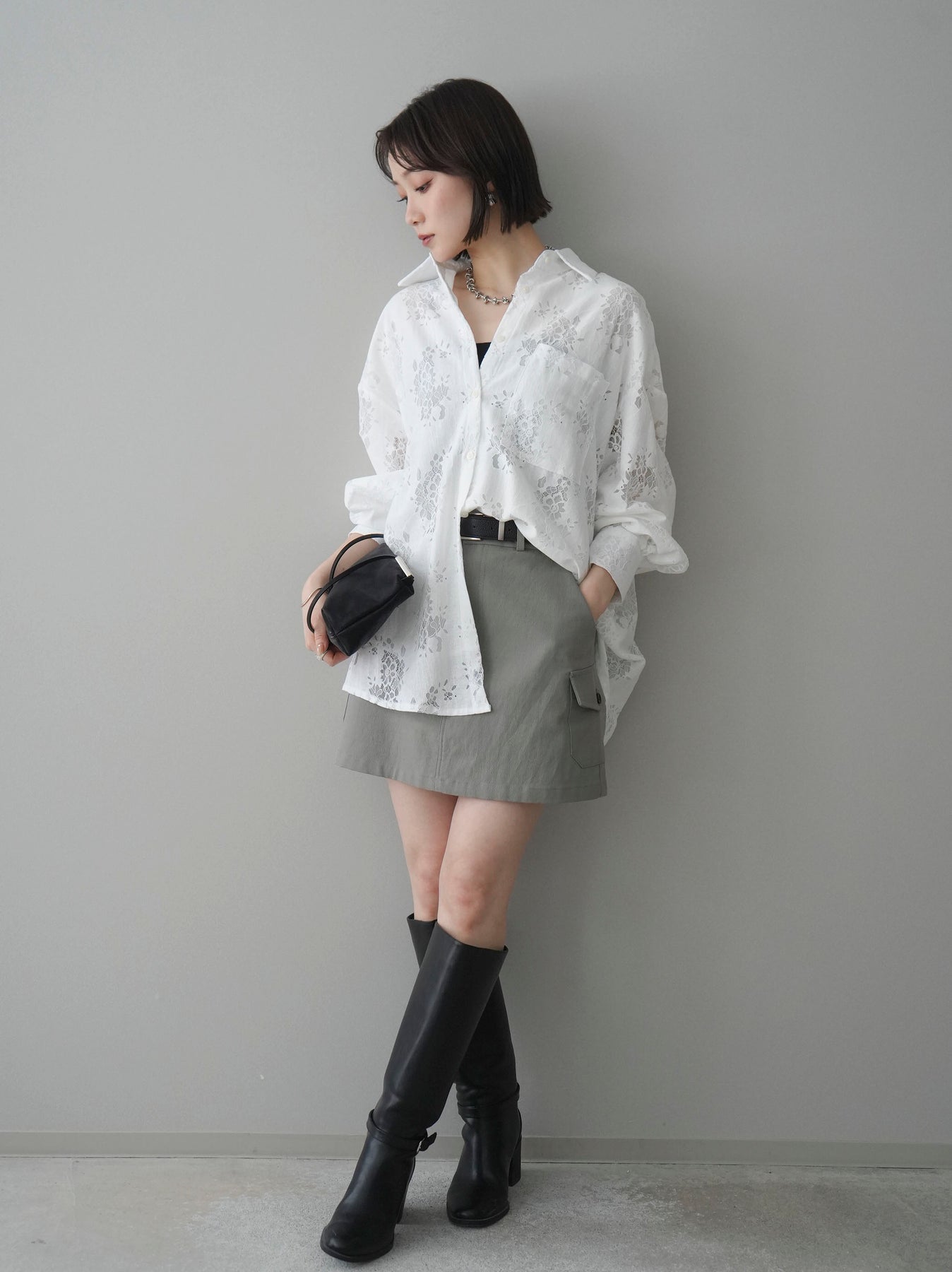 【套裝】提花蕾絲罩衫+繫帶工裝迷你裙(兩件套)
